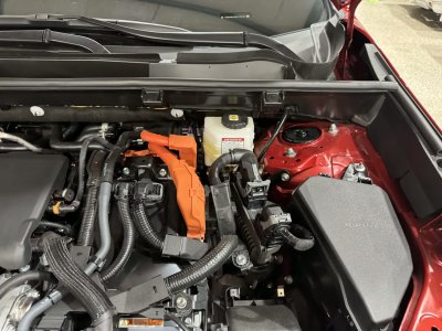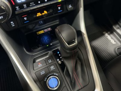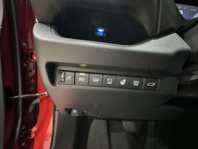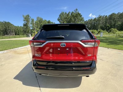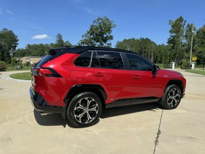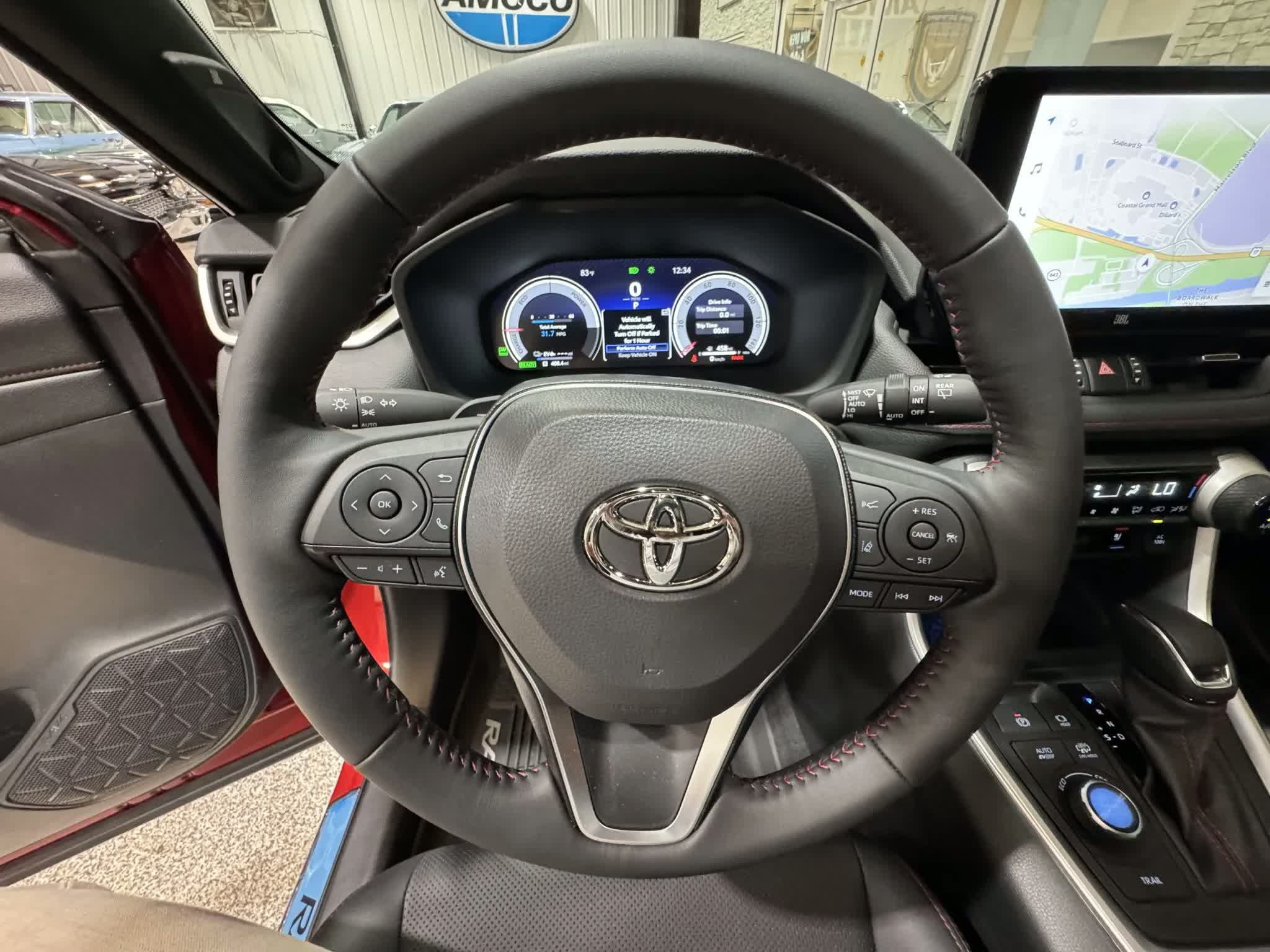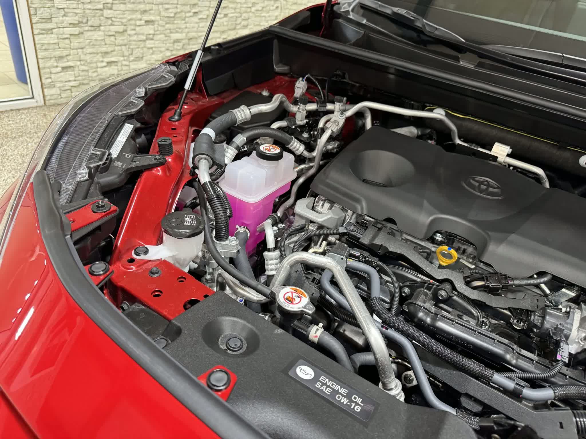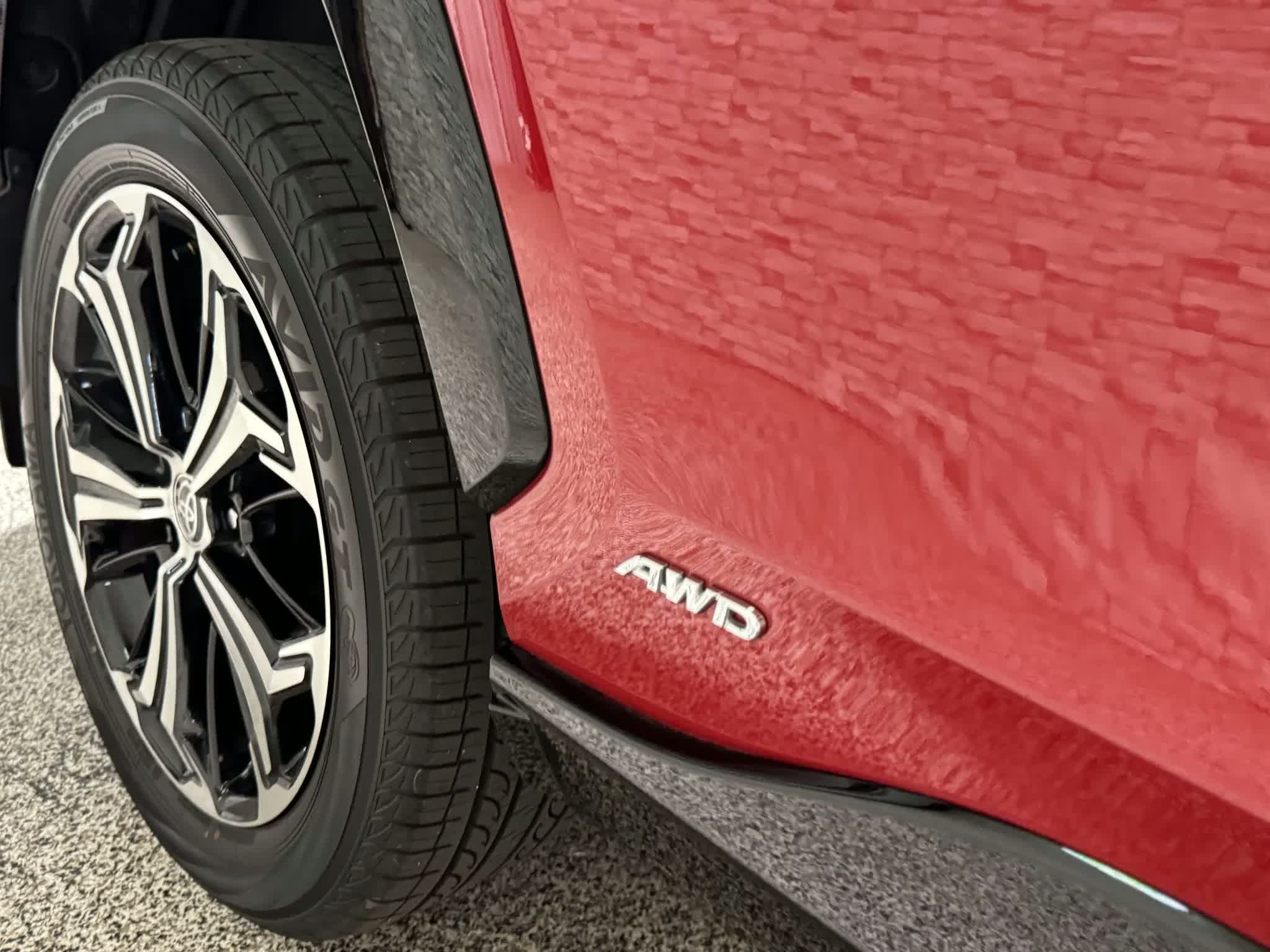 This 2024 Toyota RAV4 Prime XSE is a plug-in hybrid that has 408 miles and is finished in Supersonic Red and black over black SofTex upholstery. Power is provided by a 2.5-liter inline-four and two electric motors with an 18-kWh lithium-ion battery linked with a continuously variable transaxle and an all-wheel-drive system. Equipment includes the Premium and Weather packages, 19″ alloy wheels, a panoramic sunroof, a 360-degree camera system, heated and ventilated front seats, heated rear seats, Dynamic Radar Cruise Control, and an 11-speaker JBL sound system. Acquired by the selling dealer in 2024. The vehicle is finished in Supersonic Red with a black roof, mirror caps, and lower cladding. Exterior details include LED headlights and taillights, a panoramic sunroof, roof rails, mudguards, a rear spoiler, a 360-degree camera system, and a power-operated liftgate. The 19″ alloy wheels are mounted with Yokohama AVID GT tires. Braking is provided by four-wheel ventilated antilock discs with a regenerative braking system.