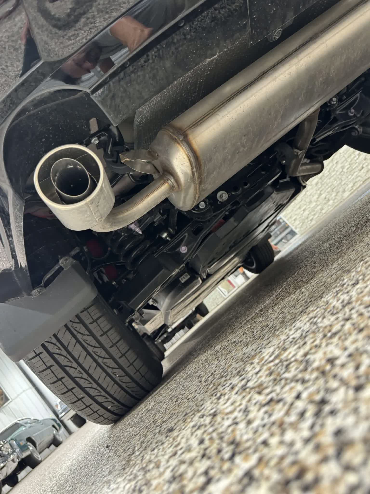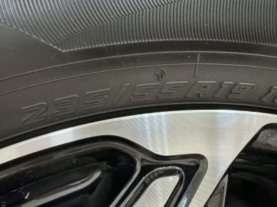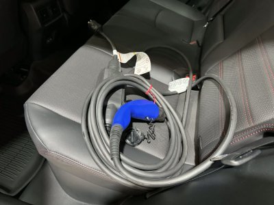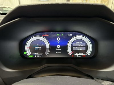 The heated and ventilated power-adjustable front seats and heated rear outboard seats are upholstered in black SofTex with red accents and stitching. Amenities include a rearview camera mirror, a wireless charger, an 11-speaker JBL sound system, and a head-up display. The infotainment system is displayed via a 10.5″ touchscreen and has wireless Apple CarPlay and Android Auto. The heated multifunction steering wheel frames a 12.3″ digital instrument cluster with a hybrid system indicator and vehicle range readout. The car is equipped with driving aids such as Dynamic Radar Cruise Control, a Pre-Collision System, and blind-spot monitoring. The odometer indicates 410 miles.