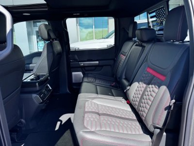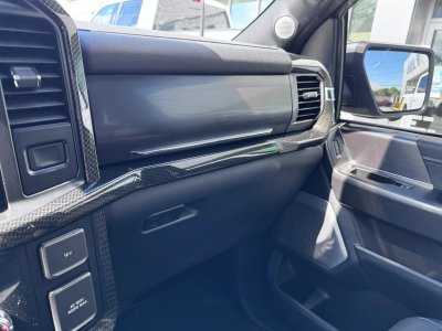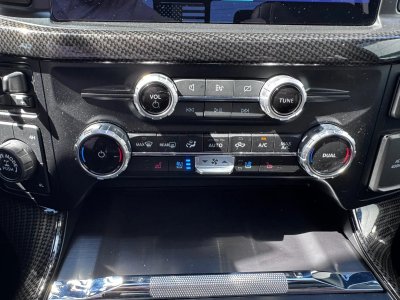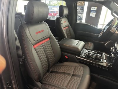 It is powered by a supercharged 5.0-liter V8 mated to a ten-speed automatic transmission and a dual-range transfer case and finished in Carbonized Gray Metallic with black stripes over black leather upholstery. It also features a Shelby-tuned Borla exhaust system, a body-color tonneau cover, a twin-panel sunroof, a dual-intake ram-air hood, Shelby badging, a lowered suspension, Shelby-branded caliper covers, black-finished 22″ Shelby wheels, carbon-fiber interior trim, a digital instrument cluster, dual-zone automatic climate control, adaptive cruise control, heated and ventilated front seats, heated rear seats, a wireless device charging pad, a 360-degree camera system, Bang & Olufsen Unleashed audio, and Pro Trailer Backup Assist. The truck is finished in Carbonized Gray Metallic and features black racing stripes and matching rocker panel stripes with Shelby lettering. Additional equipment includes a body-color tonneau cover, bumper covers, and wheel arch extensions as well as a twin-panel sunroof, a dual-intake ram-air hood, Shelby badging, parking sensors, and a receiver hitch.