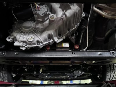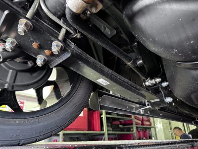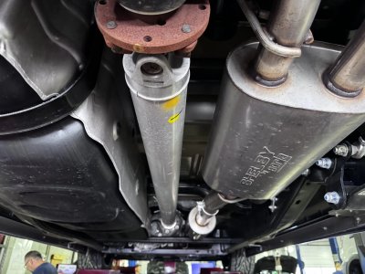 Black-finished 22″ Shelby wheels are mounted with Michelin Defender LTX M/S tires. The truck rides on a Shelby-tuned Ridetech lowered suspension, and braking is handled by four-wheel discs with red Shelby-branded caliper covers.
