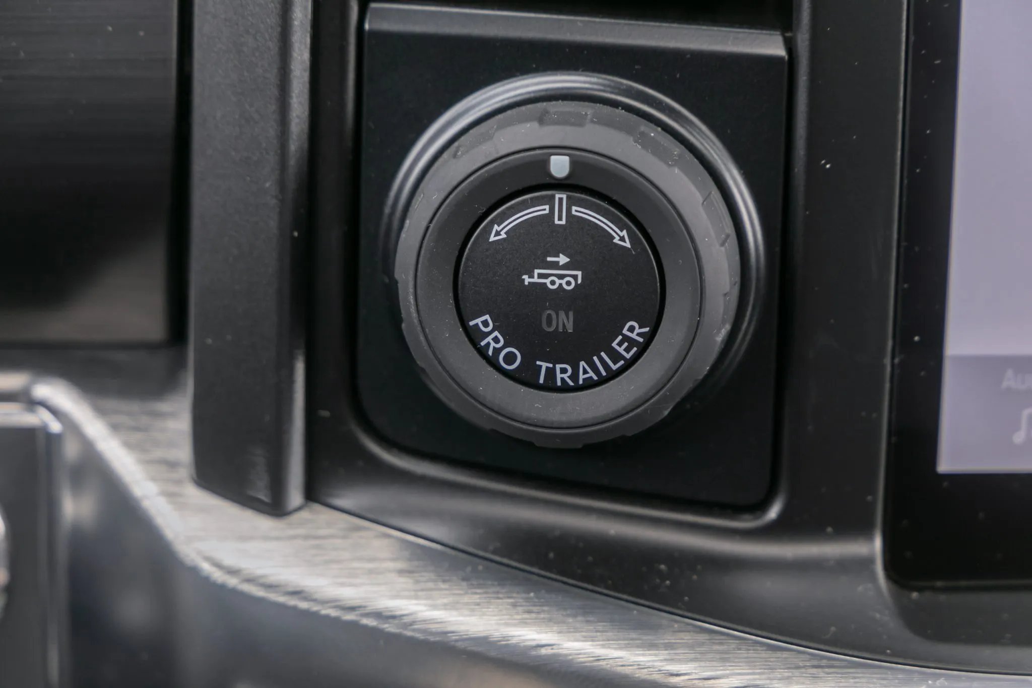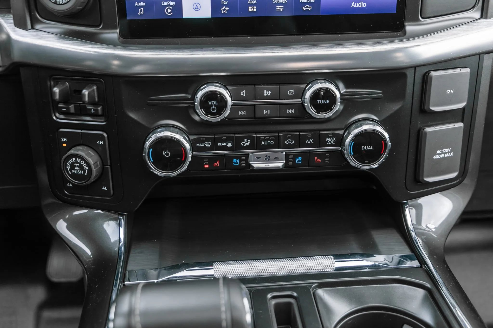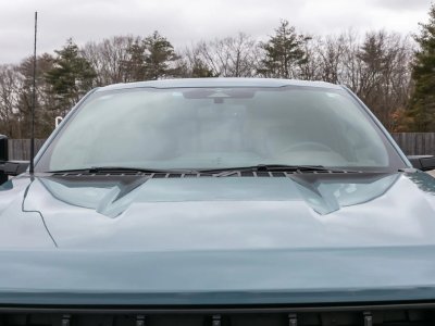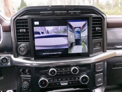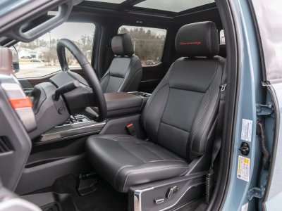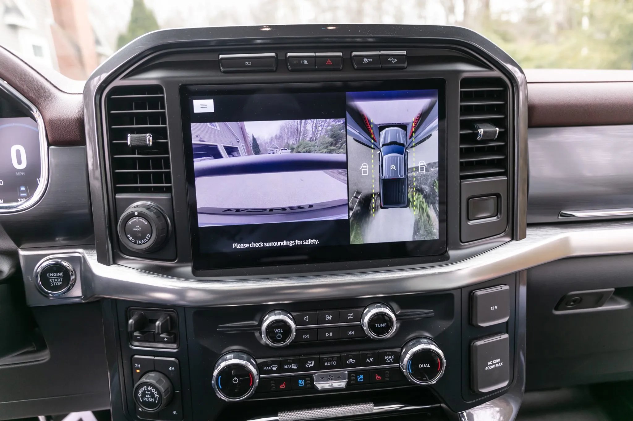 The SuperCrew cabin houses heated, ventilated, and 10-way power-adjustable front bucket seats upholstered in black leather with red Hennessey headrest embroidery. Matching upholstery covers the rear bench, while contrasting brown leather extends from the dashboard to the center console storage lid and door panels. The outboard rear seats are heated, and the truck is further equipped with dual-zone automatic climate control, a remote start system, an eight-speaker Bang & Olufsen sound system, a 4G Wi-Fi hotspot, and a SYNC 4 infotainment system with a 12″ touchscreen. The multifunction steering wheel is paired with power-adjustable pedals with position memory settings. The truck is equipped with Ford Co-Pilot360 technology including lane-keep, forward-collision warning, and pre-collision assist with automatic emergency braking along with a 360-degree camera system. The digital instrument cluster incorporates an 8k-rpm tachometer, a 120-mph speedometer, auxiliary readouts, and an odometer indicating 735 miles.
