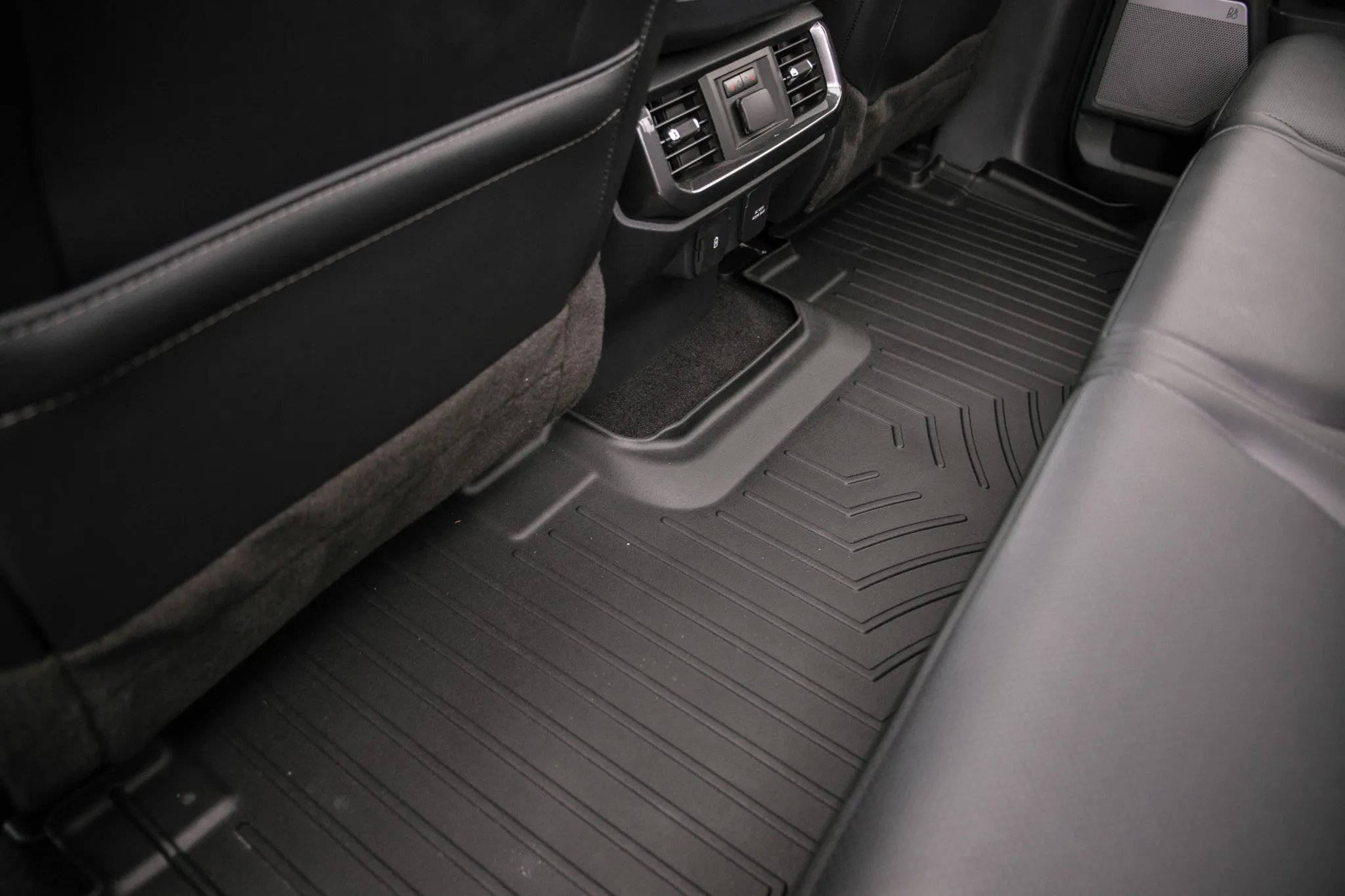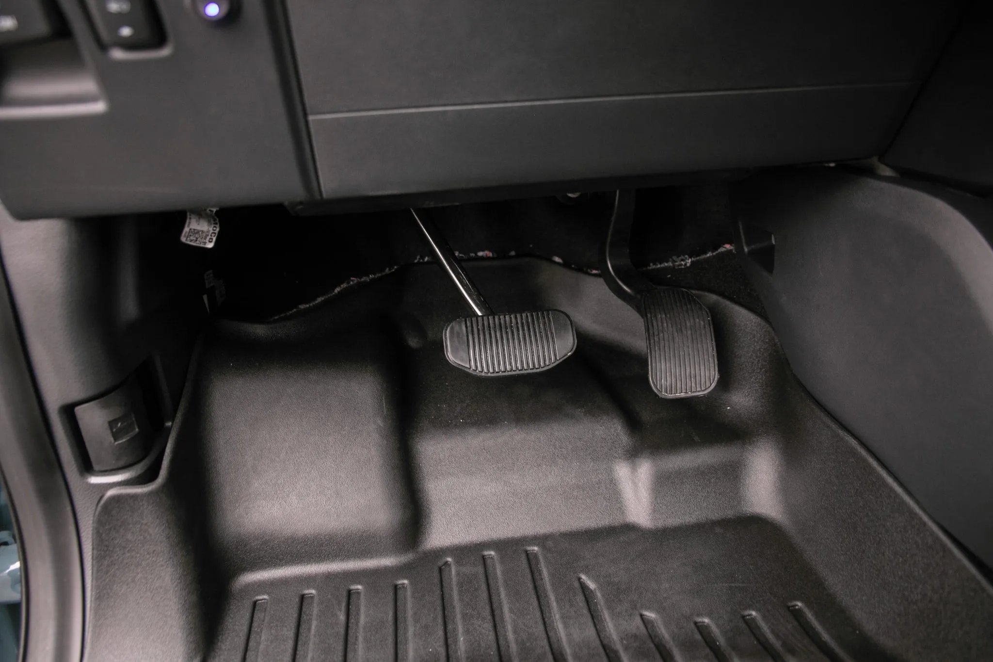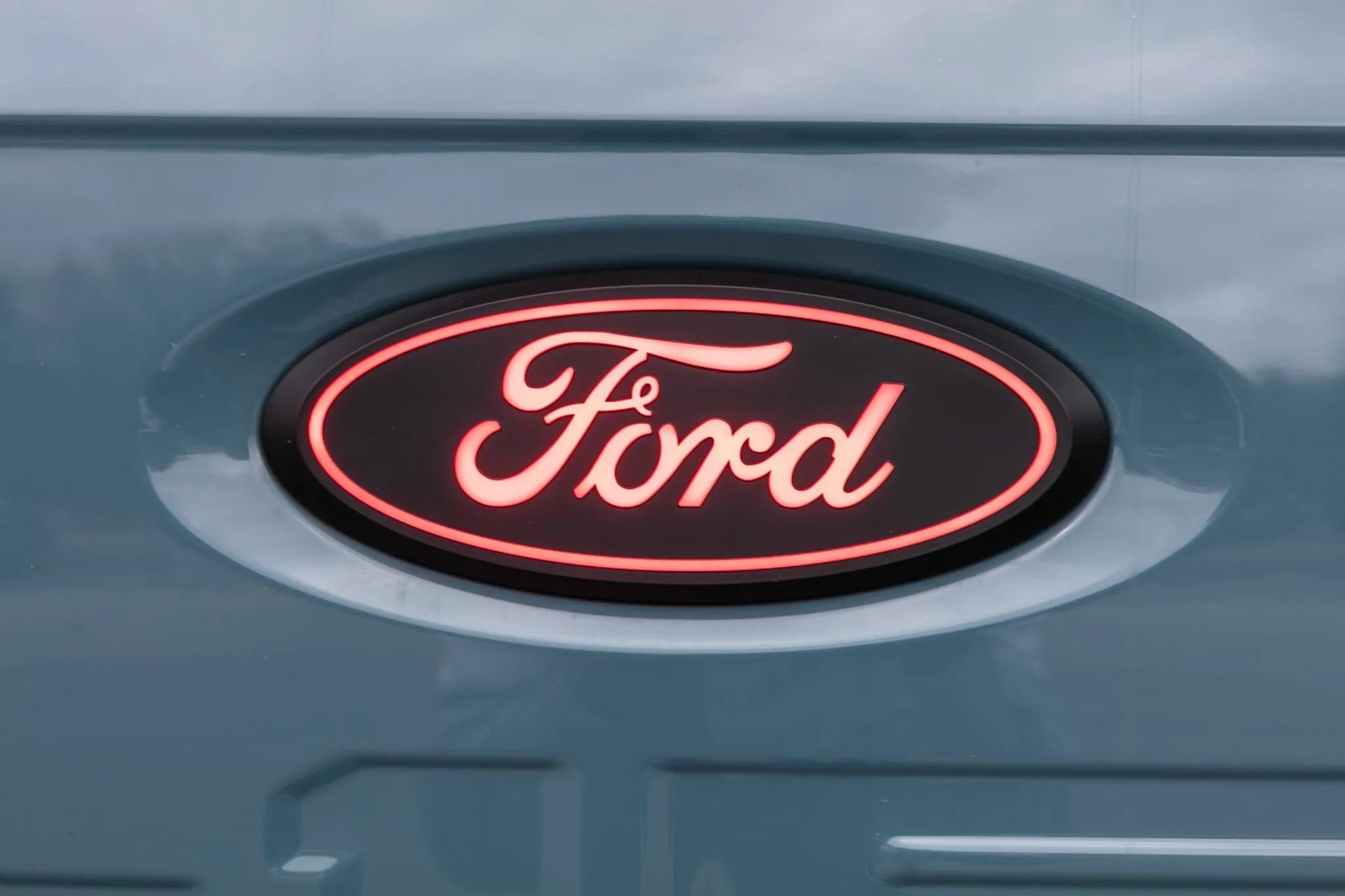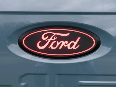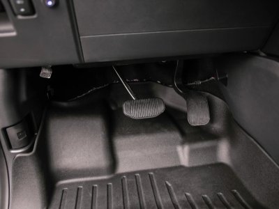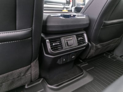 The SuperCrew cabin houses heated, ventilated, and 10-way power-adjustable front bucket seats upholstered in black leather with red Hennessey headrest embroidery. Matching upholstery covers the rear bench, while contrasting brown leather extends from the dashboard to the center console storage lid and door panels. The outboard rear seats are heated, and the truck is further equipped with dual-zone automatic climate control, a remote start system, an eight-speaker Bang & Olufsen sound system, a 4G Wi-Fi hotspot, and a SYNC 4 infotainment system with a 12″ touchscreen. The multifunction steering wheel is paired with power-adjustable pedals with position memory settings. The truck is equipped with Ford Co-Pilot360 technology including lane-keep, forward-collision warning, and pre-collision assist with automatic emergency braking along with a 360-degree camera system. The digital instrument cluster incorporates an 8k-rpm tachometer, a 120-mph speedometer, auxiliary readouts, and an odometer indicating 735 miles.