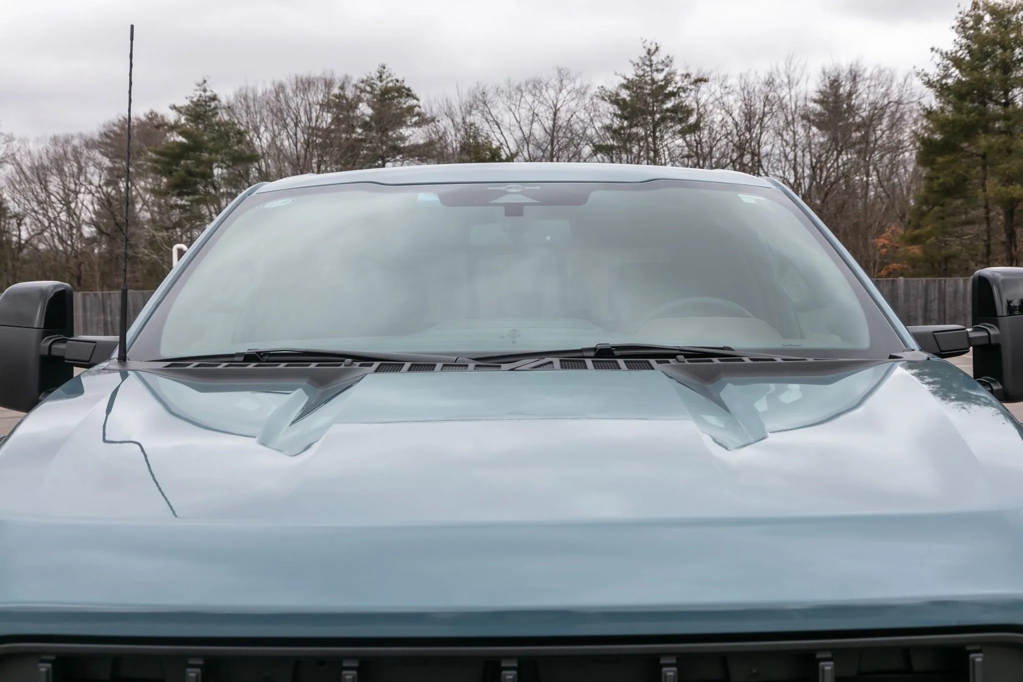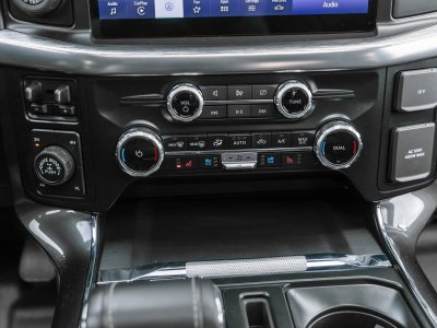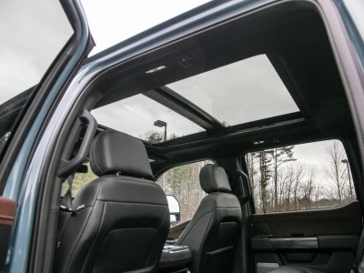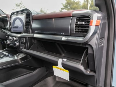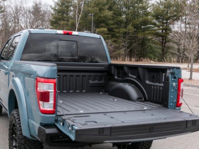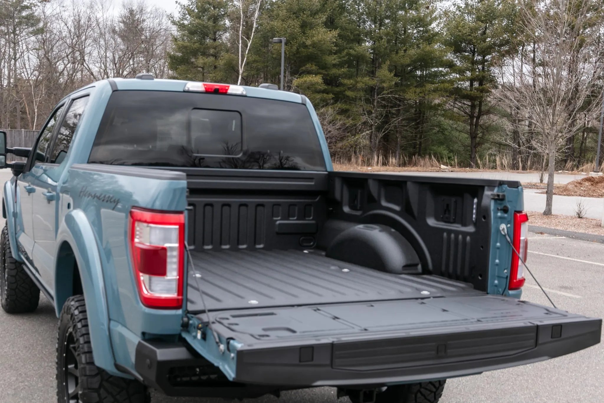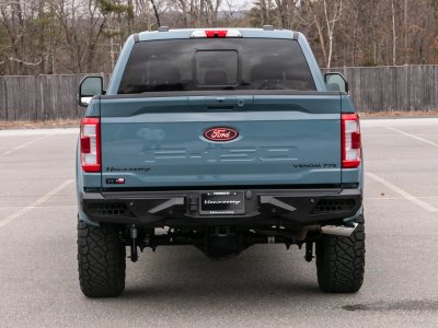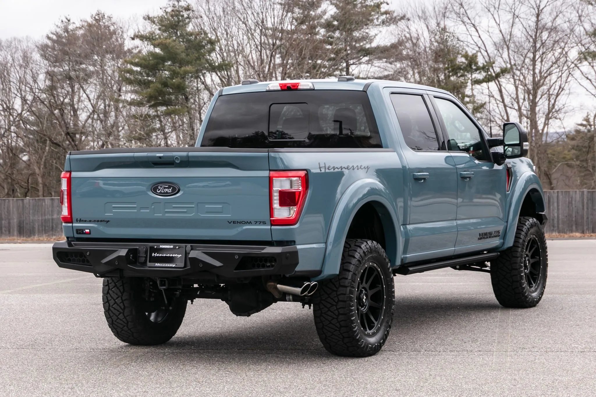 This 2023 Ford F-150 SuperCrew 4×4 pickup has been modified by Hennessey Performance Engineering of Sealy, Texas, with their Venom 775 performance package. Powertrain upgrades include adding a 3.0L Roots-type Whipple supercharger to the 5.0L Coyote V8 as well as an air-to-water intercooler system, a high-performance throttle body, a stainless-steel cat-back exhaust system, and uprated fuel system components to produce a claimed 775 horsepower and 727 lb-ft of torque. Power is sent to the rear or all four wheels via a 10-speed automatic transmission, a dual-range transfer case, and a 3.73:1 electronically locking rear differential. A 6″ BDS suspension lift and 20″ wheels wearing 35″ tires have also been added by Hennessey along with Brembo front brakes, Waldoch power-retractable running boards, a Black Oak LED light bar, and revised bumpers and wheel arch flares. The truck is finished in Area 51 Blue over black and brown leather upholstery. The Venom-branded front bumper has an integrated brush guard and houses a Black Oak LED light bar, while the Hennessey rear bumper is accompanied by a receiver hitch. Waldoch power-retractable running boards have also been added along with illuminated badging. A spray-in bed liner was optioned from the factory along with the Bed Utility Package, which added a Boxlink cargo management system, LED bed lighting, and a power-operated tailgate with an integrated step. Other exterior details include LED headlamps, fog lamps, and tail lamps along with a keyless entry keypad, a 400-watt onboard power outlet, a twin-panel sunroof, a power-sliding rear window, power-telescoping trailer mirrors, and parking sensors.