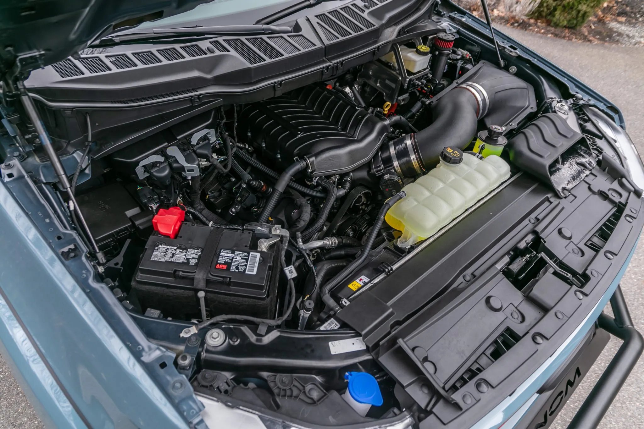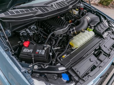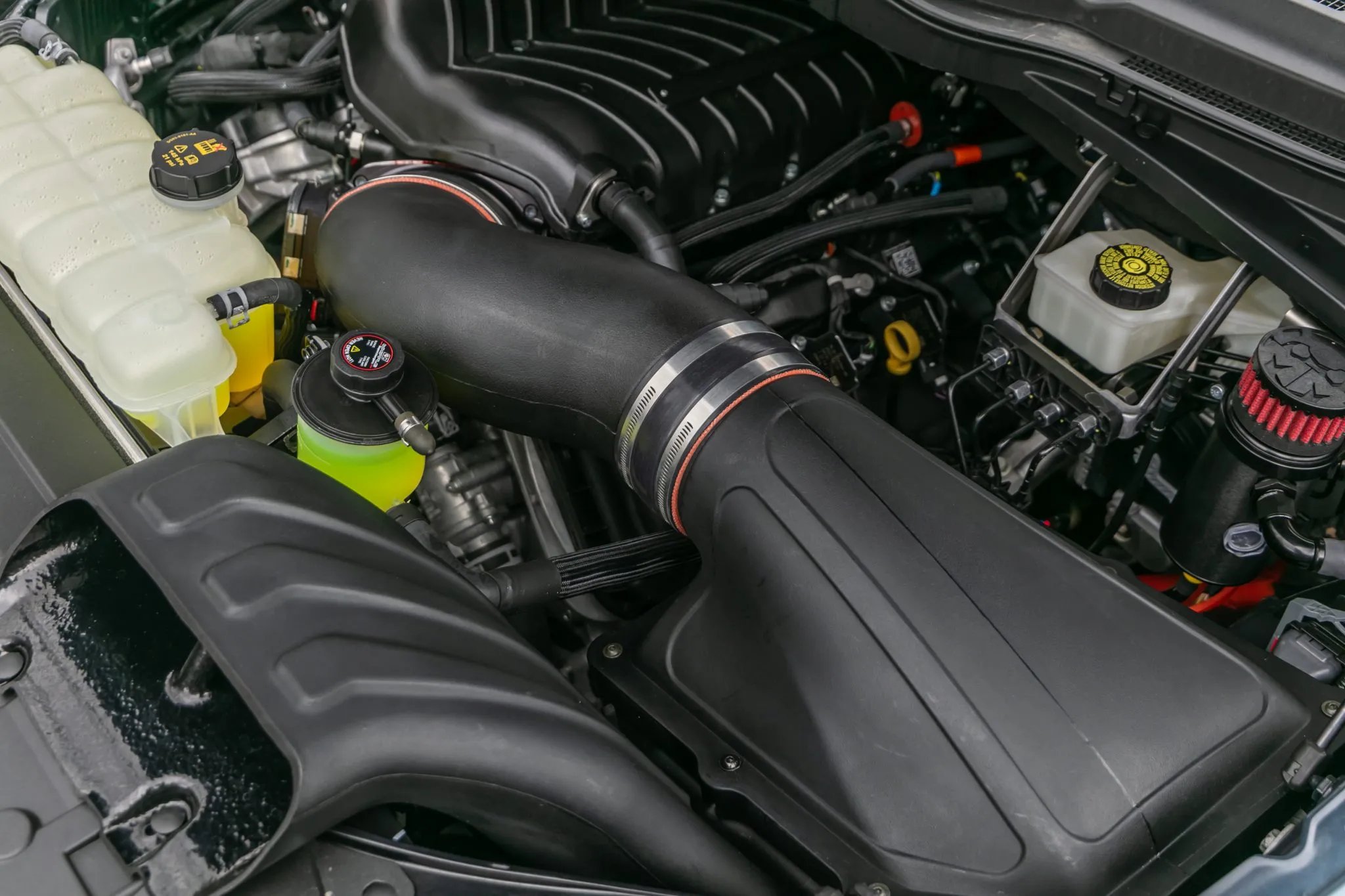 The 5.0L Coyote V8 has been fitted with 3.0L Roots-type Whipple supercharger featuring a lightweight pulley and heavy-duty tensioner. Further modifications by Hennessey include a dual-core air-to-water intercooler system, a high-performance throttle body and air filtration system, and uprated spark plugs and fuel system components. Hennessey rated output at 775 horsepower and 727 lb-ft of torque.
