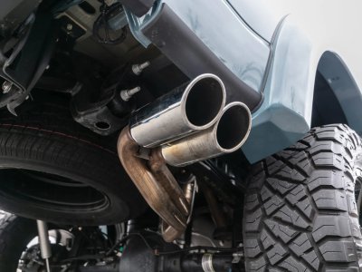 A 6″ BDS suspension lift with Fox remote-reservoir shocks provides clearance for 20″ Hennessey 10-spoke wheels that are mounted with 35×12.50″ Nitto Ridge Grappler tires. Braking is handled by four-wheel discs with red six-piston Brembo calipers squeezing cross-drilled rotors up front.
