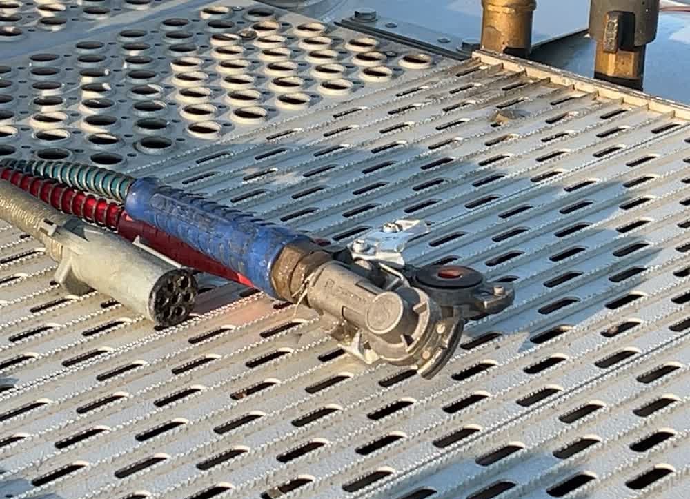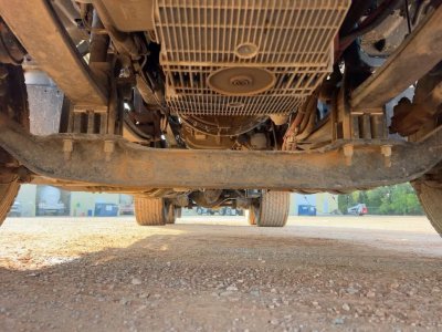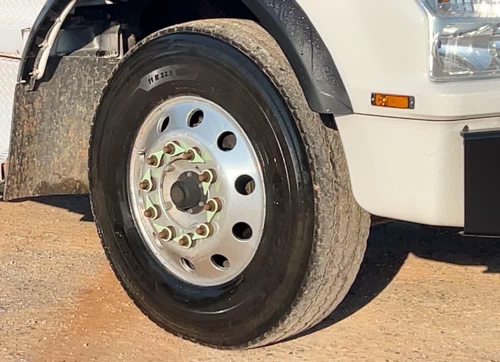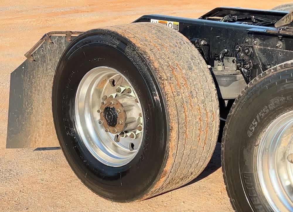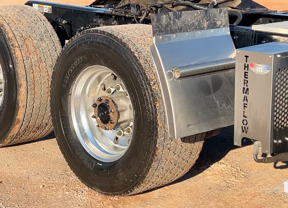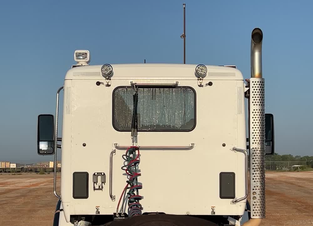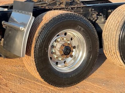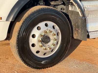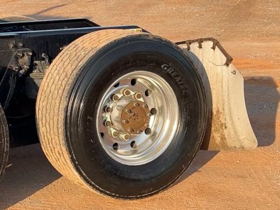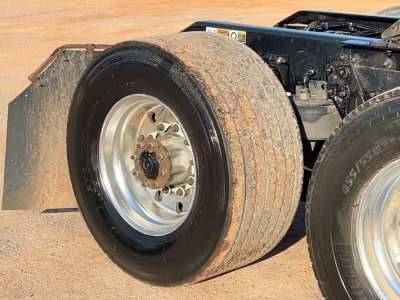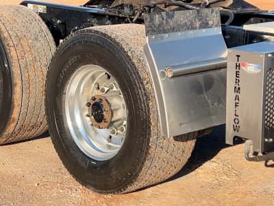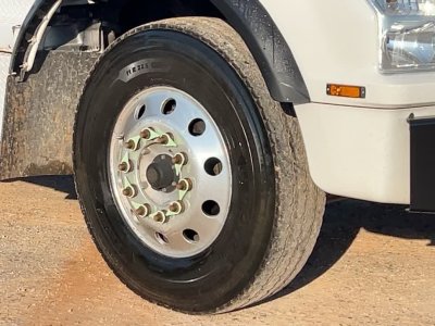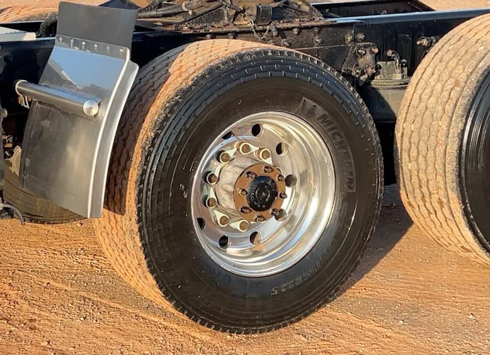 The engine is paired with a smooth-shifting Paccar 10-speed automatic transmission (model P016F112C), which offers a wide range of gears to maximize power delivery and fuel economy across various driving conditions. The truck features a tandem (6x4) drivetrain configuration, with two rear drive axles and an inter-axle differential lock to enhance traction on challenging terrain. The super single rear tires (455/55R23.5) improve stability and reduce rolling resistance, while the front axle is equipped with 11R 22.5 tires for durability and maneuverability.