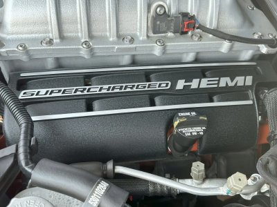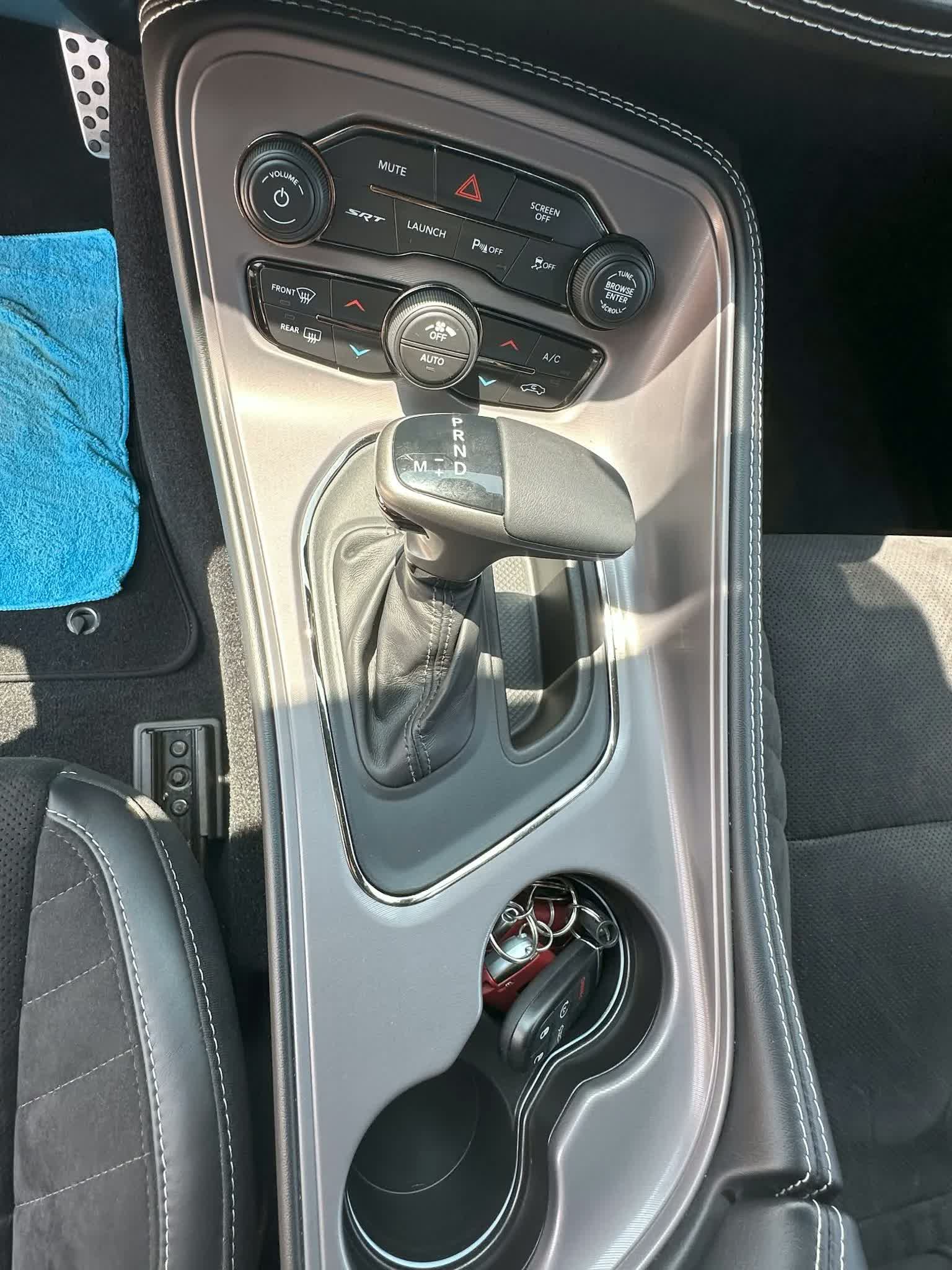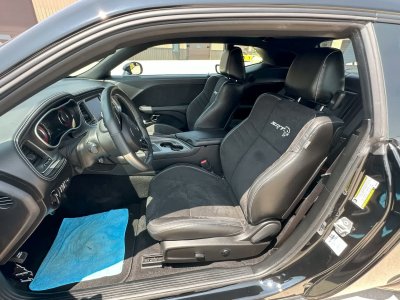 The heated and ventilated front seats are upholstered in black Nappa leather and Alcantara with embossed Hellcat logos on the front backrests. Amenities include driver-seat power adjustability, a folding rear seat, keyless entry, push-button start, Jailbreak badging, a Uconnect infotainment system, a Harman Kardon sound system, and dual-zone automatic climate control. The leather-wrapped steering wheel frames a red 200-mph speedometer and 7k-rpm tachometer along with a configurable digital display. The digital odometer indicates 2,100 miles.