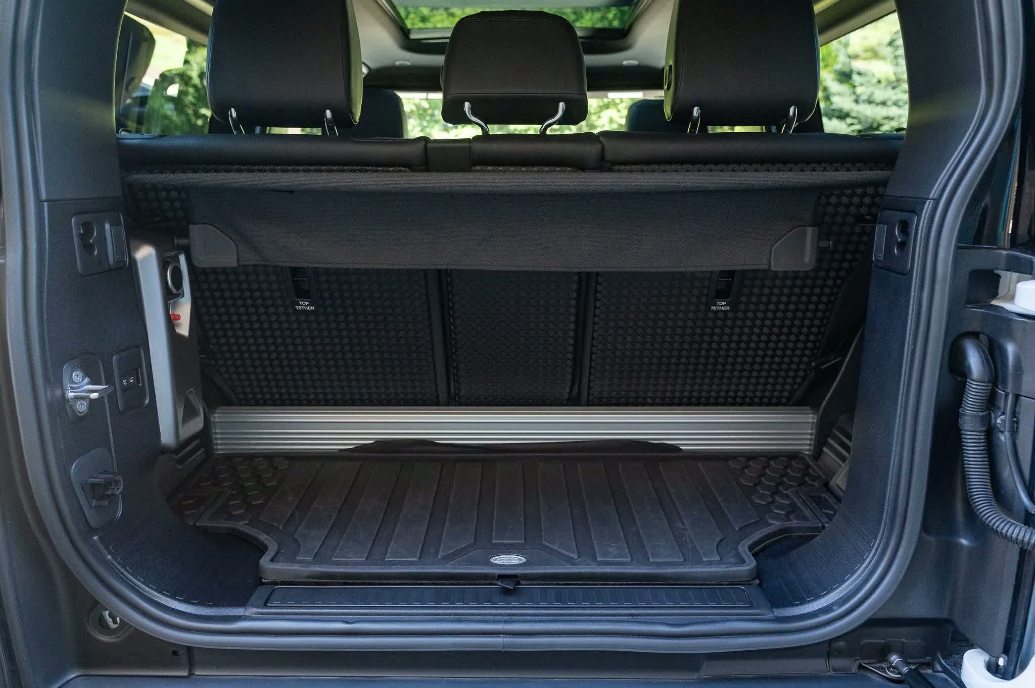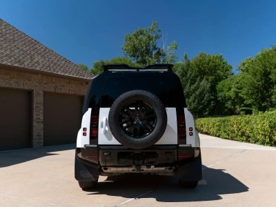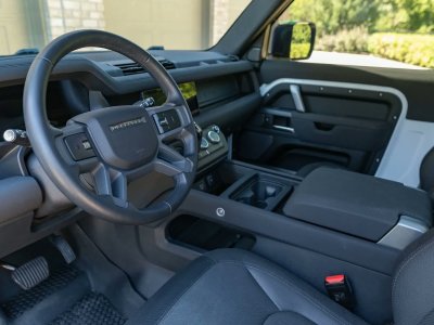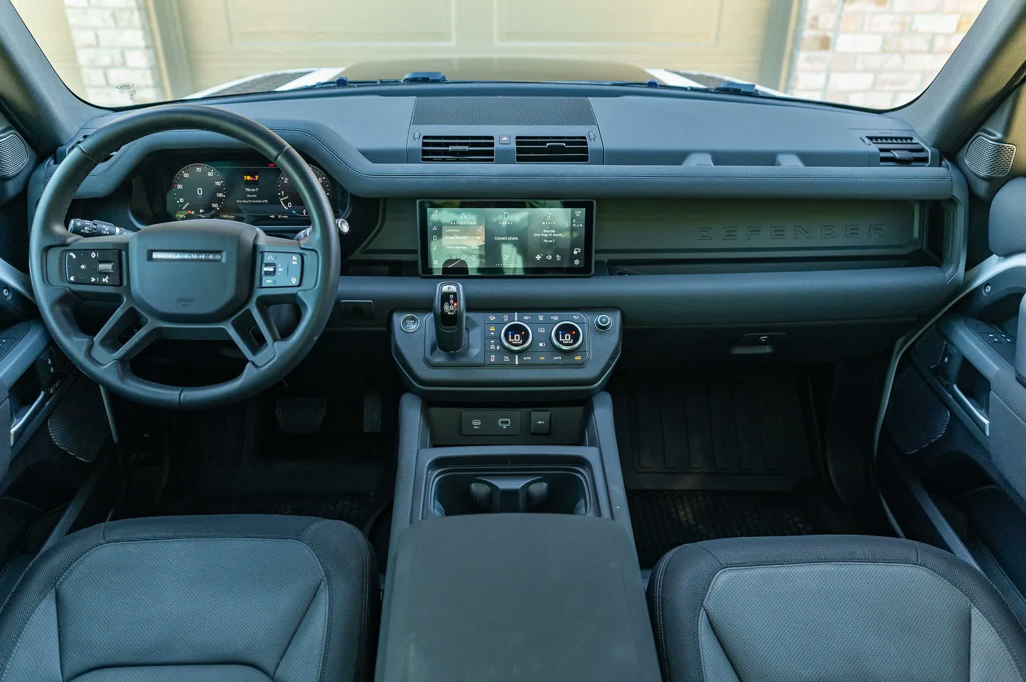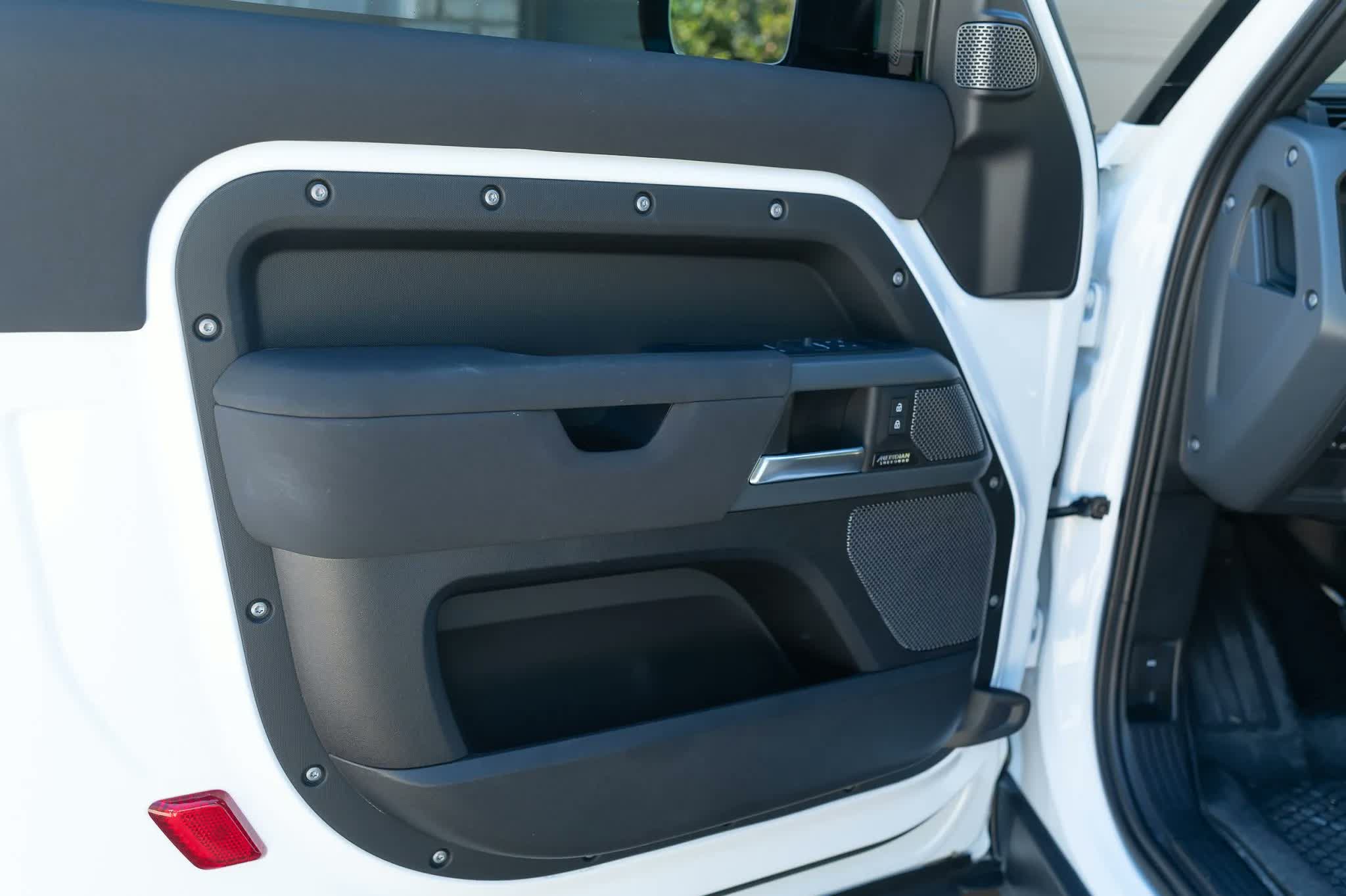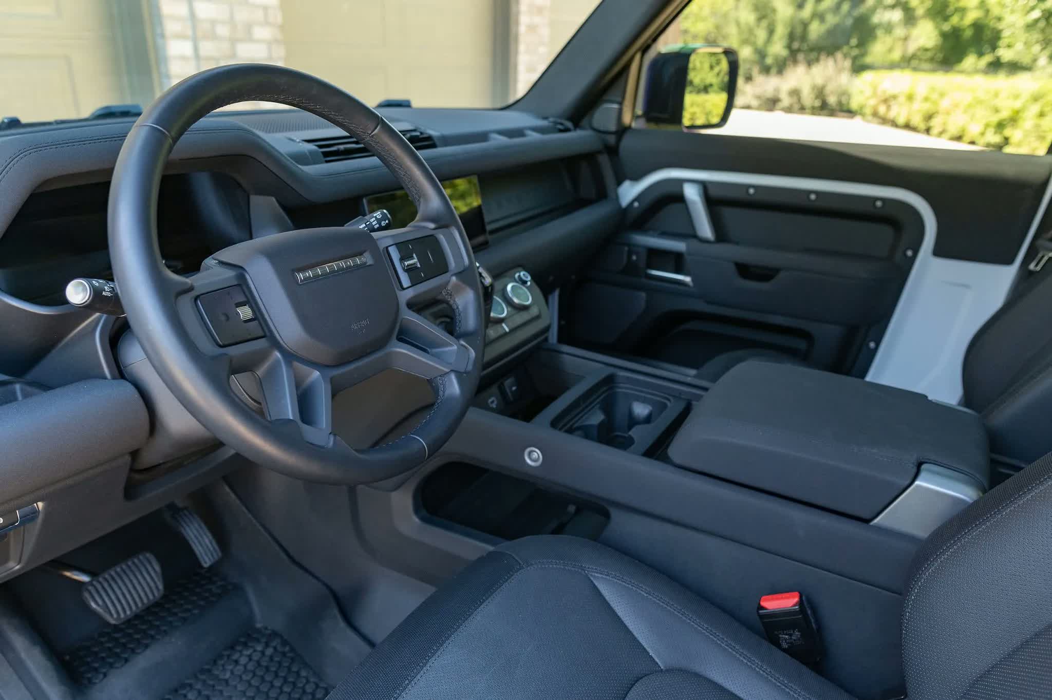 The truck is finished in Fuji White with the Extended Black Exterior Pack that features a gloss black grille, Defender script, checkerplate trim, and fender vents. Additional exterior details include a 360-degree camera system, fog lights, rain-sensing wipers, mud flaps, a panoramic sunroof, a receiver hitch, and a cargo rack with an access ladder. The truck is optioned with the Cold Climate Pack, which adds a heated windshield, wiper jets, and headlight washers. Gloss-black 19″ wheels are wrapped in 255/65 Goodyear Wrangler All-Terrain Adventure tires, and a matching spare is mounted on the rear door. The truck is equipped with the Terrain Response 2 system, Hill Descent Control, and the Air Suspension Package, which features an electronic air suspension, Adaptive Dynamics, and automatic headlight leveling. The cabin features heated front seats and a split-folding rear bench upholstered in Ebony Grain Leather Robustec upholstery over all-weather flooring. Amenities include dual-zone climate control, a surround-view camera, a Meridian sound system, and a 10.1″ infotainment system with navigation, Apple CarPlay, and Android Auto.