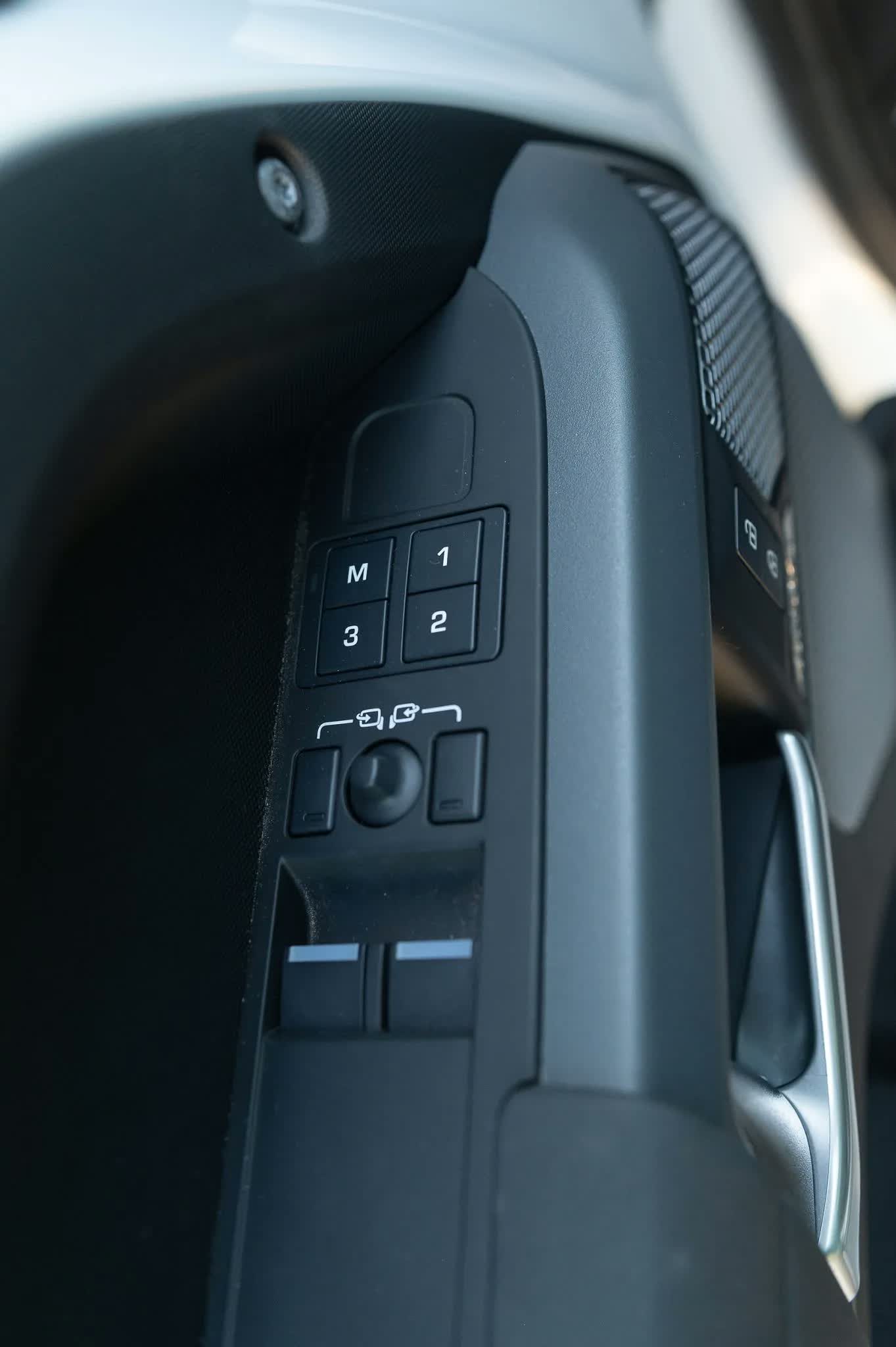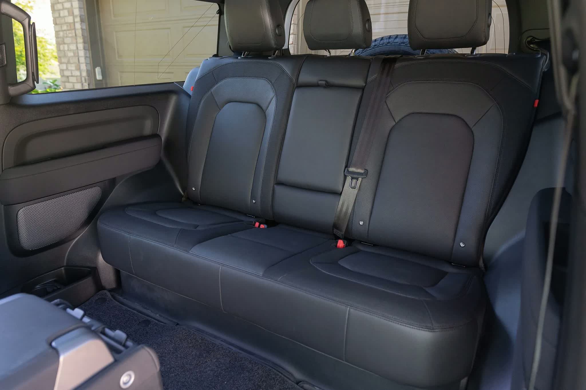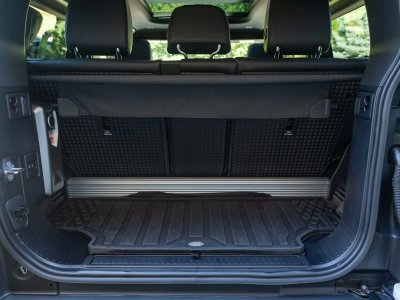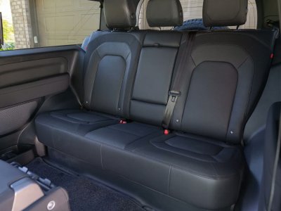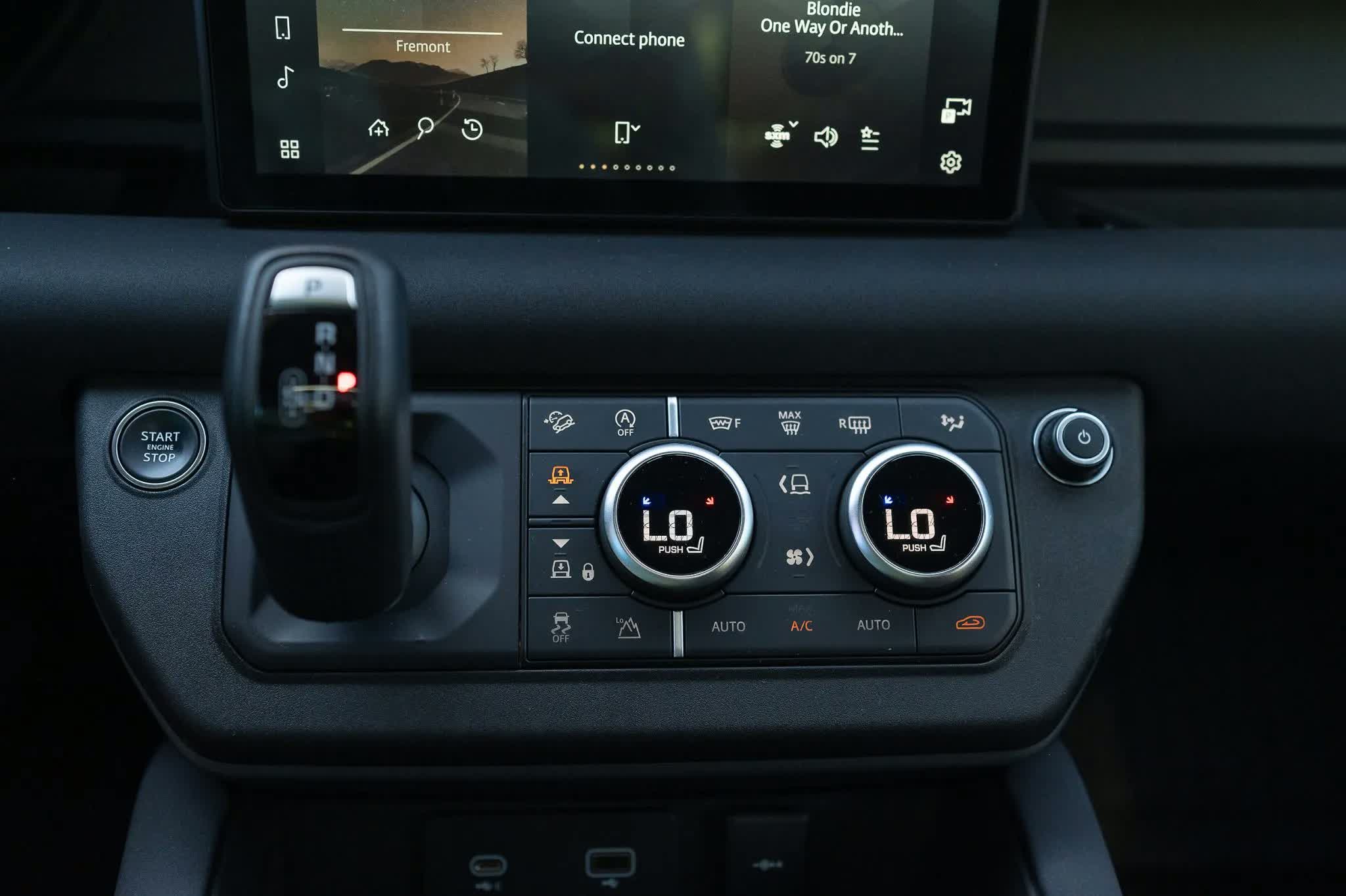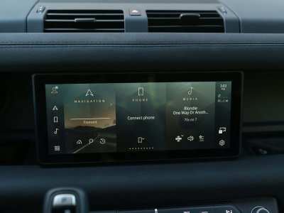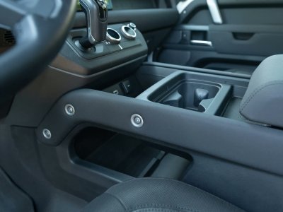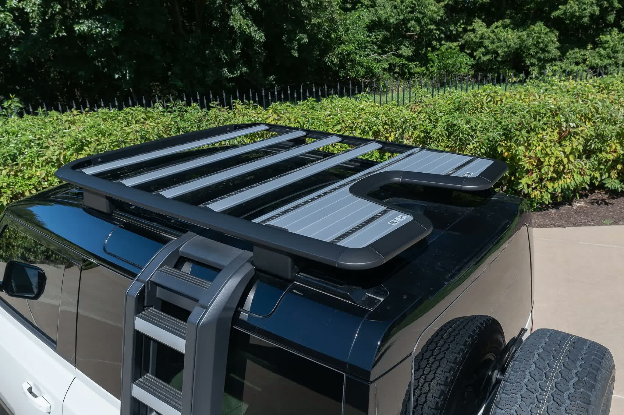 The truck is finished in Fuji White with the Extended Black Exterior Pack that features a gloss black grille, Defender script, checkerplate trim, and fender vents. Additional exterior details include a 360-degree camera system, fog lights, rain-sensing wipers, mud flaps, a panoramic sunroof, a receiver hitch, and a cargo rack with an access ladder. The truck is optioned with the Cold Climate Pack, which adds a heated windshield, wiper jets, and headlight washers. Gloss-black 19″ wheels are wrapped in 255/65 Goodyear Wrangler All-Terrain Adventure tires, and a matching spare is mounted on the rear door. The truck is equipped with the Terrain Response 2 system, Hill Descent Control, and the Air Suspension Package, which features an electronic air suspension, Adaptive Dynamics, and automatic headlight leveling. The cabin features heated front seats and a split-folding rear bench upholstered in Ebony Grain Leather Robustec upholstery over all-weather flooring. Amenities include dual-zone climate control, a surround-view camera, a Meridian sound system, and a 10.1″ infotainment system with navigation, Apple CarPlay, and Android Auto.