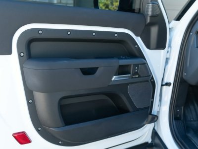 This 2023 Land Rover Defender 90 X-Dynamic SE is finished in Fuji White over Ebony and is powered by a turbocharged and supercharged 3.0L inline-six linked to an eight-speed automatic transmission, a dual-range transfer case, and a 48-volt mild hybrid system. Features include the Cold Climate, Off-Road, and Air Suspension packages along with black-finished 19″ wheels, a roof rack, a 360-degree camera system, a panoramic sunroof, a winch, automatic climate control, heated and cooled front seats, a Meridian sound system, and touchscreen infotainment with navigation and smartphone connectivity.
