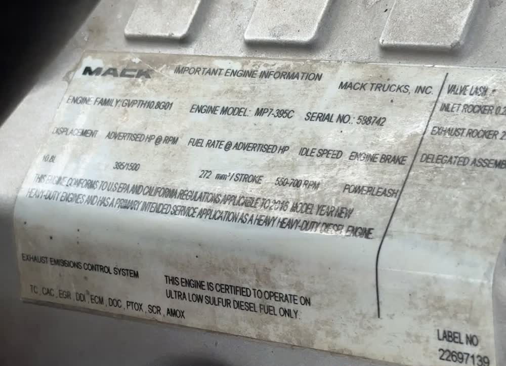 In terms of rubber on the road, this Mack GU813 is fitted with large 315/80R22.5 tires on both the front and tag axles, while the drive axles feature 11R22.5 tires — all mounted on aluminum wheels, which are lighter than steel, corrosion-resistant, and add a polished, professional appearance to the truck. This 2017 Mack GU813 offers a rare combination of heavy-duty specifications, flexible configuration options, and premium features that make it stand out from similar trucks on the market. The 395-horsepower Mack engine, manual transmission, and dual PTOs give it the muscle and versatility needed in tough vocational industries.