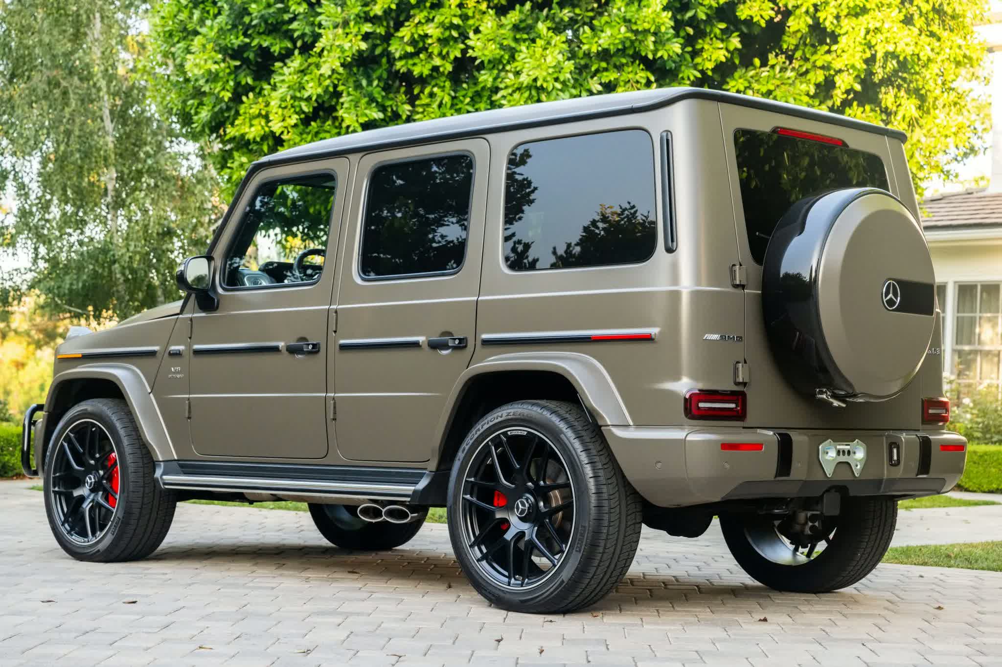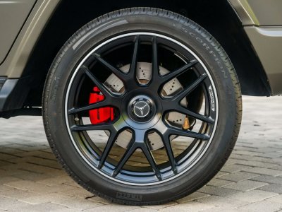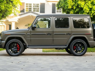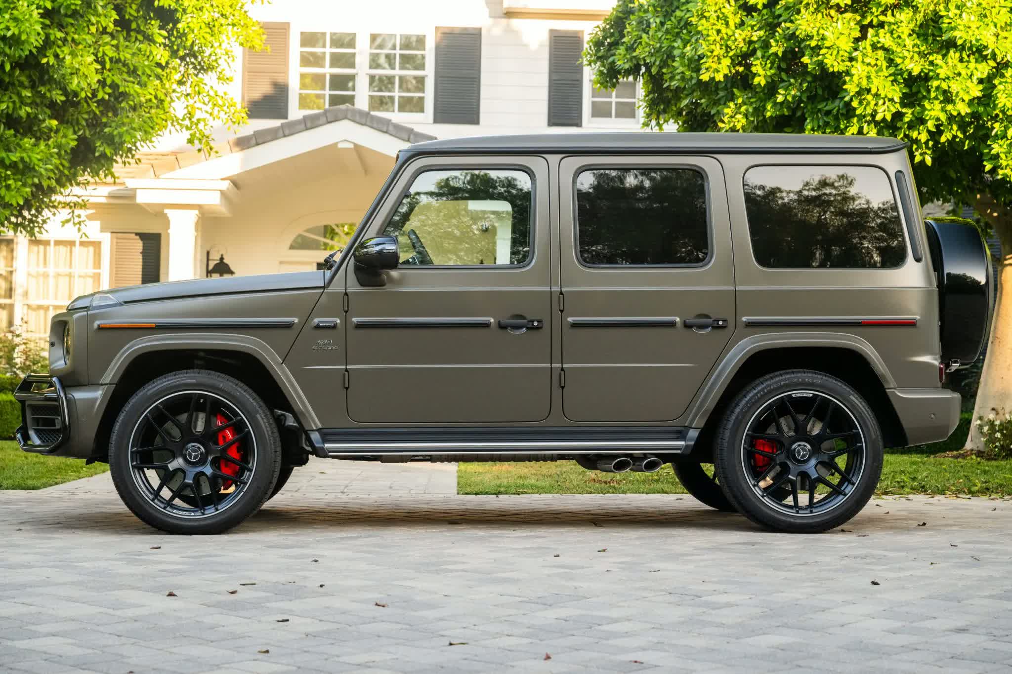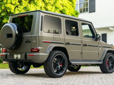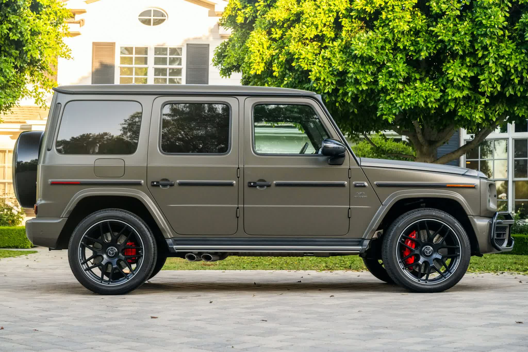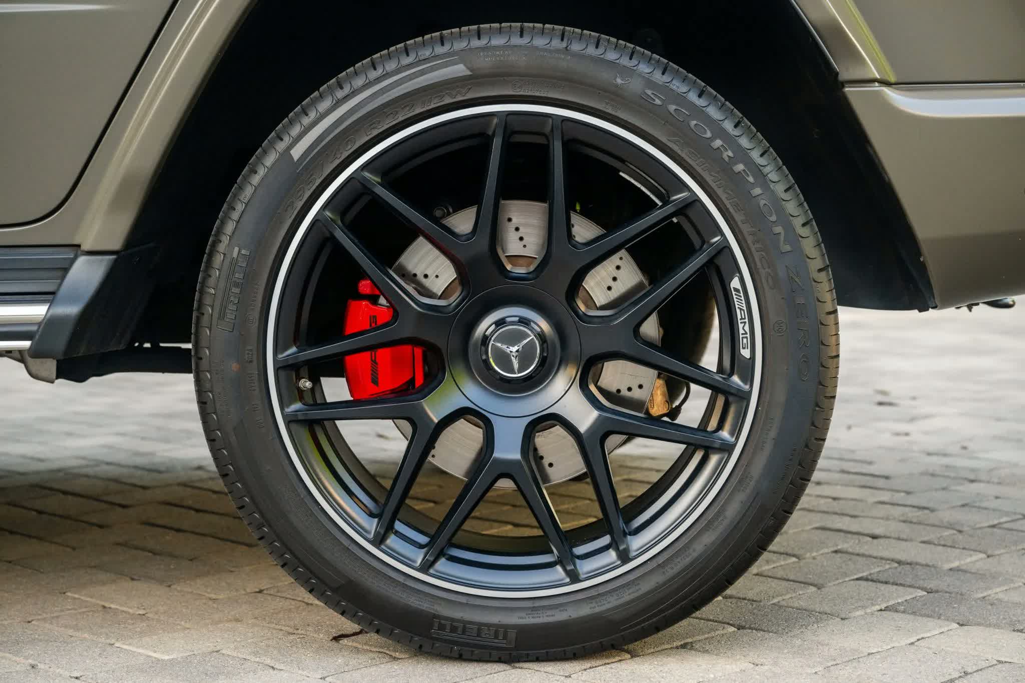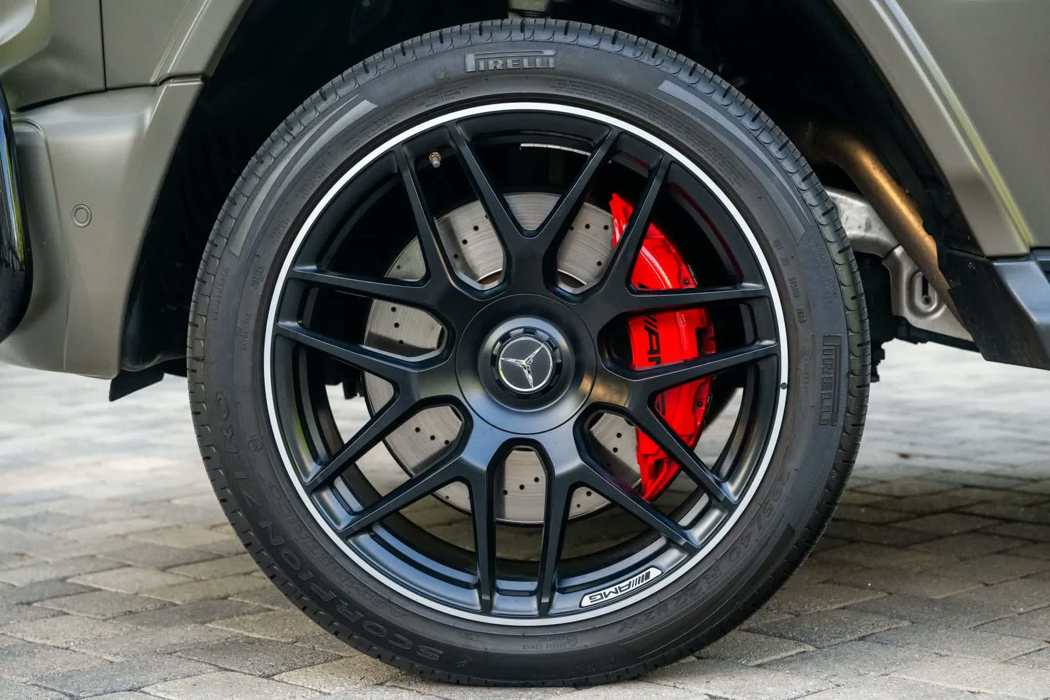This 2020 Mercedes-AMG G63 is finished in Dark Olive Magno over Espresso Brown and black Nappa leather, and it is powered by a twin-turbocharged 4.0-liter V8 linked with a nine-speed automatic transmission and a dual-range transfer case. Equipment includes three locking differentials, 22″ matte black AMG forged cross-spoke wheels, adaptive damping, a sunroof, LED lighting, a front brush guard, front and rear parking sensors, a surround-view camera, running boards, heated and ventilated power-adjustable front seats, heated rear seats, a Burmester sound system, Apple CarPlay, Android Auto, tri-zone automatic climate control, Distronic adaptive cruise control, and MBUX infotainment with navigation. Matte black 22″ AMG forged cross-spoke wheels wear Pirelli Scorpion tires that were mounted in April 2025, and braking is provided by red-painted calipers fitted over discs at each corner. The truck came equipped from the factory with AMG Ride Control featuring adaptive damping.