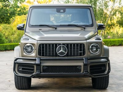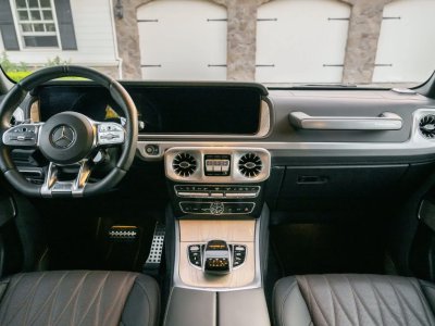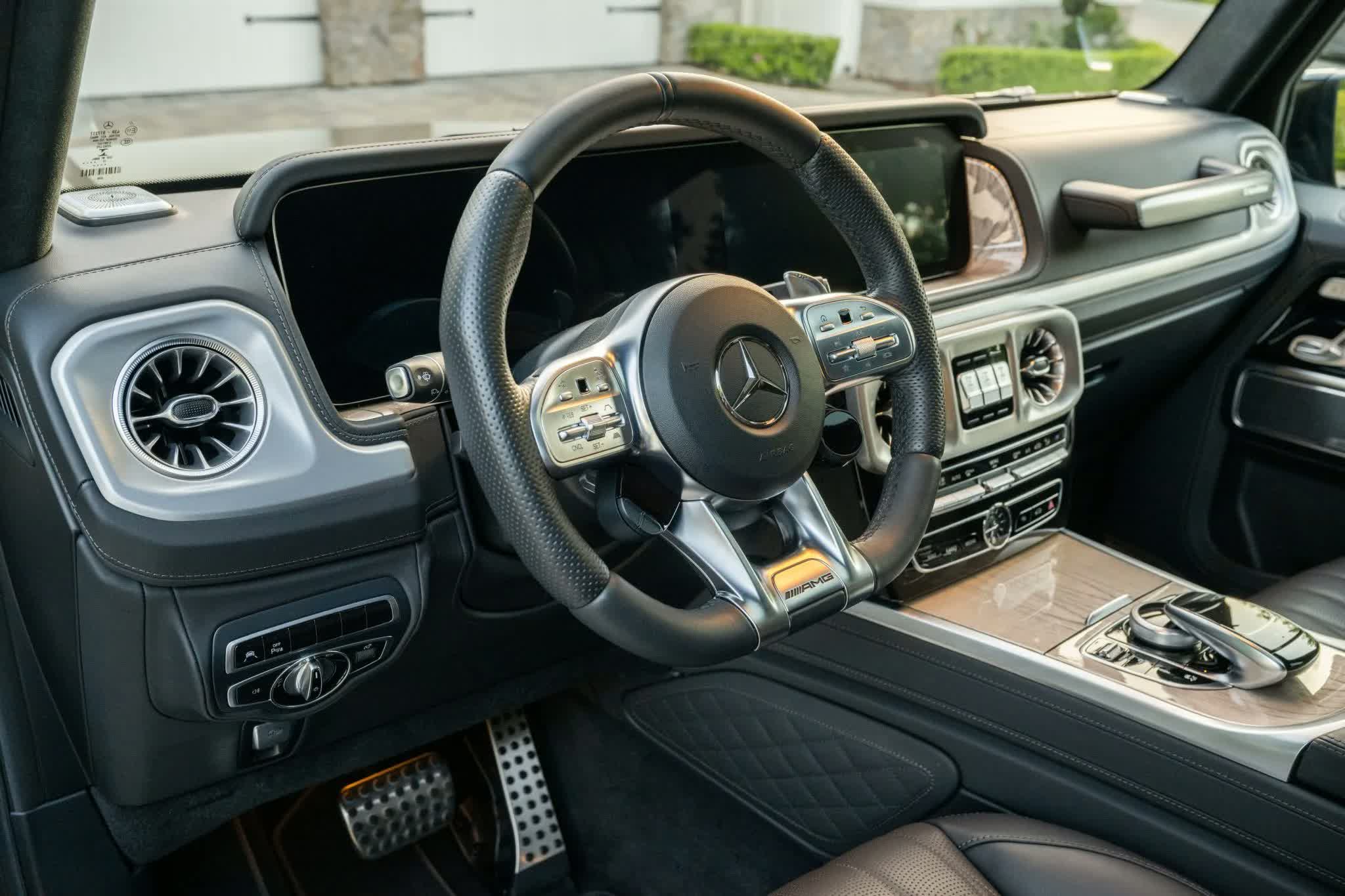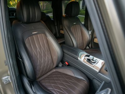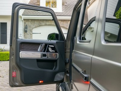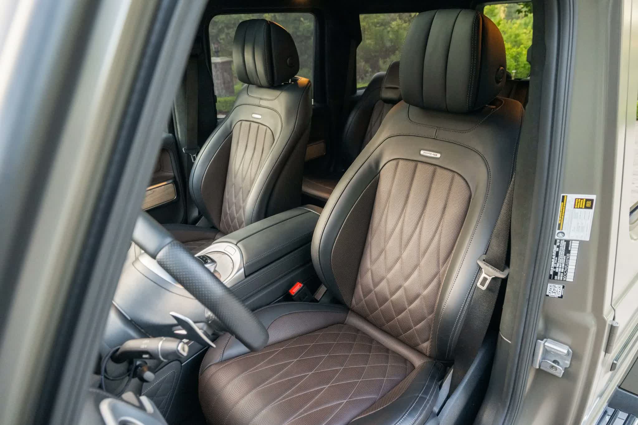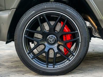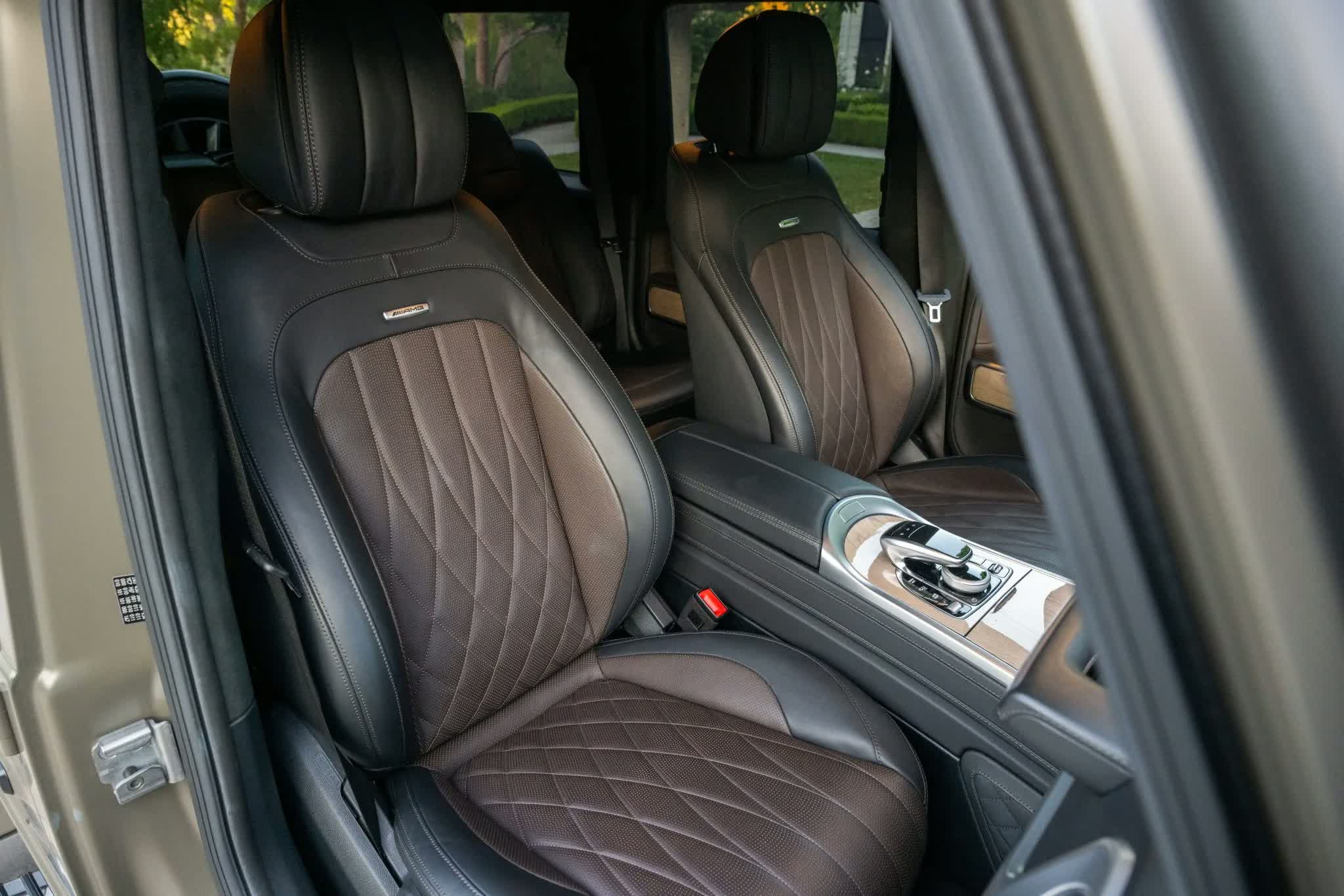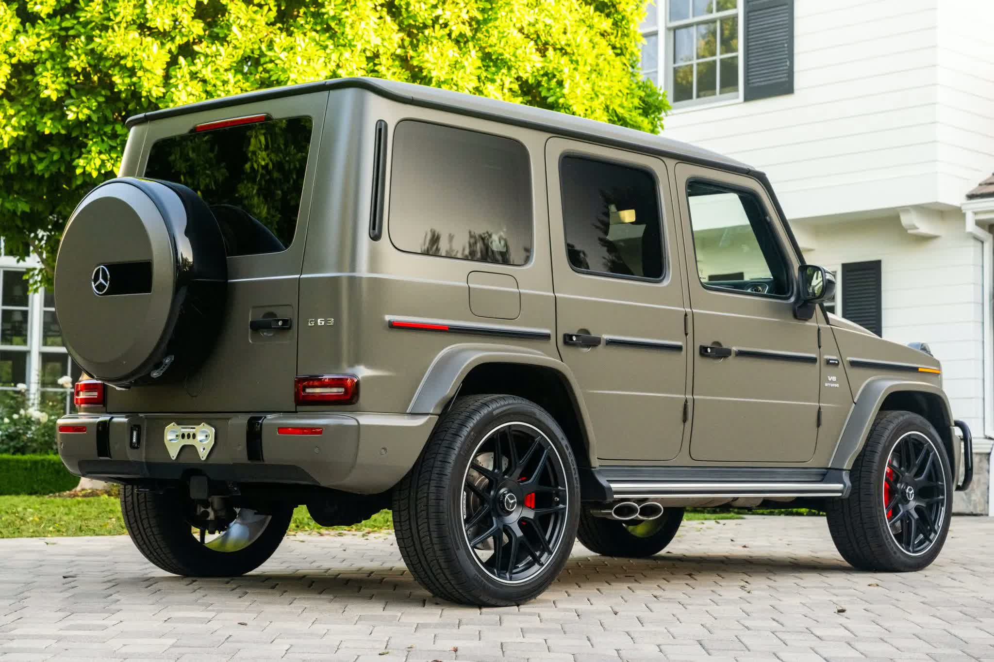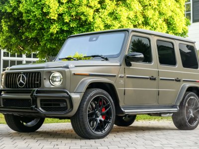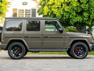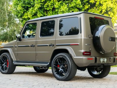 This 2020 Mercedes-AMG G63 is finished in Dark Olive Magno over Espresso Brown and black Nappa leather, and it is powered by a twin-turbocharged 4.0-liter V8 linked with a nine-speed automatic transmission and a dual-range transfer case. Equipment includes three locking differentials, 22″ matte black AMG forged cross-spoke wheels, adaptive damping, a sunroof, LED lighting, a front brush guard, front and rear parking sensors, a surround-view camera, running boards, heated and ventilated power-adjustable front seats, heated rear seats, a Burmester sound system, Apple CarPlay, Android Auto, tri-zone automatic climate control, Distronic adaptive cruise control, and MBUX infotainment with navigation. Matte black 22″ AMG forged cross-spoke wheels wear Pirelli Scorpion tires that were mounted in April 2025, and braking is provided by red-painted calipers fitted over discs at each corner. The truck came equipped from the factory with AMG Ride Control featuring adaptive damping.