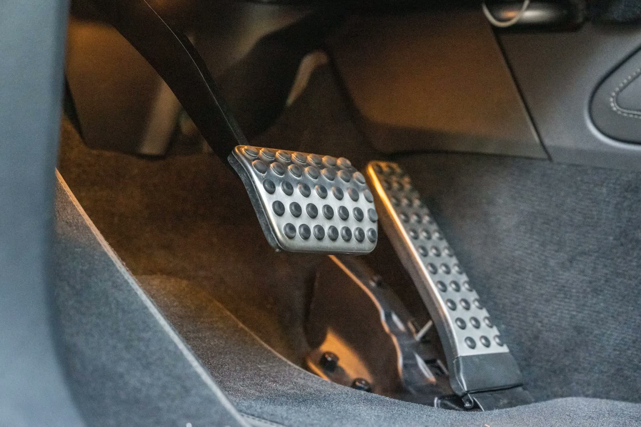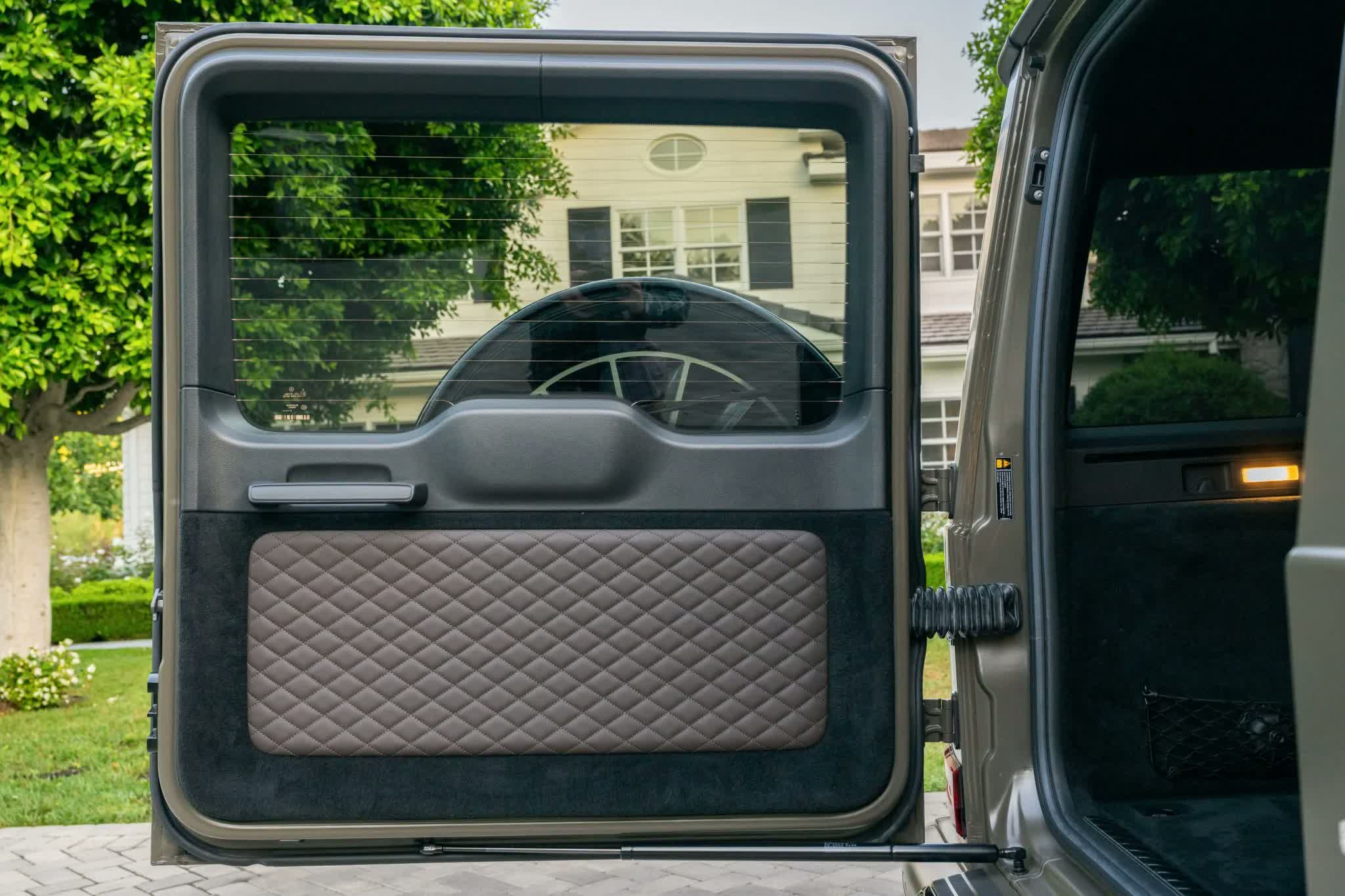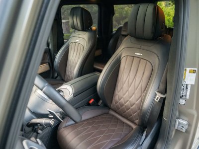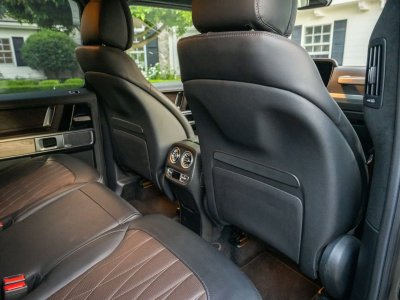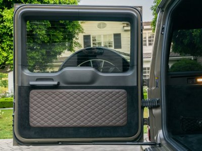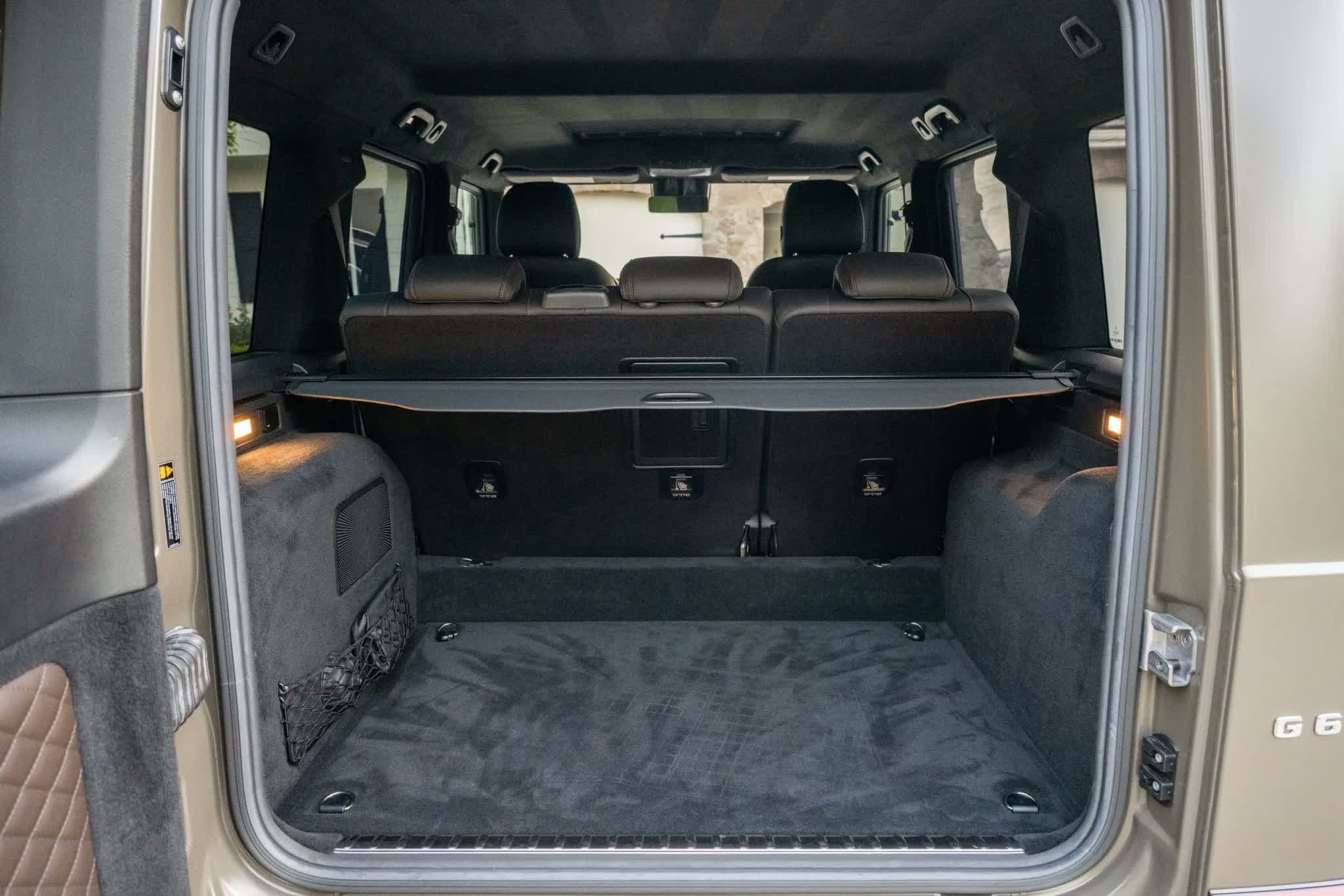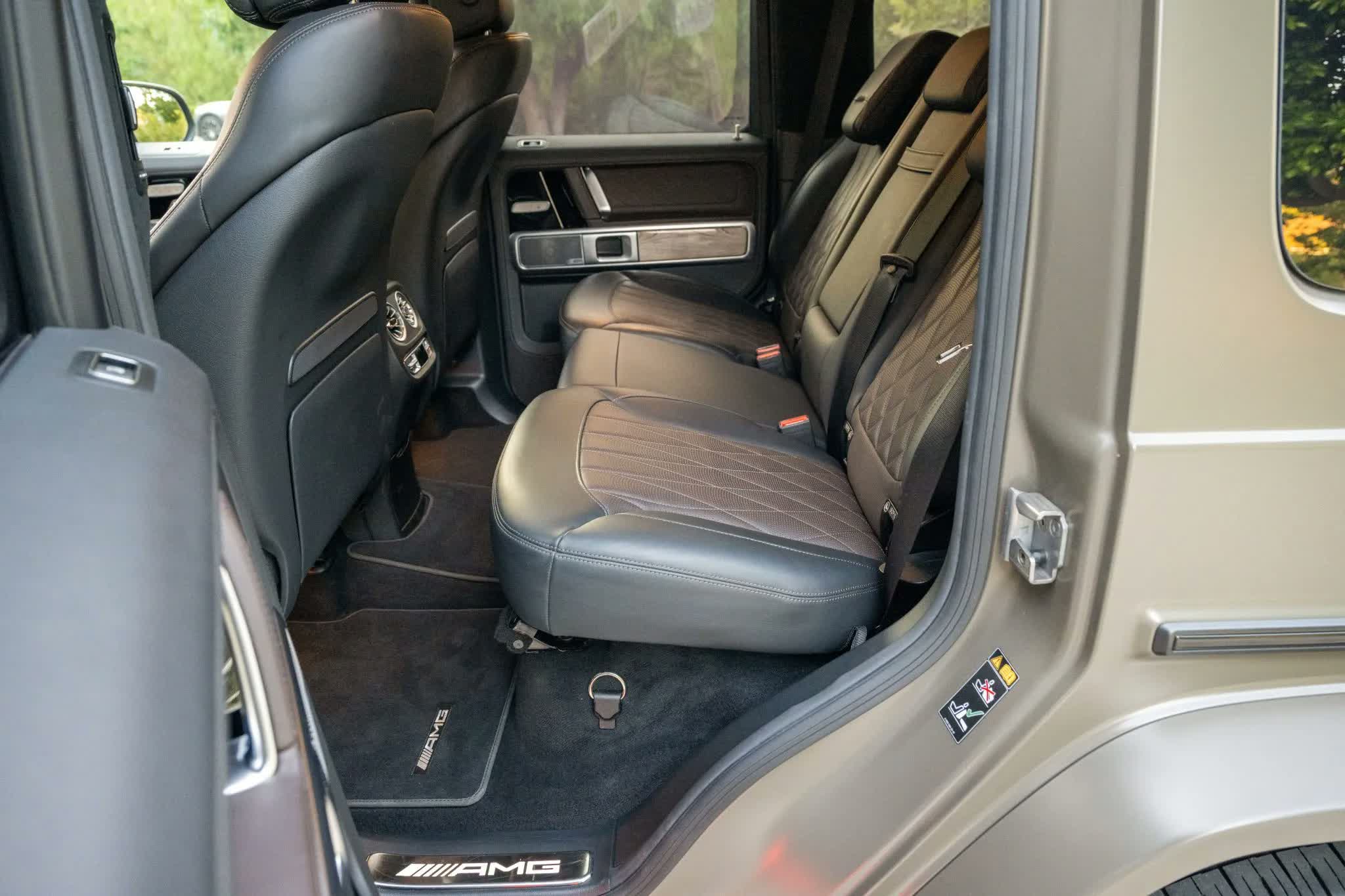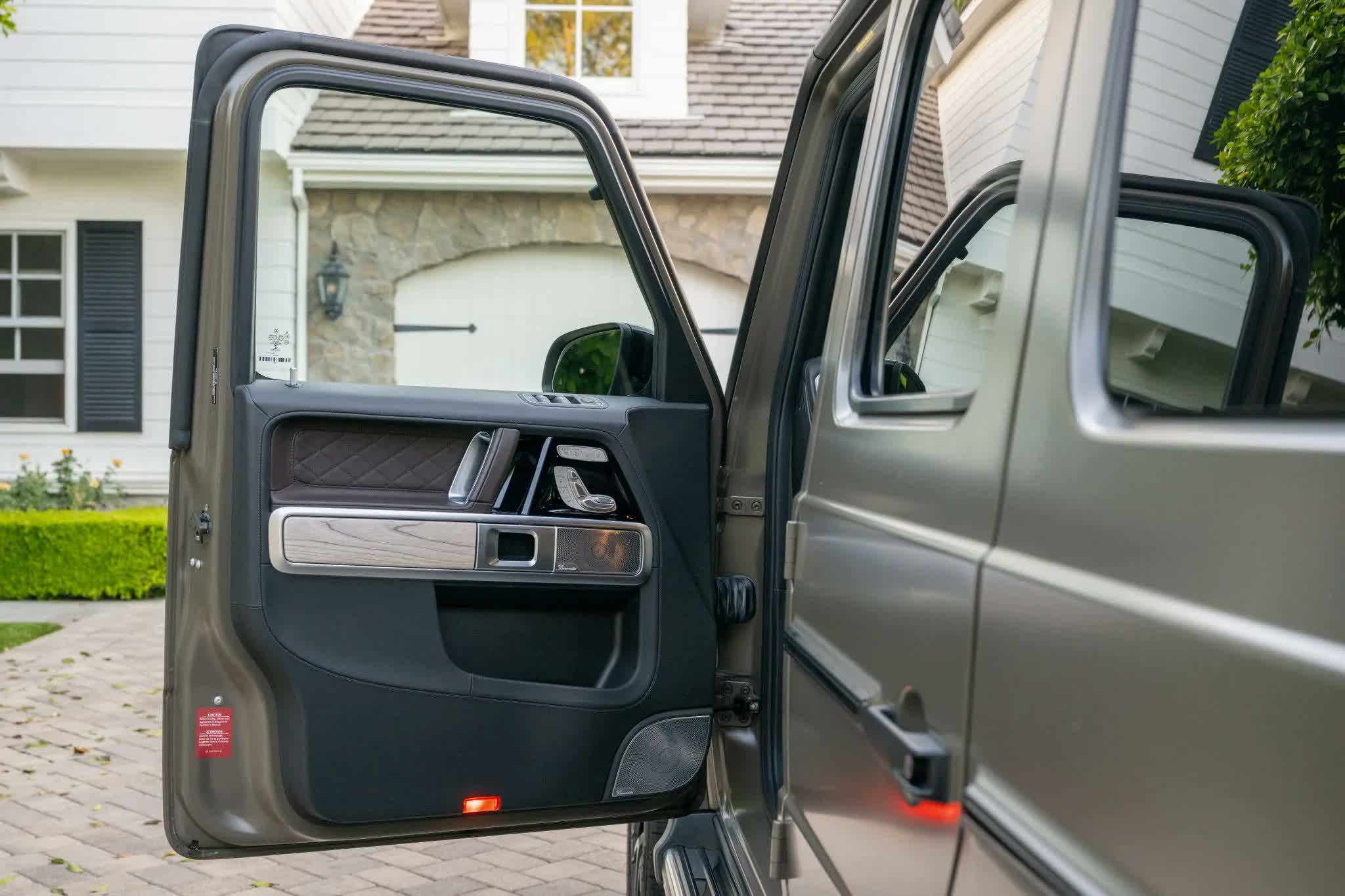 This 2020 Mercedes-AMG G63 is finished in Dark Olive Magno over Espresso Brown and black Nappa leather, and it is powered by a twin-turbocharged 4.0-liter V8 linked with a nine-speed automatic transmission and a dual-range transfer case. Equipment includes three locking differentials, 22″ matte black AMG forged cross-spoke wheels, adaptive damping, a sunroof, LED lighting, a front brush guard, front and rear parking sensors, a surround-view camera, running boards, heated and ventilated power-adjustable front seats, heated rear seats, a Burmester sound system, Apple CarPlay, Android Auto, tri-zone automatic climate control, Distronic adaptive cruise control, and MBUX infotainment with navigation. Matte black 22″ AMG forged cross-spoke wheels wear Pirelli Scorpion tires that were mounted in April 2025, and braking is provided by red-painted calipers fitted over discs at each corner. The truck came equipped from the factory with AMG Ride Control featuring adaptive damping.