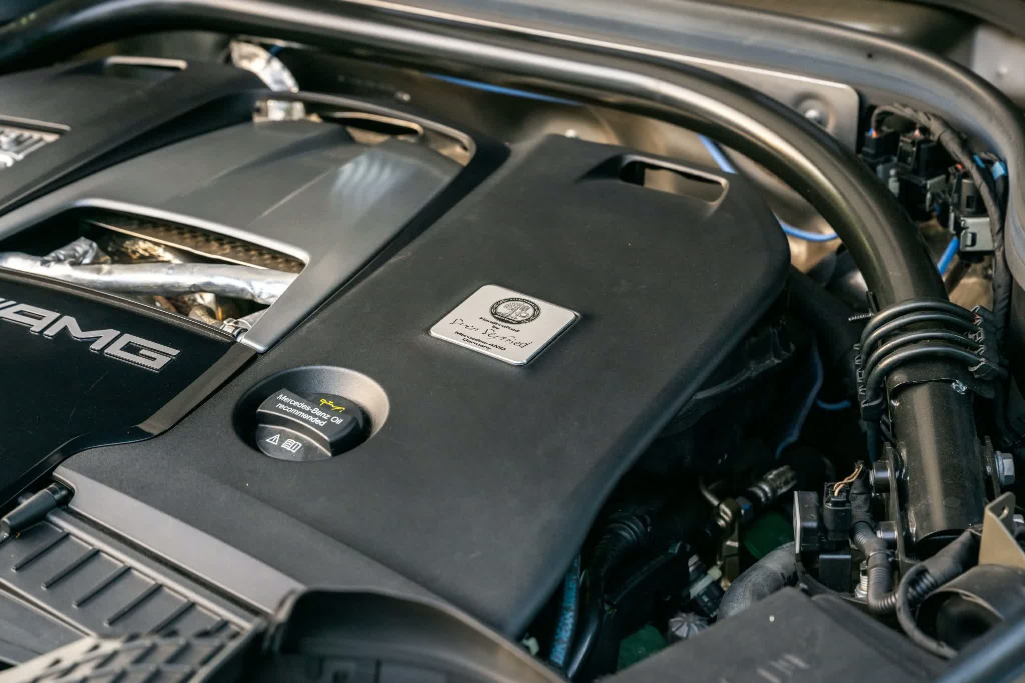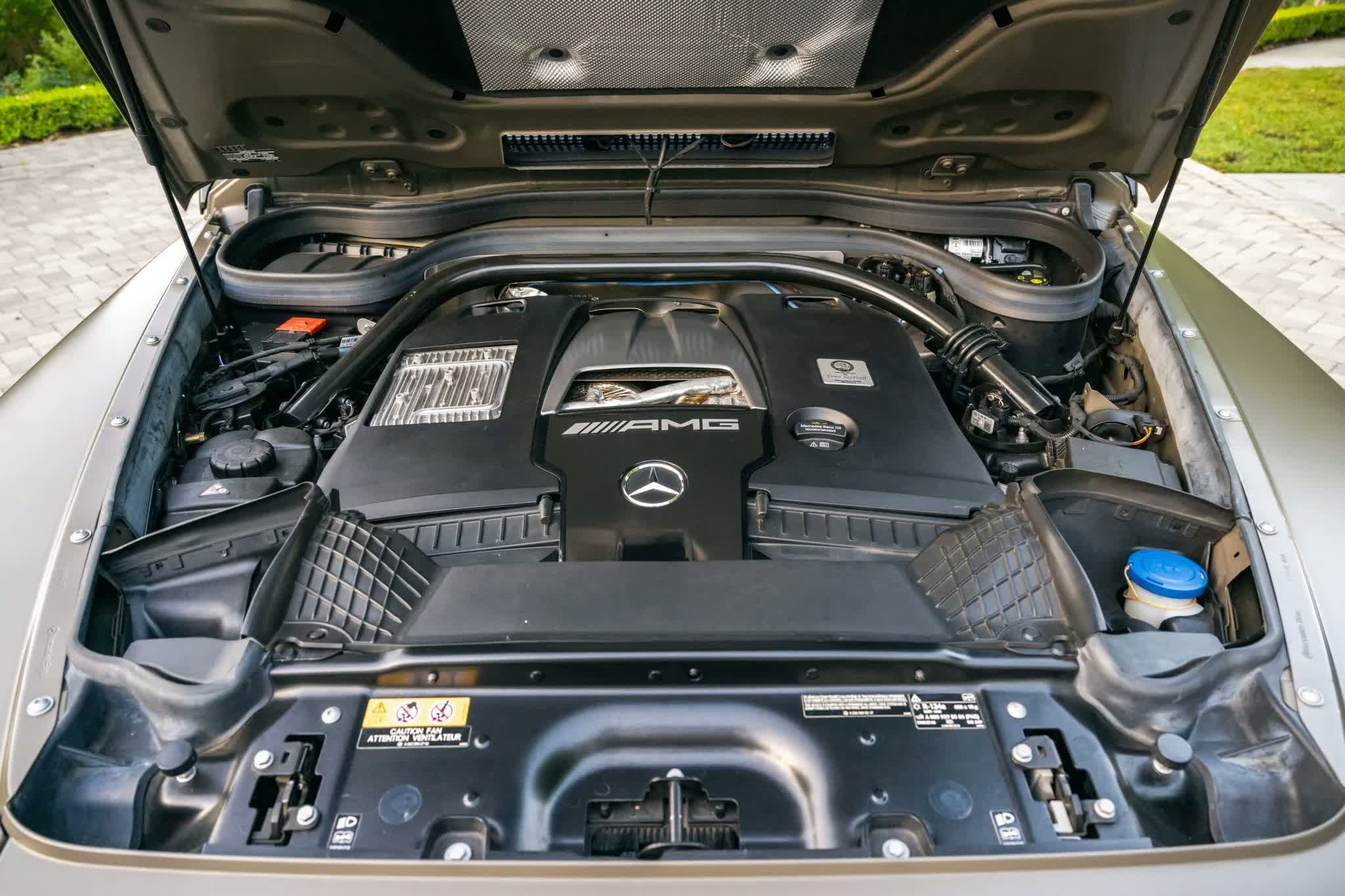 The twin-turbocharged 4.0-liter V8 was factory rated at 577 horsepower and 627 lb-ft of torque. An oil change was performed in April 2025, at which time the front differential was serviced and the transfer case fluid, air filter, and spark plugs were also replaced.