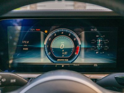 The heated and ventilated power-adjustable front seats and heated rear bench are upholstered in Espresso Brown and Black Nappa leather with AMG logos on the front backrests, and amenities include front-seat position memory settings, a Burmester sound system, Apple CarPlay, Android Auto, Blind Spot Assist, tri-zone automatic climate control, Distronic adaptive cruise control, wood trim, and MBUX infotainment with navigation.