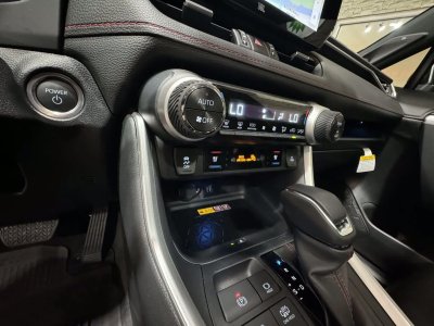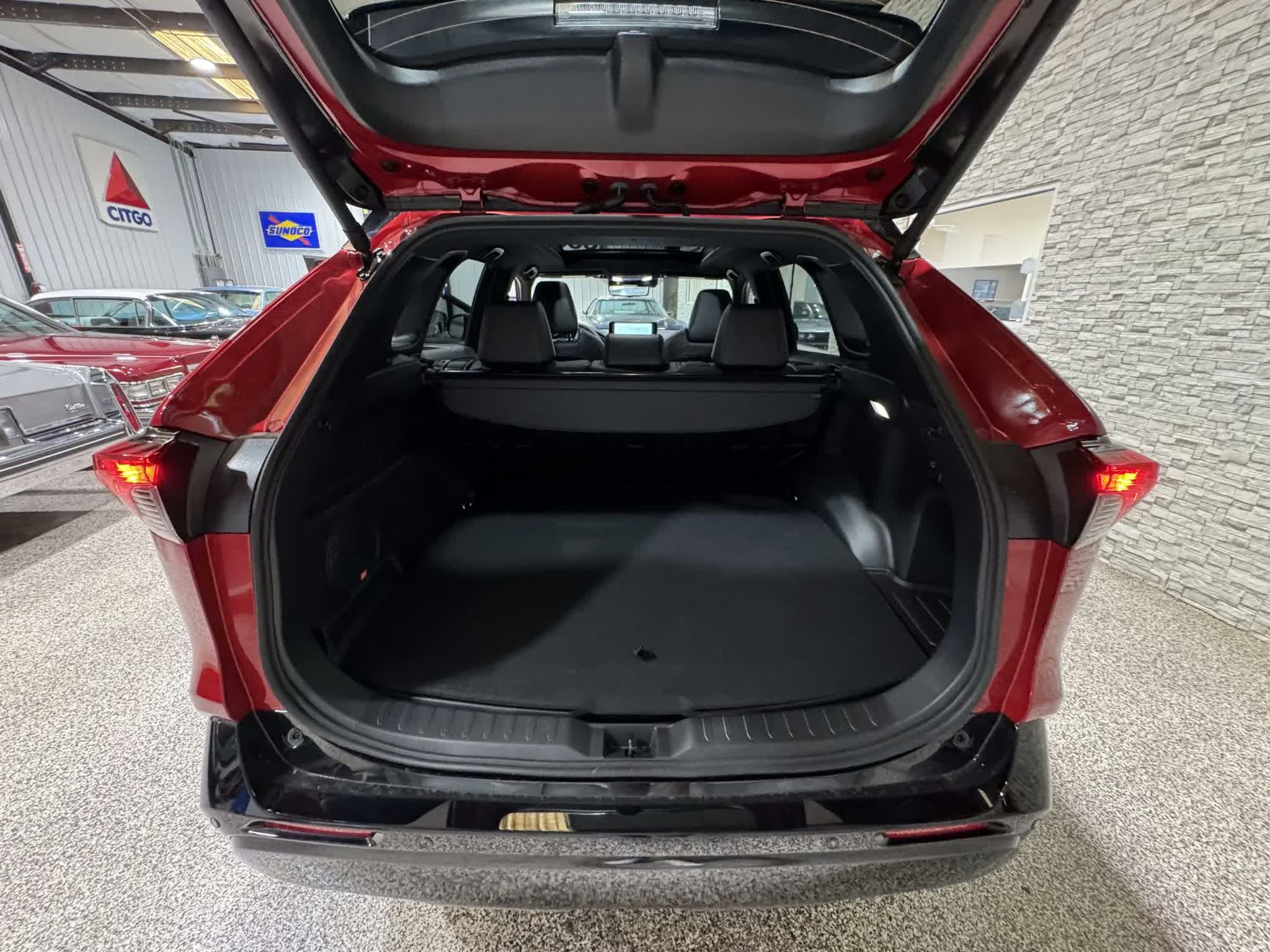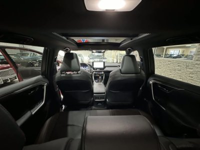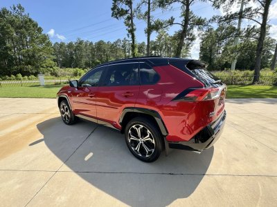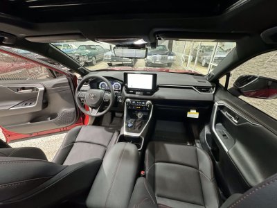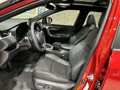 This 2024 Toyota RAV4 Prime XSE is a plug-in hybrid that has 408 miles and is finished in Supersonic Red and black over black SofTex upholstery. Power is provided by a 2.5-liter inline-four and two electric motors with an 18-kWh lithium-ion battery linked with a continuously variable transaxle and an all-wheel-drive system. Equipment includes the Premium and Weather packages, 19″ alloy wheels, a panoramic sunroof, a 360-degree camera system, heated and ventilated front seats, heated rear seats, Dynamic Radar Cruise Control, and an 11-speaker JBL sound system. Acquired by the selling dealer in 2024. The vehicle is finished in Supersonic Red with a black roof, mirror caps, and lower cladding. Exterior details include LED headlights and taillights, a panoramic sunroof, roof rails, mudguards, a rear spoiler, a 360-degree camera system, and a power-operated liftgate. The 19″ alloy wheels are mounted with Yokohama AVID GT tires. Braking is provided by four-wheel ventilated antilock discs with a regenerative braking system.