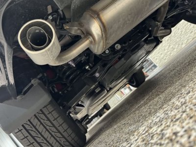 The heated and ventilated power-adjustable front seats and heated rear outboard seats are upholstered in black SofTex with red accents and stitching. Amenities include a rearview camera mirror, a wireless charger, an 11-speaker JBL sound system, and a head-up display. The infotainment system is displayed via a 10.5″ touchscreen and has wireless Apple CarPlay and Android Auto. The heated multifunction steering wheel frames a 12.3″ digital instrument cluster with a hybrid system indicator and vehicle range readout. The car is equipped with driving aids such as Dynamic Radar Cruise Control, a Pre-Collision System, and blind-spot monitoring. The odometer indicates 410 miles.