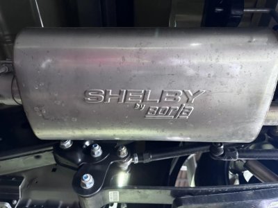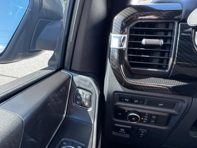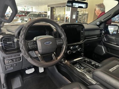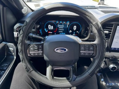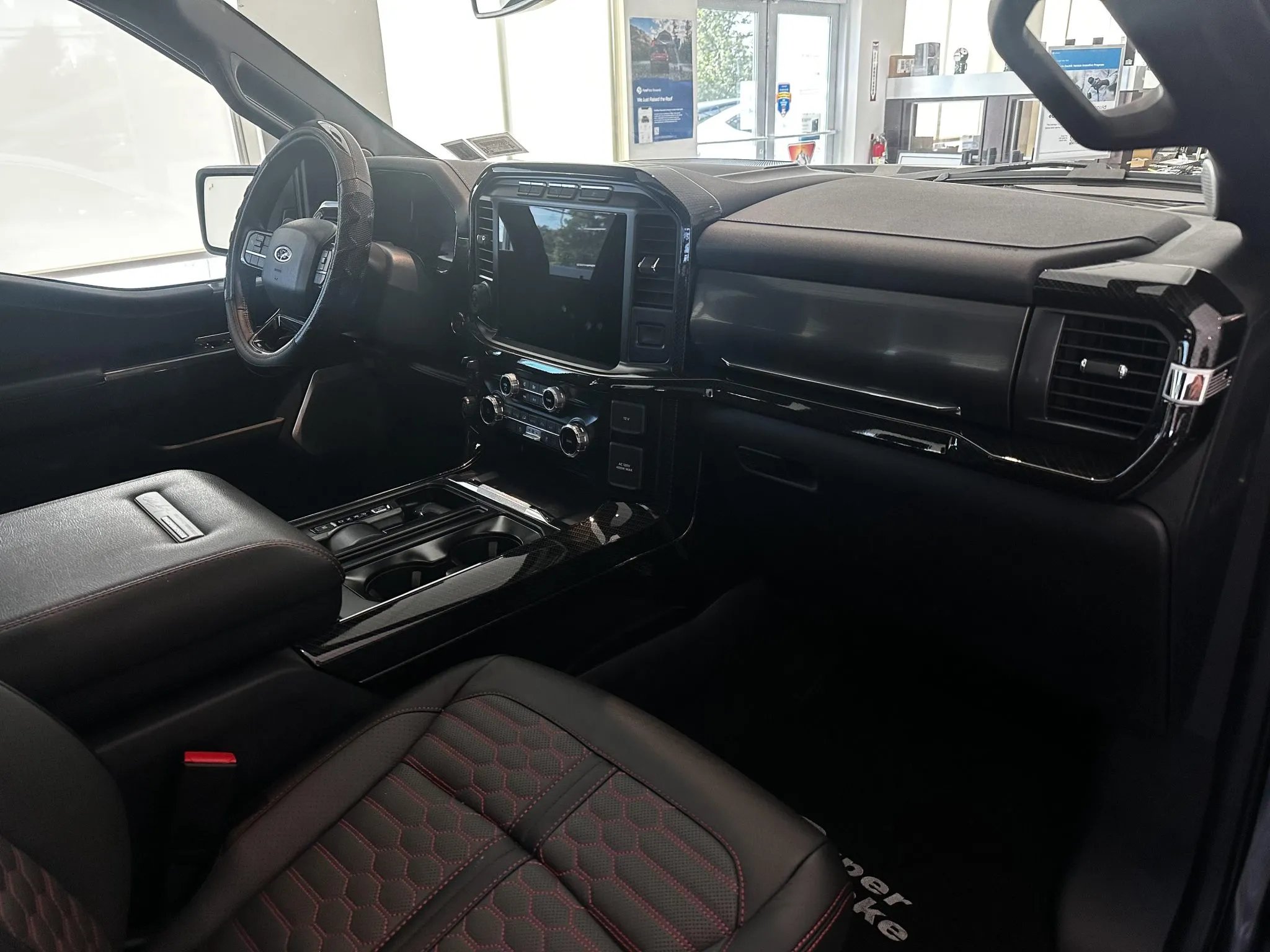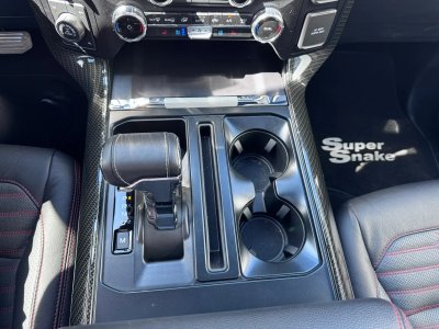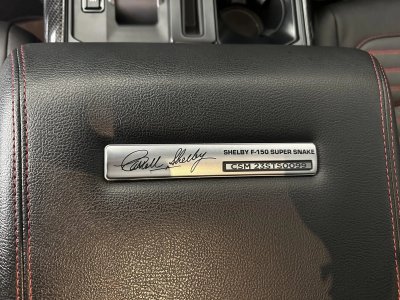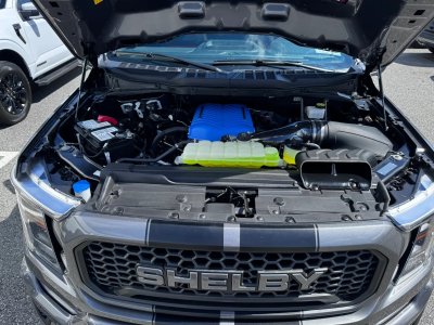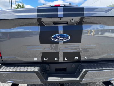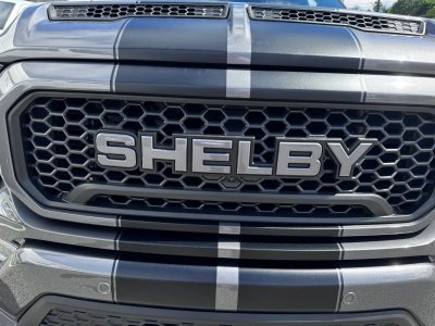 It is powered by a supercharged 5.0-liter V8 mated to a ten-speed automatic transmission and a dual-range transfer case and finished in Carbonized Gray Metallic with black stripes over black leather upholstery. It also features a Shelby-tuned Borla exhaust system, a body-color tonneau cover, a twin-panel sunroof, a dual-intake ram-air hood, Shelby badging, a lowered suspension, Shelby-branded caliper covers, black-finished 22″ Shelby wheels, carbon-fiber interior trim, a digital instrument cluster, dual-zone automatic climate control, adaptive cruise control, heated and ventilated front seats, heated rear seats, a wireless device charging pad, a 360-degree camera system, Bang & Olufsen Unleashed audio, and Pro Trailer Backup Assist. The truck is finished in Carbonized Gray Metallic and features black racing stripes and matching rocker panel stripes with Shelby lettering. Additional equipment includes a body-color tonneau cover, bumper covers, and wheel arch extensions as well as a twin-panel sunroof, a dual-intake ram-air hood, Shelby badging, parking sensors, and a receiver hitch.