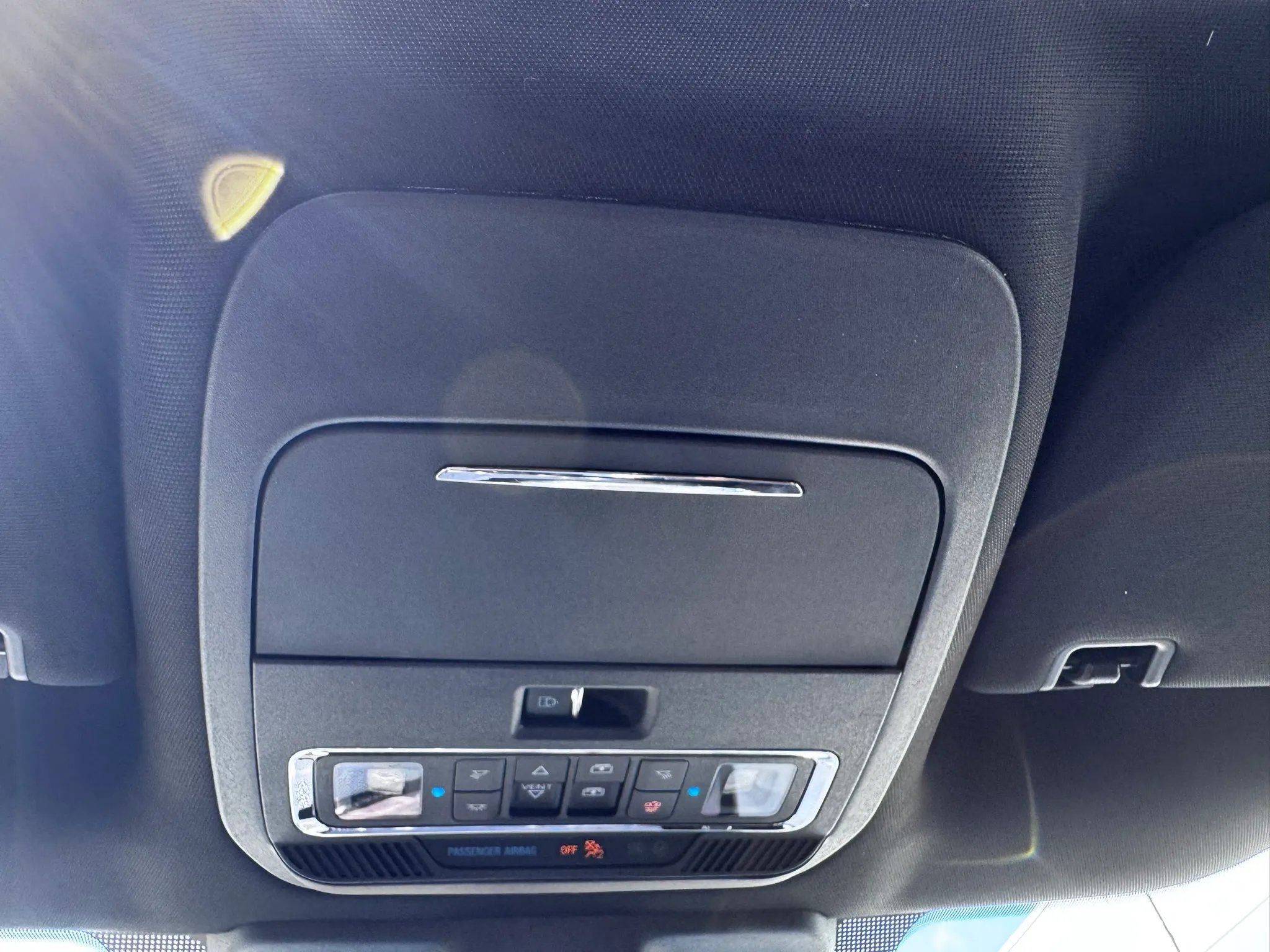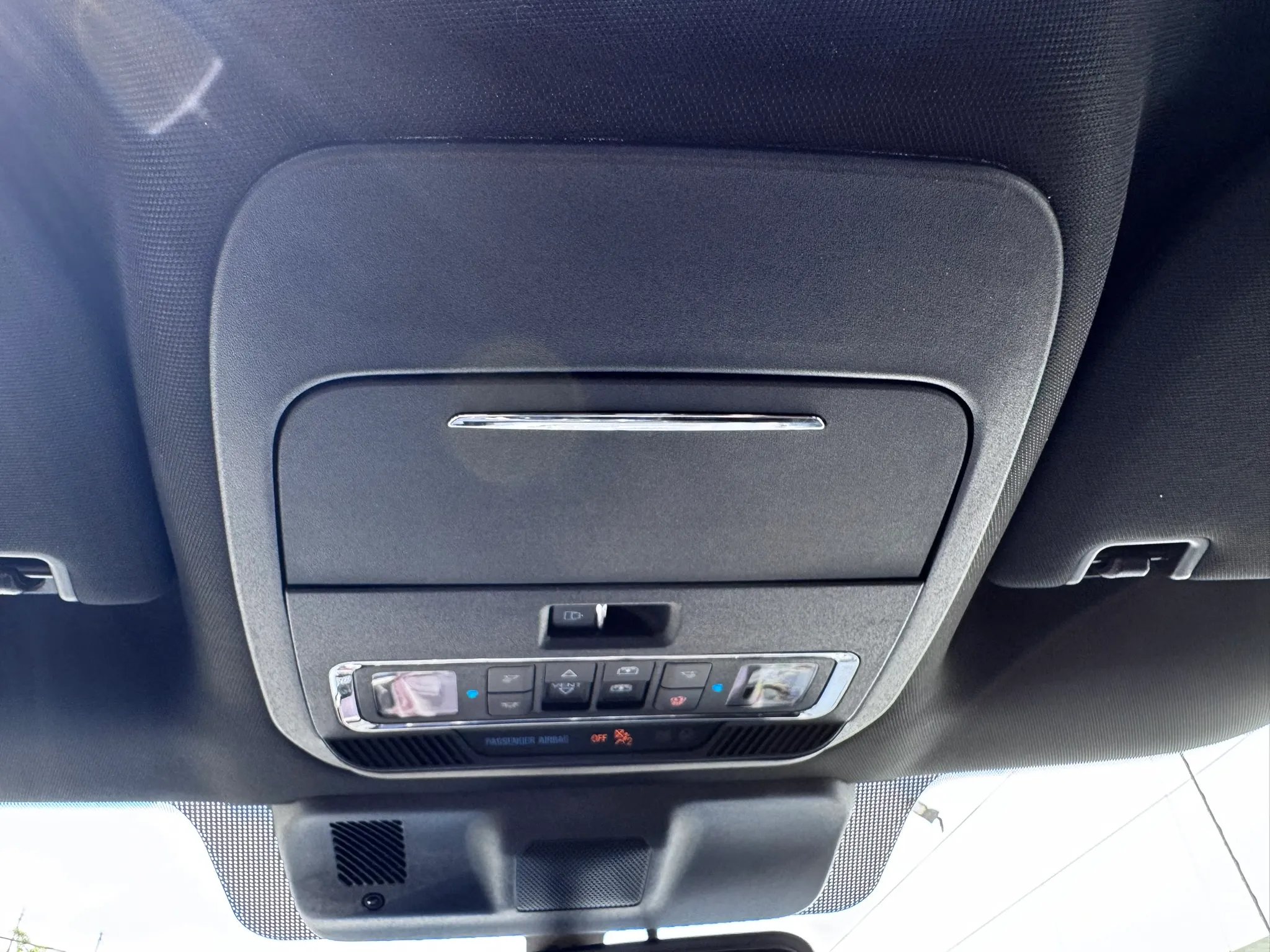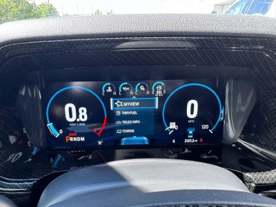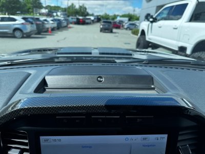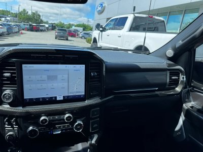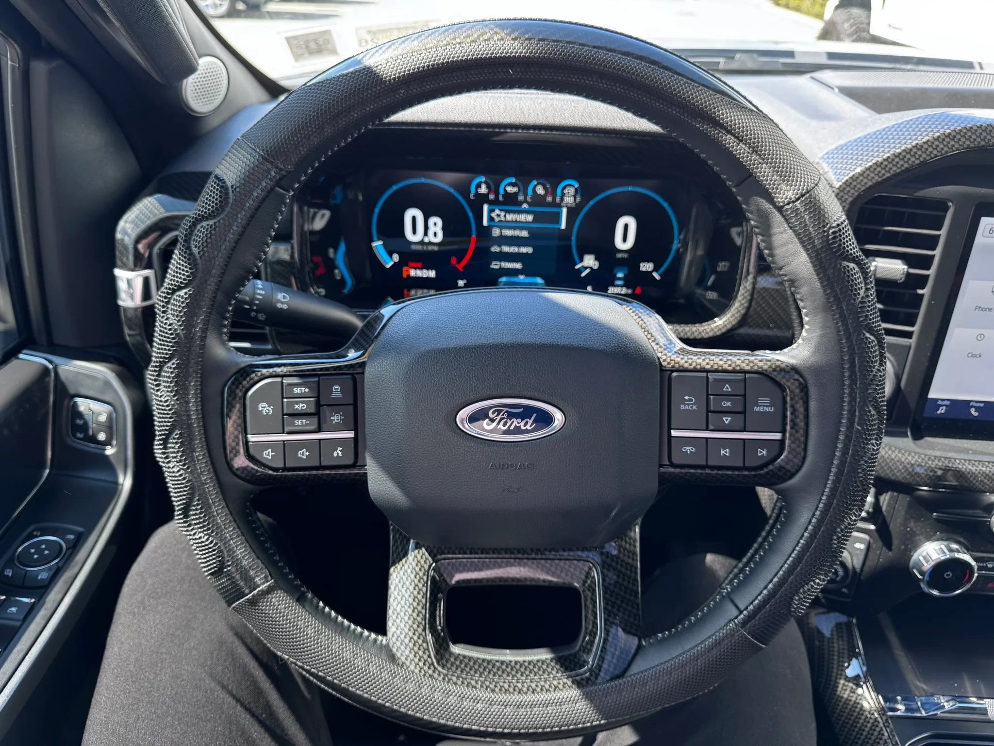 The cab features heated and ventilated front bucket seats and a heated rear bench upholstered in black leather with red accents and Shelby embroidery on the front-seat backrests. Carbon-fiber trim adorns the dashboard and center console, and additional amenities include dual-zone automatic climate control, adaptive cruise control, a wireless device charging pad, a 360-degree camera system, Bang & Olufsen Unleashed audio, Pro Trailer Backup Assist, and a trailer brake controller. The four-spoke steering wheel wears an aftermarket cover and carbon-fiber trim, and it fronts a digital instrumentation display with a 120-mph speedometer, a tachometer, and supplementary gauges. The digital odometer indicates 2,100 miles.