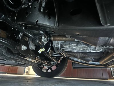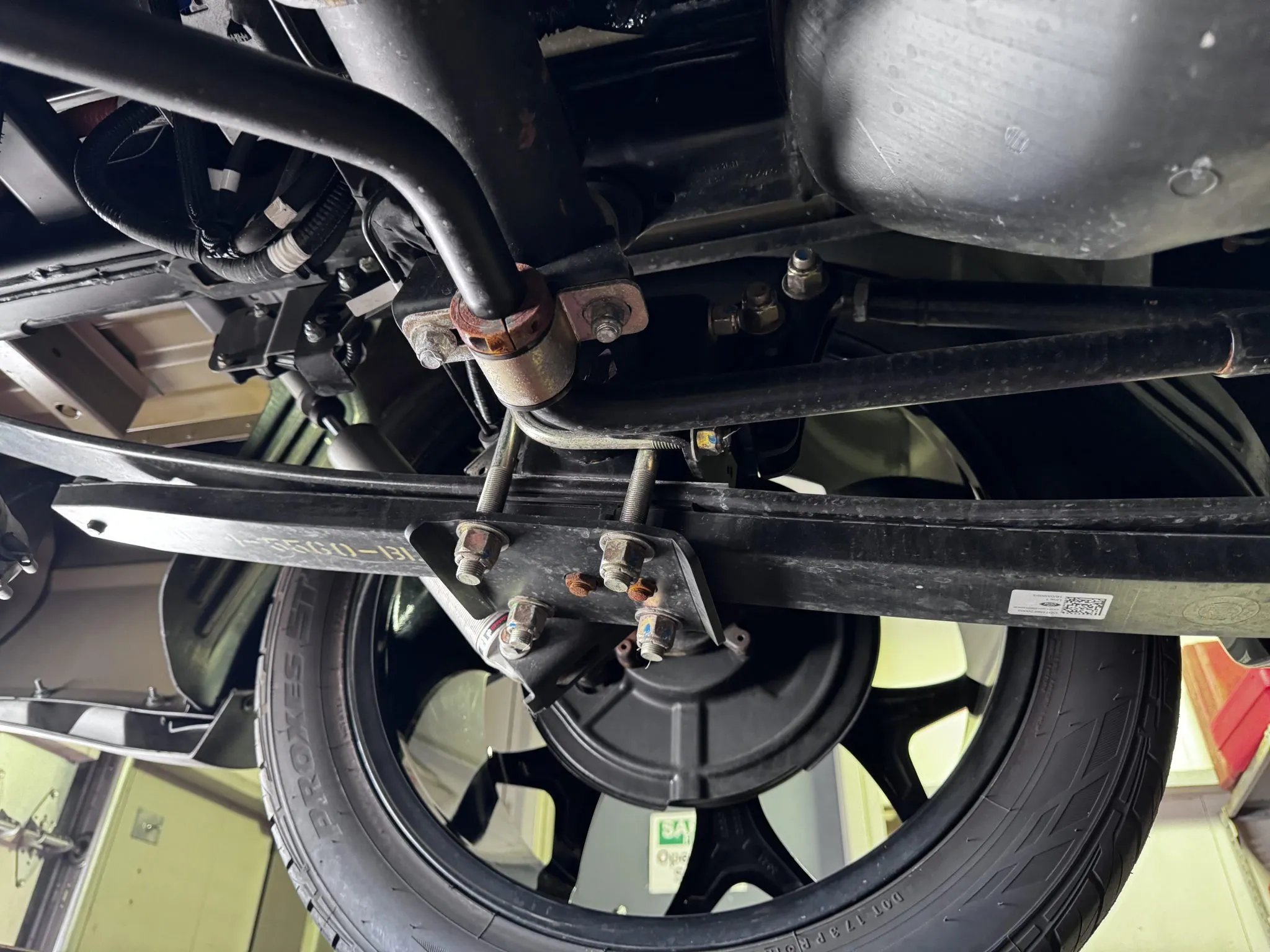 Black-finished 22″ Shelby wheels are mounted with Michelin Defender LTX M/S tires. The truck rides on a Shelby-tuned Ridetech lowered suspension, and braking is handled by four-wheel discs with red Shelby-branded caliper covers.