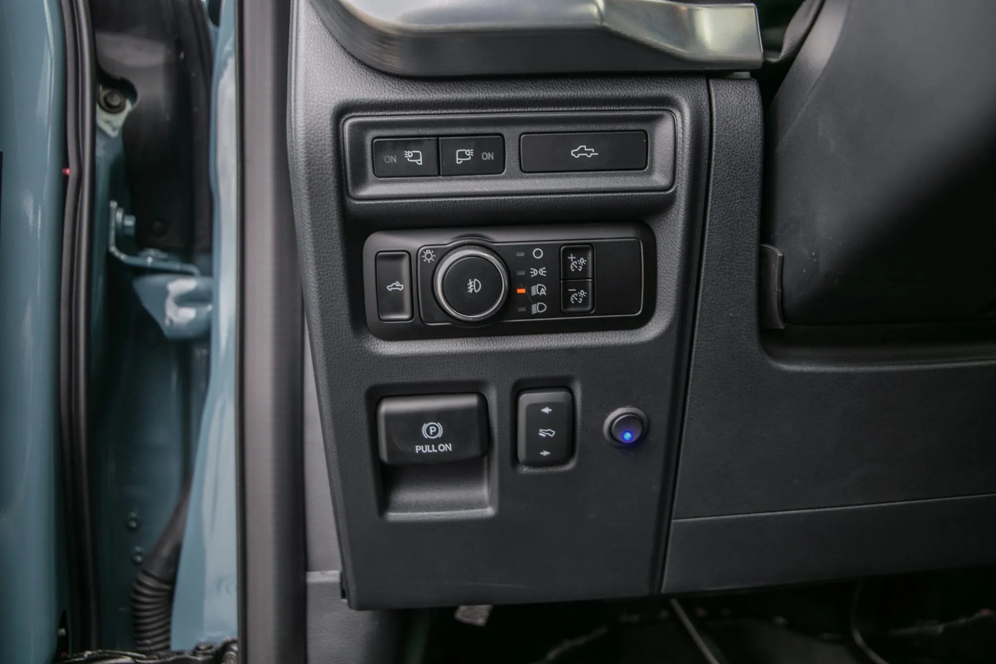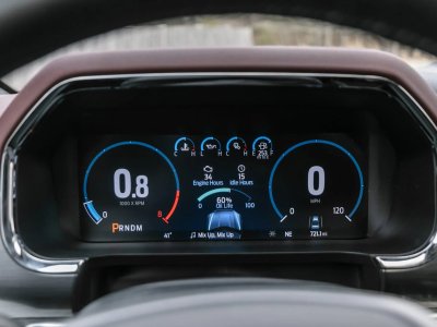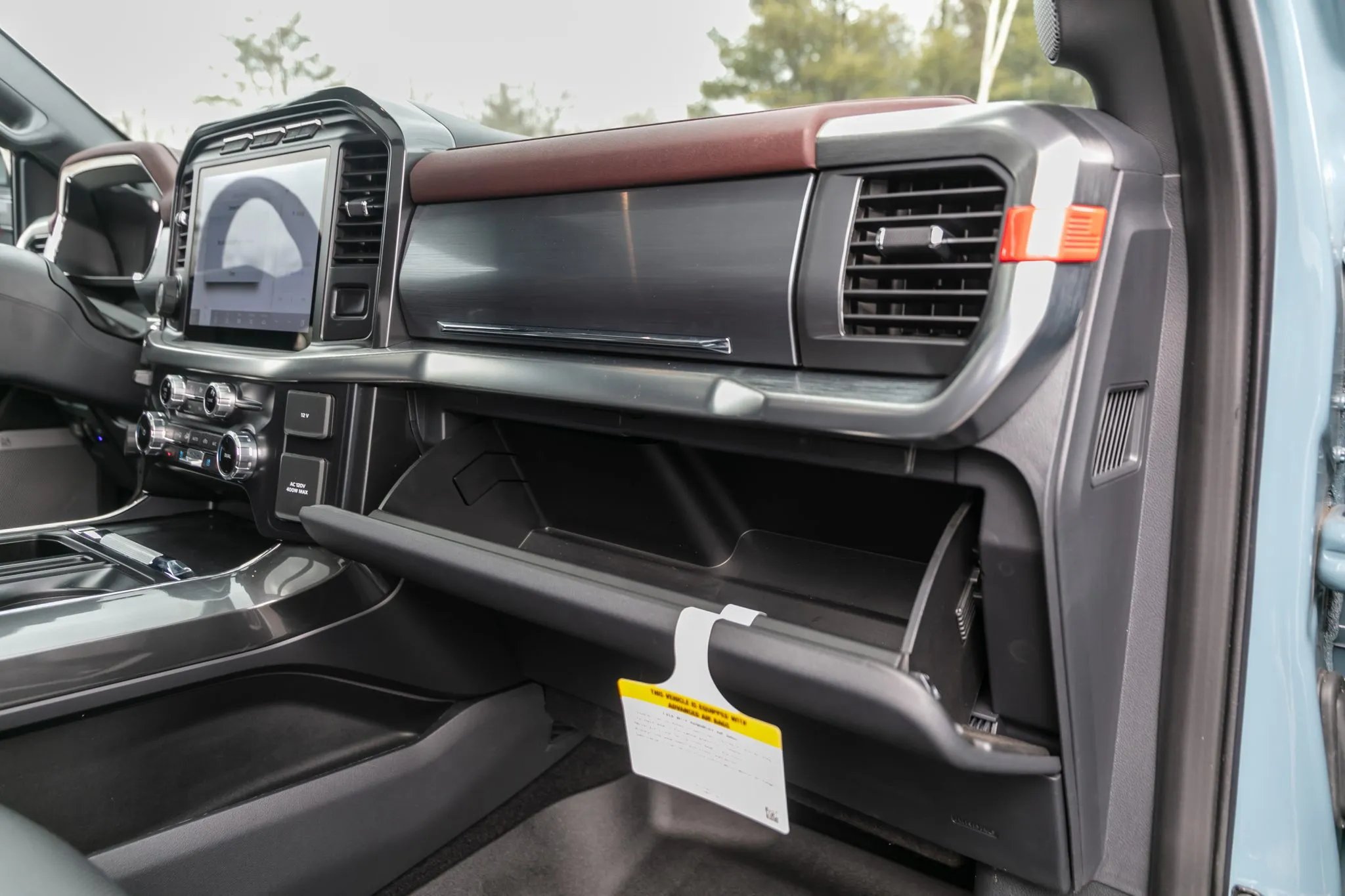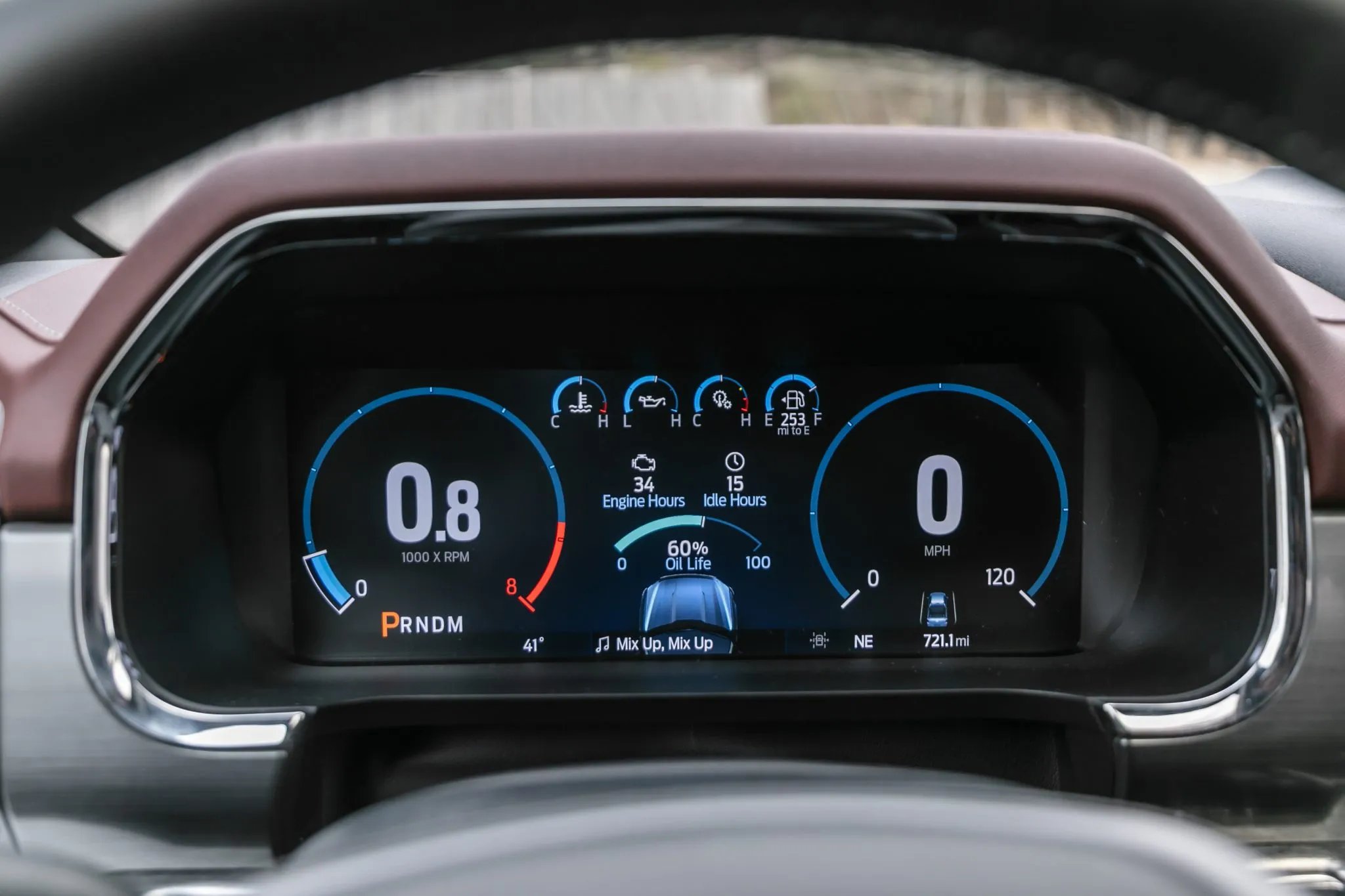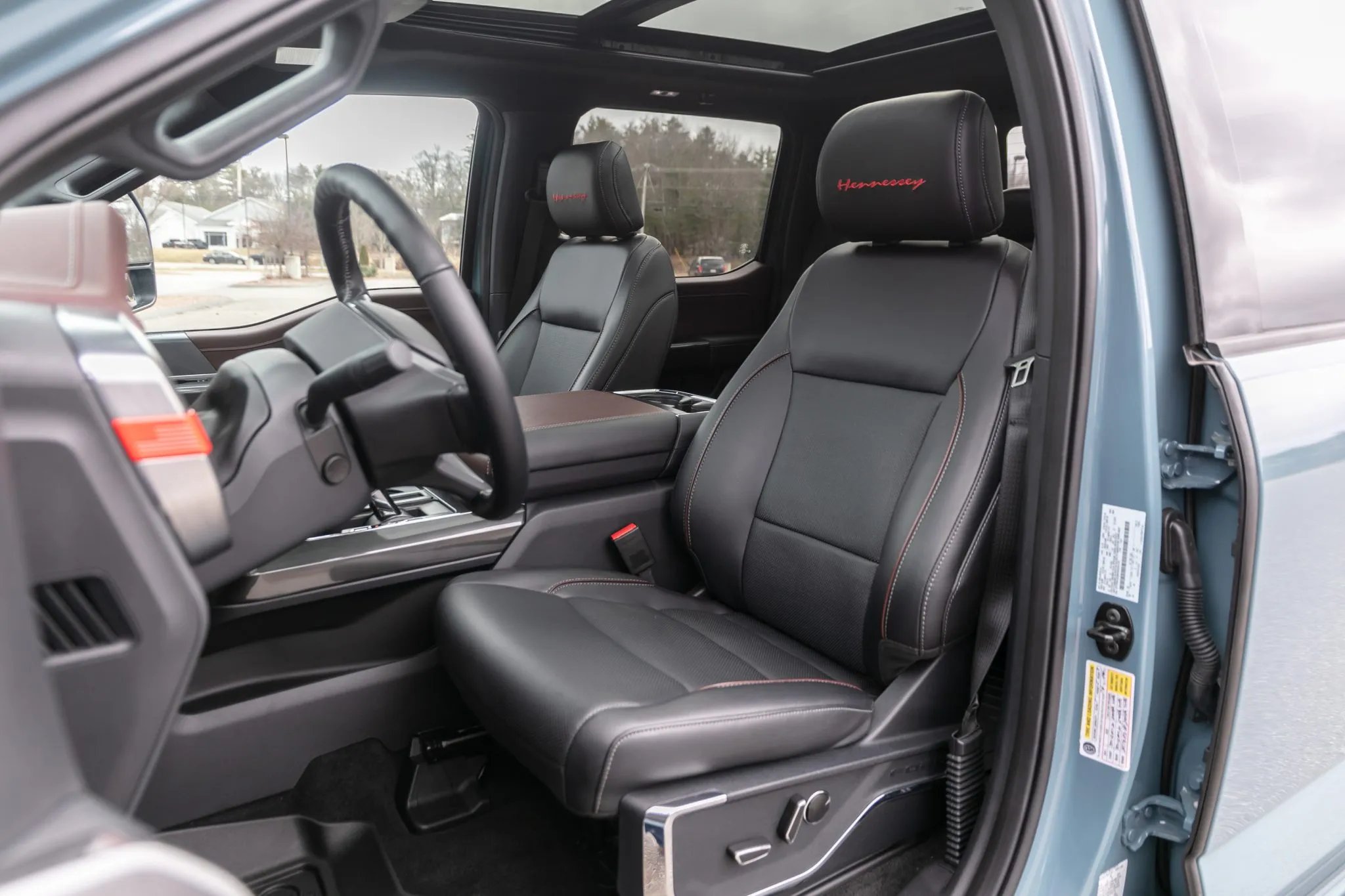The SuperCrew cabin houses heated, ventilated, and 10-way power-adjustable front bucket seats upholstered in black leather with red Hennessey headrest embroidery. Matching upholstery covers the rear bench, while contrasting brown leather extends from the dashboard to the center console storage lid and door panels. The outboard rear seats are heated, and the truck is further equipped with dual-zone automatic climate control, a remote start system, an eight-speaker Bang & Olufsen sound system, a 4G Wi-Fi hotspot, and a SYNC 4 infotainment system with a 12″ touchscreen. The multifunction steering wheel is paired with power-adjustable pedals with position memory settings. The truck is equipped with Ford Co-Pilot360 technology including lane-keep, forward-collision warning, and pre-collision assist with automatic emergency braking along with a 360-degree camera system. The digital instrument cluster incorporates an 8k-rpm tachometer, a 120-mph speedometer, auxiliary readouts, and an odometer indicating 735 miles.