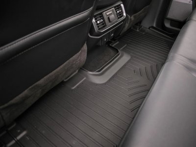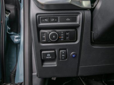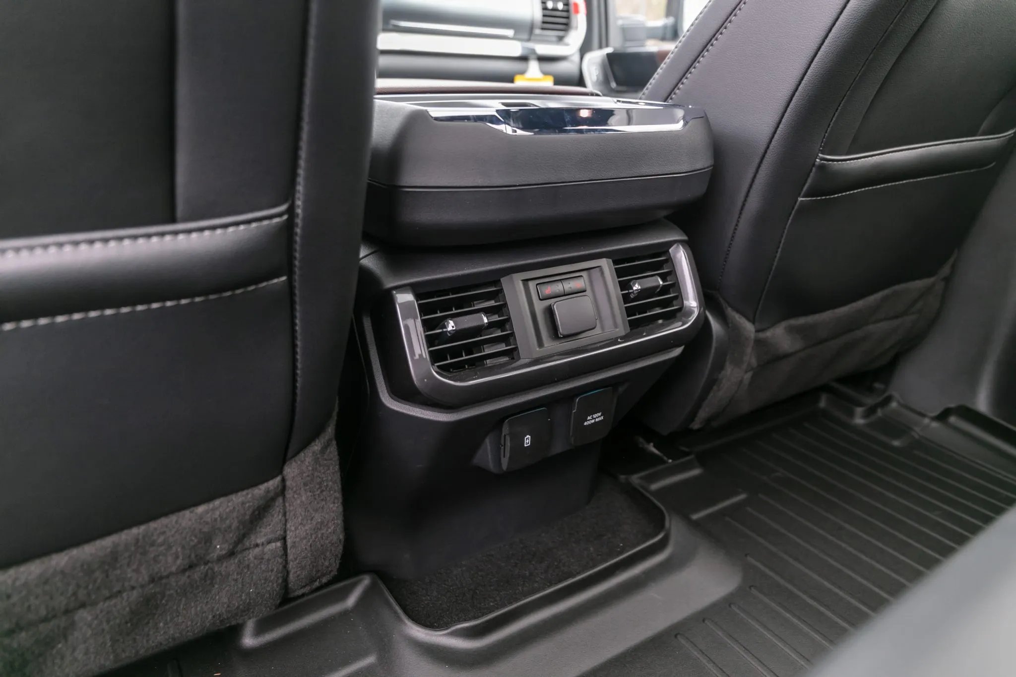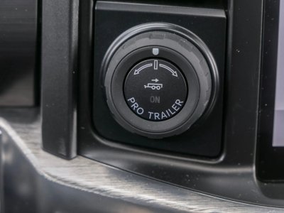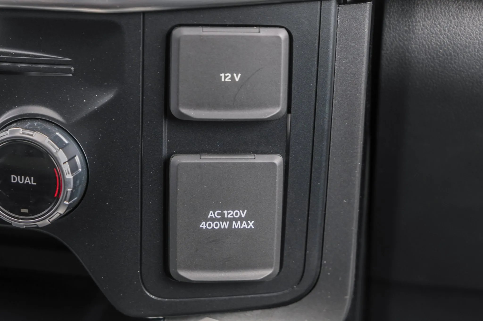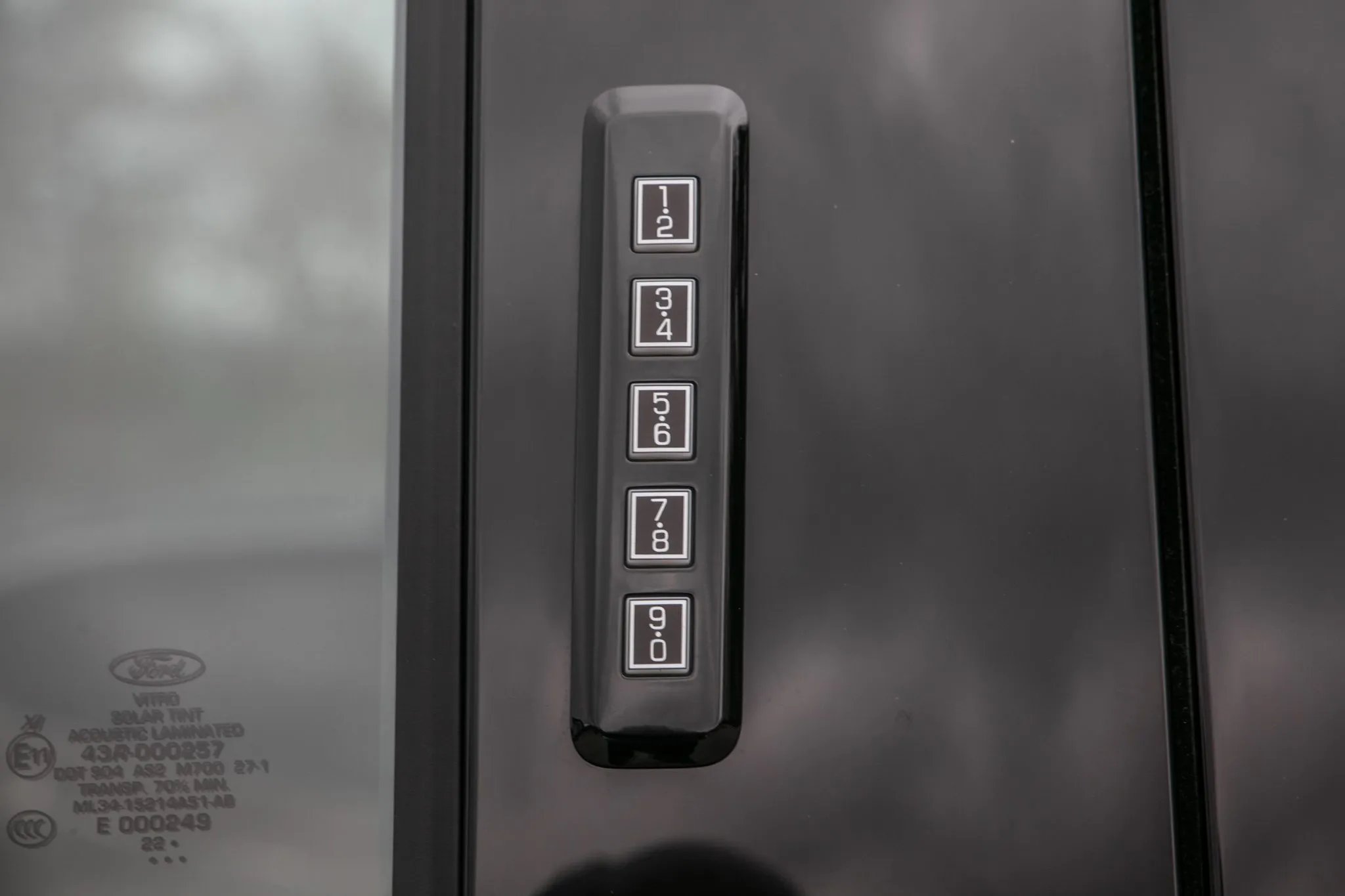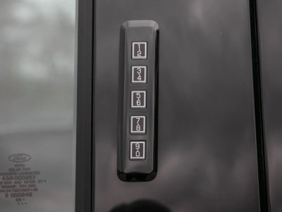 The SuperCrew cabin houses heated, ventilated, and 10-way power-adjustable front bucket seats upholstered in black leather with red Hennessey headrest embroidery. Matching upholstery covers the rear bench, while contrasting brown leather extends from the dashboard to the center console storage lid and door panels. The outboard rear seats are heated, and the truck is further equipped with dual-zone automatic climate control, a remote start system, an eight-speaker Bang & Olufsen sound system, a 4G Wi-Fi hotspot, and a SYNC 4 infotainment system with a 12″ touchscreen. The multifunction steering wheel is paired with power-adjustable pedals with position memory settings. The truck is equipped with Ford Co-Pilot360 technology including lane-keep, forward-collision warning, and pre-collision assist with automatic emergency braking along with a 360-degree camera system. The digital instrument cluster incorporates an 8k-rpm tachometer, a 120-mph speedometer, auxiliary readouts, and an odometer indicating 735 miles.