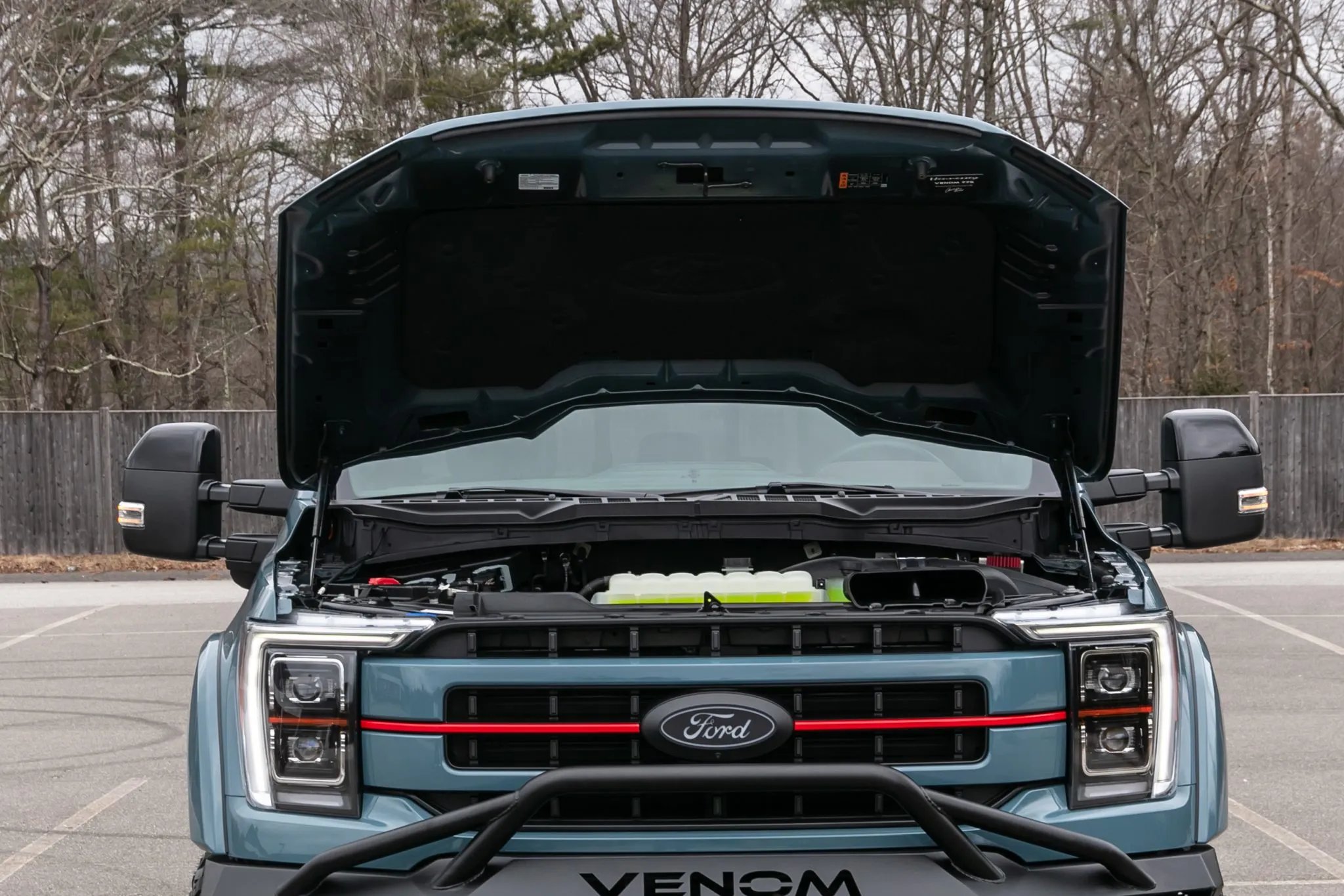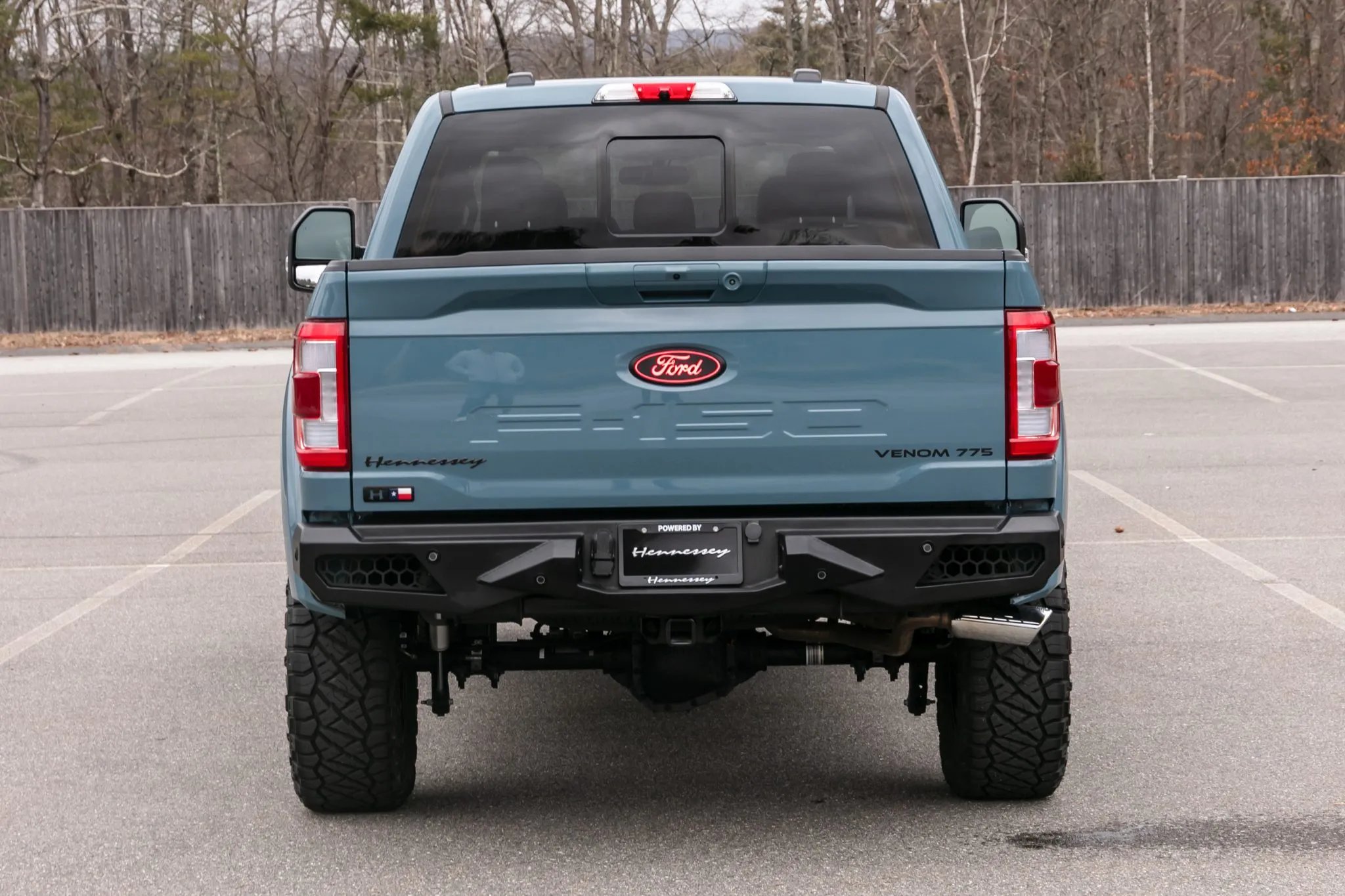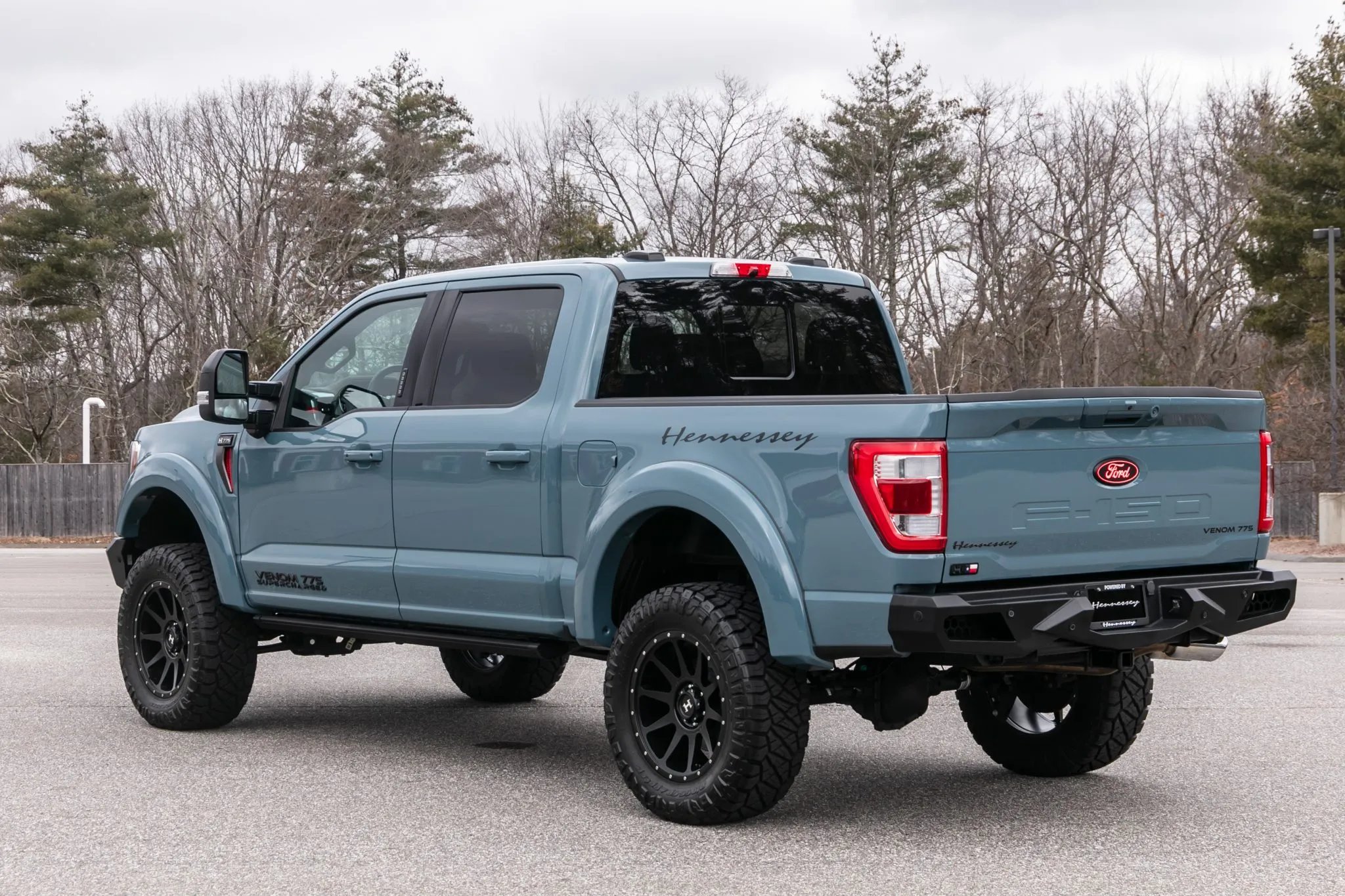 This 2023 Ford F-150 SuperCrew 4×4 pickup has been modified by Hennessey Performance Engineering of Sealy, Texas, with their Venom 775 performance package. Powertrain upgrades include adding a 3.0L Roots-type Whipple supercharger to the 5.0L Coyote V8 as well as an air-to-water intercooler system, a high-performance throttle body, a stainless-steel cat-back exhaust system, and uprated fuel system components to produce a claimed 775 horsepower and 727 lb-ft of torque. Power is sent to the rear or all four wheels via a 10-speed automatic transmission, a dual-range transfer case, and a 3.73:1 electronically locking rear differential. A 6″ BDS suspension lift and 20″ wheels wearing 35″ tires have also been added by Hennessey along with Brembo front brakes, Waldoch power-retractable running boards, a Black Oak LED light bar, and revised bumpers and wheel arch flares. The truck is finished in Area 51 Blue over black and brown leather upholstery. The Venom-branded front bumper has an integrated brush guard and houses a Black Oak LED light bar, while the Hennessey rear bumper is accompanied by a receiver hitch. Waldoch power-retractable running boards have also been added along with illuminated badging. A spray-in bed liner was optioned from the factory along with the Bed Utility Package, which added a Boxlink cargo management system, LED bed lighting, and a power-operated tailgate with an integrated step. Other exterior details include LED headlamps, fog lamps, and tail lamps along with a keyless entry keypad, a 400-watt onboard power outlet, a twin-panel sunroof, a power-sliding rear window, power-telescoping trailer mirrors, and parking sensors.