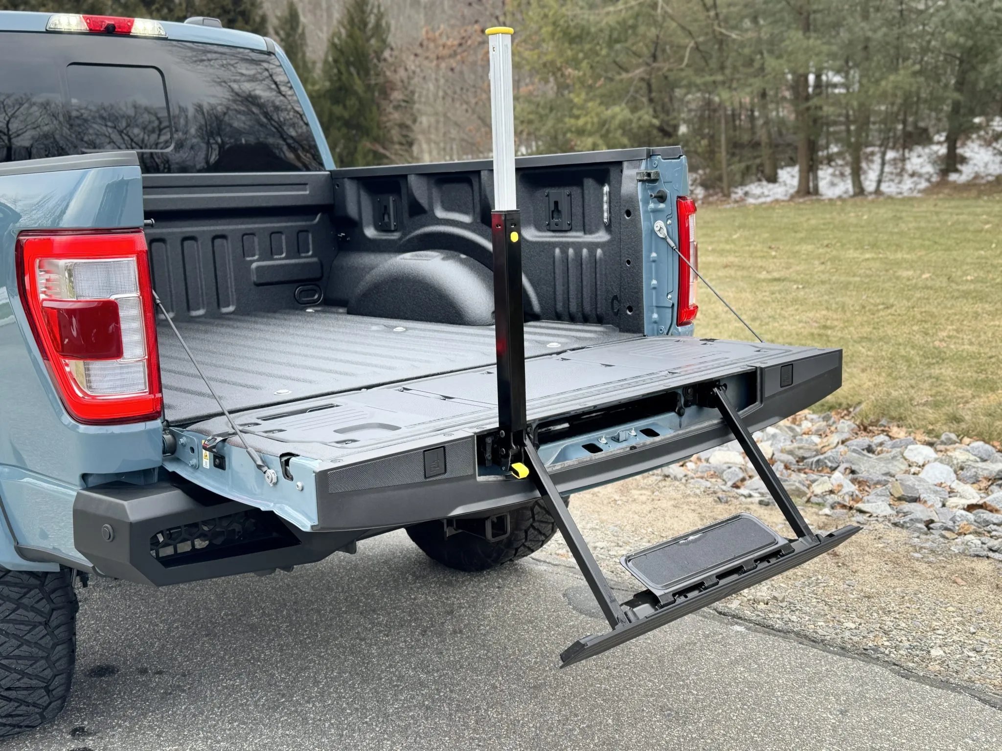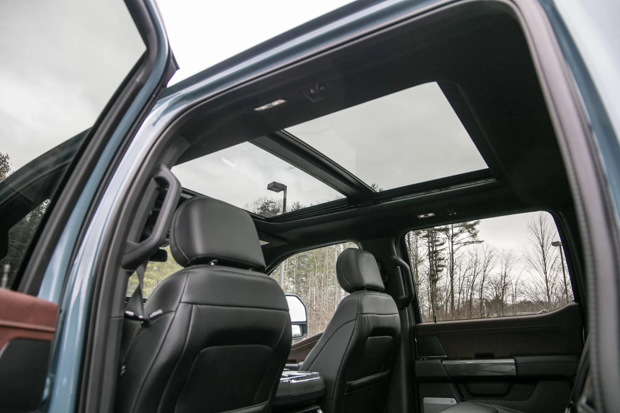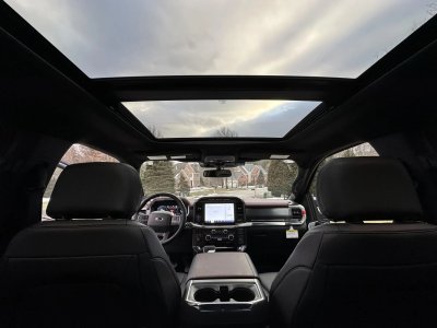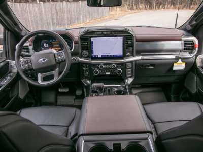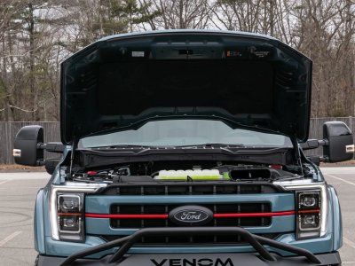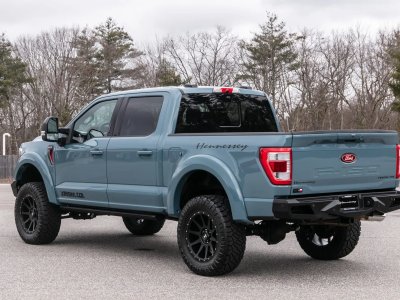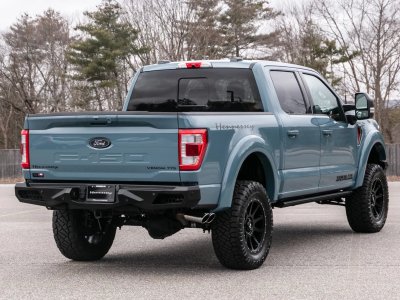 This 2023 Ford F-150 SuperCrew 4×4 pickup has been modified by Hennessey Performance Engineering of Sealy, Texas, with their Venom 775 performance package. Powertrain upgrades include adding a 3.0L Roots-type Whipple supercharger to the 5.0L Coyote V8 as well as an air-to-water intercooler system, a high-performance throttle body, a stainless-steel cat-back exhaust system, and uprated fuel system components to produce a claimed 775 horsepower and 727 lb-ft of torque. Power is sent to the rear or all four wheels via a 10-speed automatic transmission, a dual-range transfer case, and a 3.73:1 electronically locking rear differential. A 6″ BDS suspension lift and 20″ wheels wearing 35″ tires have also been added by Hennessey along with Brembo front brakes, Waldoch power-retractable running boards, a Black Oak LED light bar, and revised bumpers and wheel arch flares. The truck is finished in Area 51 Blue over black and brown leather upholstery. The Venom-branded front bumper has an integrated brush guard and houses a Black Oak LED light bar, while the Hennessey rear bumper is accompanied by a receiver hitch. Waldoch power-retractable running boards have also been added along with illuminated badging. A spray-in bed liner was optioned from the factory along with the Bed Utility Package, which added a Boxlink cargo management system, LED bed lighting, and a power-operated tailgate with an integrated step. Other exterior details include LED headlamps, fog lamps, and tail lamps along with a keyless entry keypad, a 400-watt onboard power outlet, a twin-panel sunroof, a power-sliding rear window, power-telescoping trailer mirrors, and parking sensors.