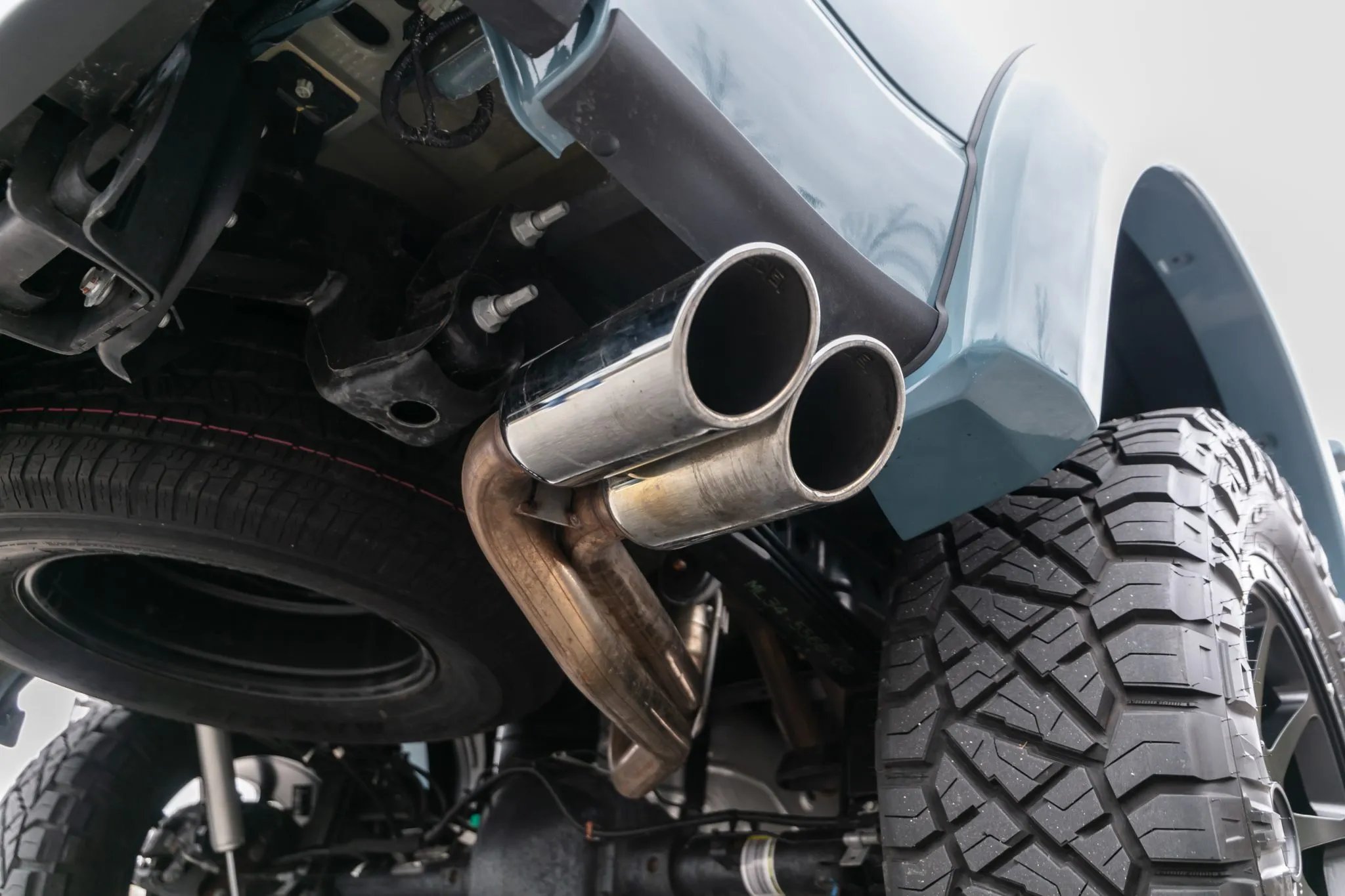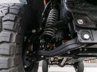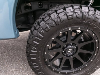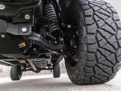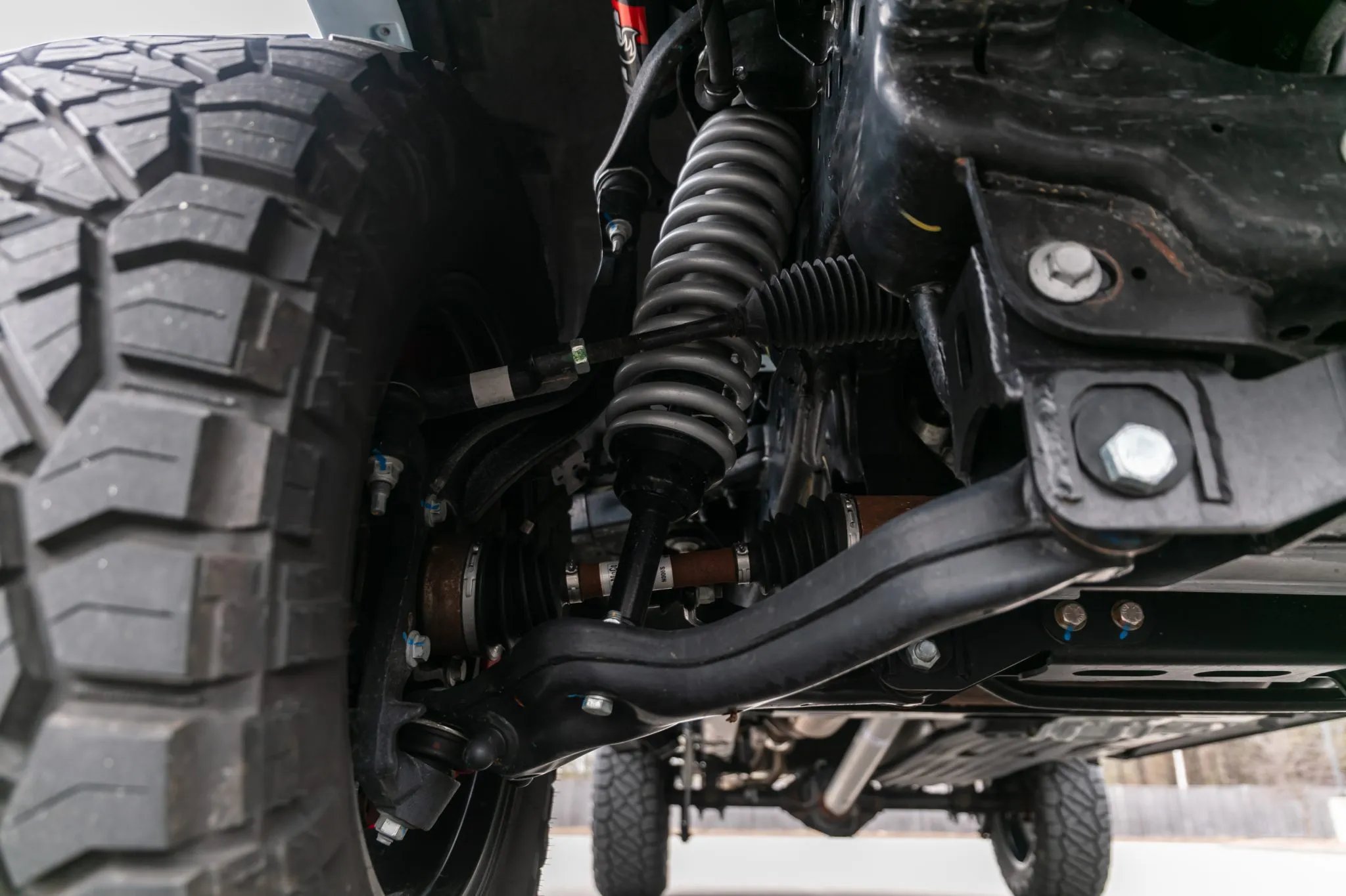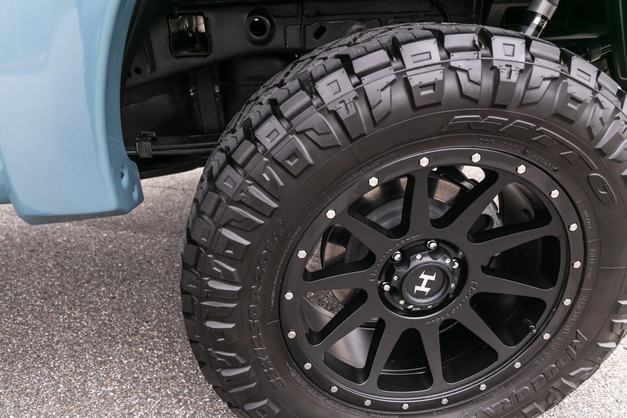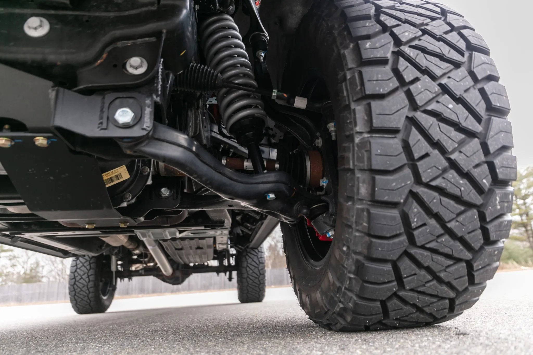 A 6″ BDS suspension lift with Fox remote-reservoir shocks provides clearance for 20″ Hennessey 10-spoke wheels that are mounted with 35×12.50″ Nitto Ridge Grappler tires. Braking is handled by four-wheel discs with red six-piston Brembo calipers squeezing cross-drilled rotors up front.