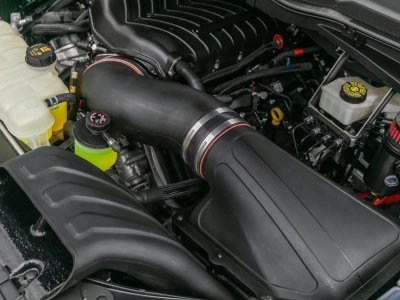 The 5.0L Coyote V8 has been fitted with 3.0L Roots-type Whipple supercharger featuring a lightweight pulley and heavy-duty tensioner. Further modifications by Hennessey include a dual-core air-to-water intercooler system, a high-performance throttle body and air filtration system, and uprated spark plugs and fuel system components. Hennessey rated output at 775 horsepower and 727 lb-ft of torque.