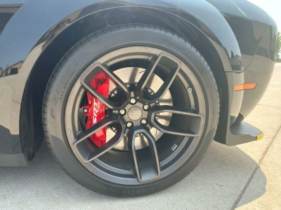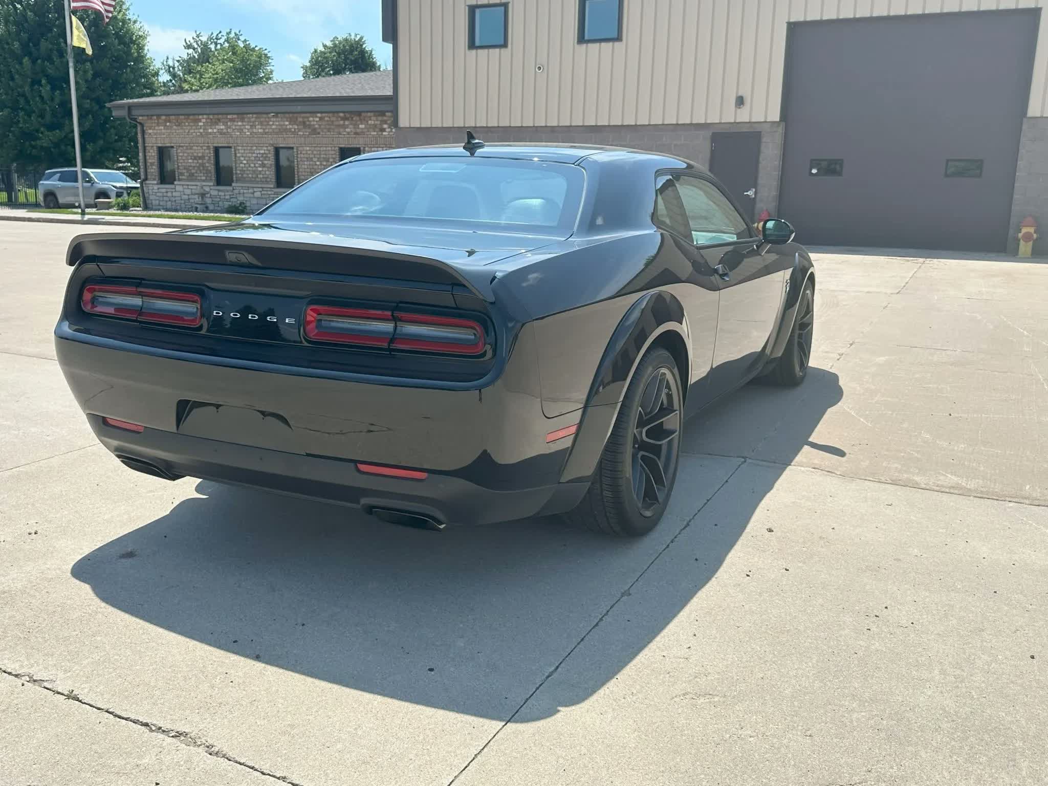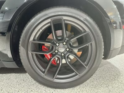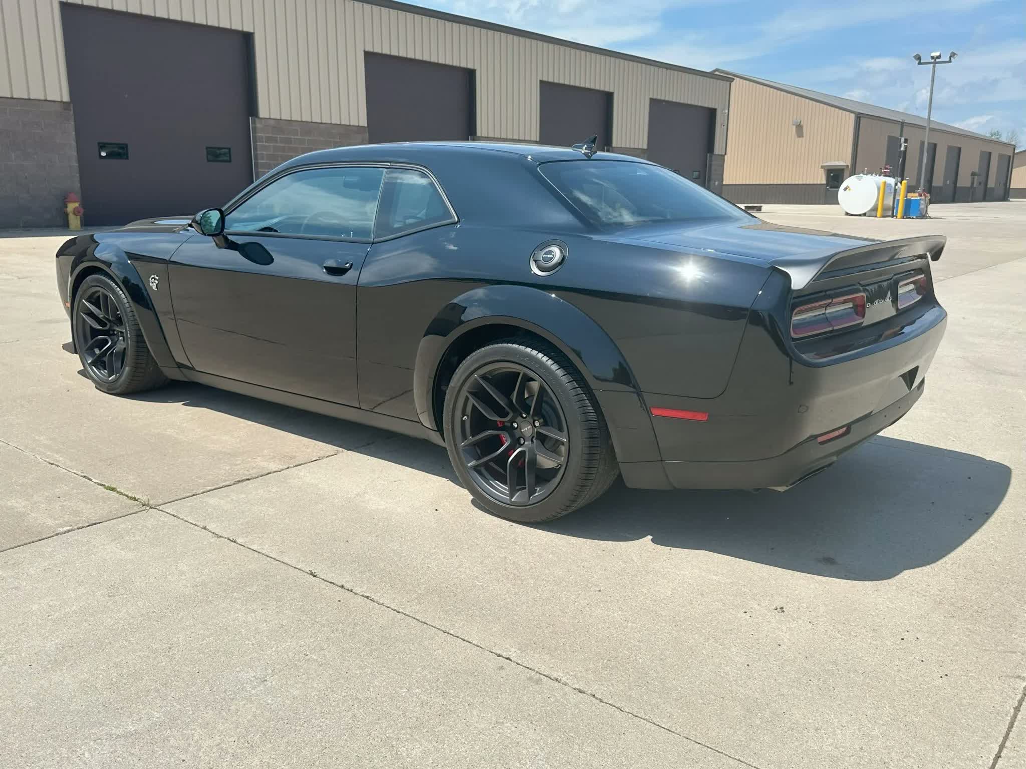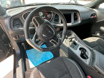 This 2023 Dodge Challenger SRT Hellcat Widebody Jailbreak is powered by a supercharged 6.2-liter V8 linked to an eight-speed automatic transmission and a limited-slip differential. Finished in black over black Nappa leather and Alcantara, the car has 2,100 miles and is equipped with Brembo brake calipers, a competition suspension, 20″ Devil’s Rim forged aluminum wheels, a power sunroof, HID Air-Catcher headlamps, widebody fenders, heated and ventilated front seats, a Harman Kardon sound system, and a Uconnect infotainment system with navigation. The car is finished in black with satin black front and rear spoilers. Additional details include HID Air-Catcher headlamps, a power sunroof, widebody fenders, an aluminum hood with dual air scoops, Hellcat fender badges, chin spoiler guards, a rearview camera, rear parking sensors, and dual exhaust outlets. Black 20″ Devil’s Rim forged aluminum wheels are mounted with Pirelli tires. The car is equipped with a Widebody competition suspension system with adaptive Bilstein dampers. Braking is handled by red-finished six-piston front and four-piston rear Brembo calipers.