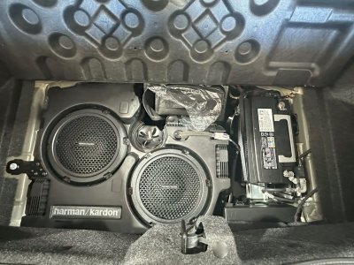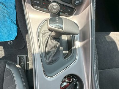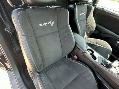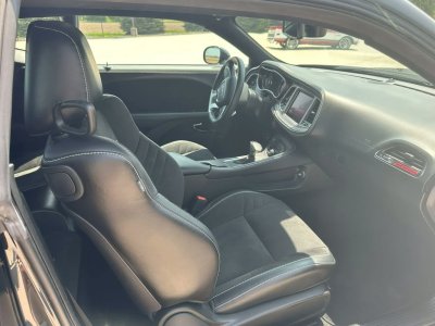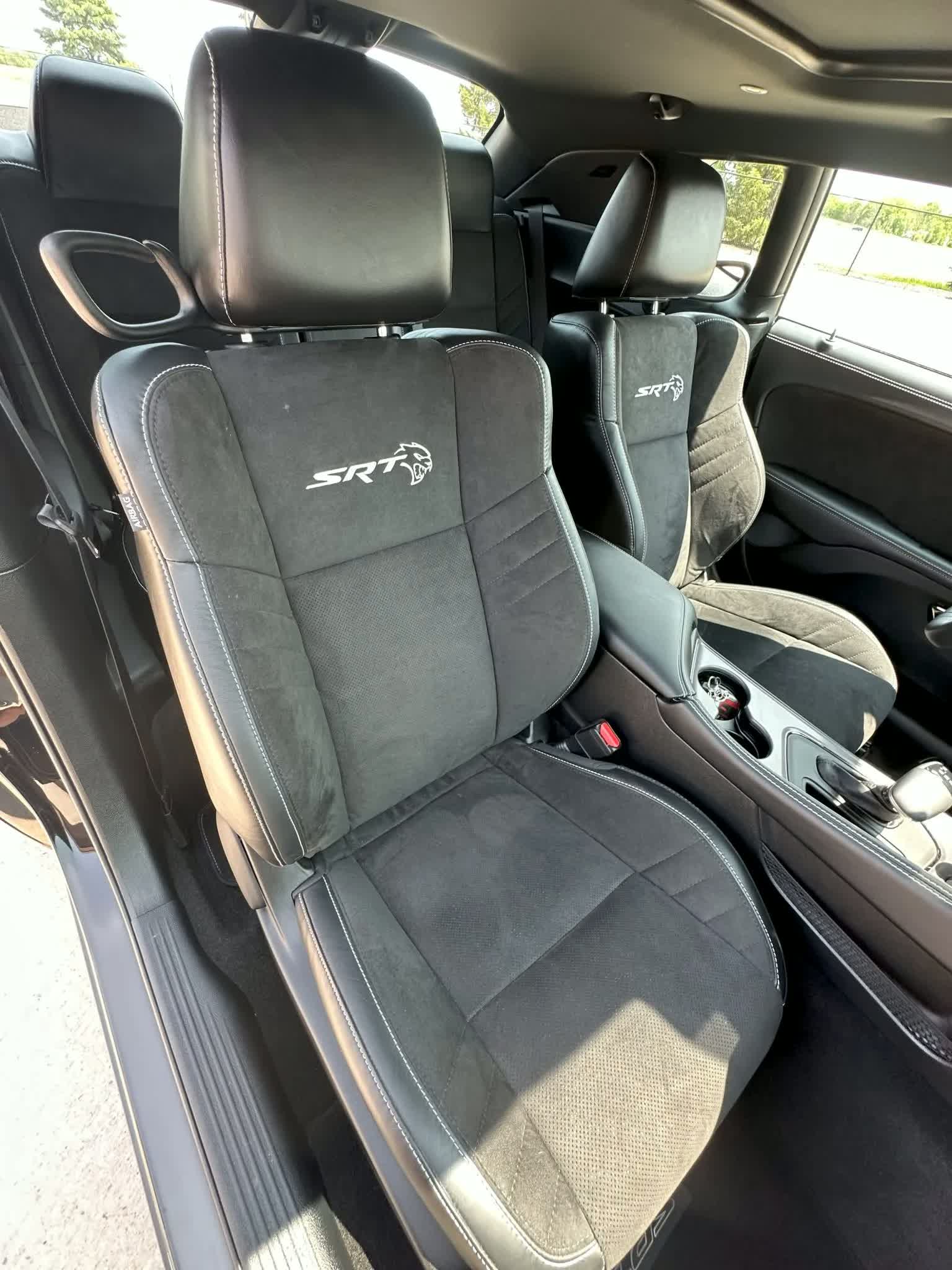 The heated and ventilated front seats are upholstered in black Nappa leather and Alcantara with embossed Hellcat logos on the front backrests. Amenities include driver-seat power adjustability, a folding rear seat, keyless entry, push-button start, Jailbreak badging, a Uconnect infotainment system, a Harman Kardon sound system, and dual-zone automatic climate control. The leather-wrapped steering wheel frames a red 200-mph speedometer and 7k-rpm tachometer along with a configurable digital display. The digital odometer indicates 2,100 miles.