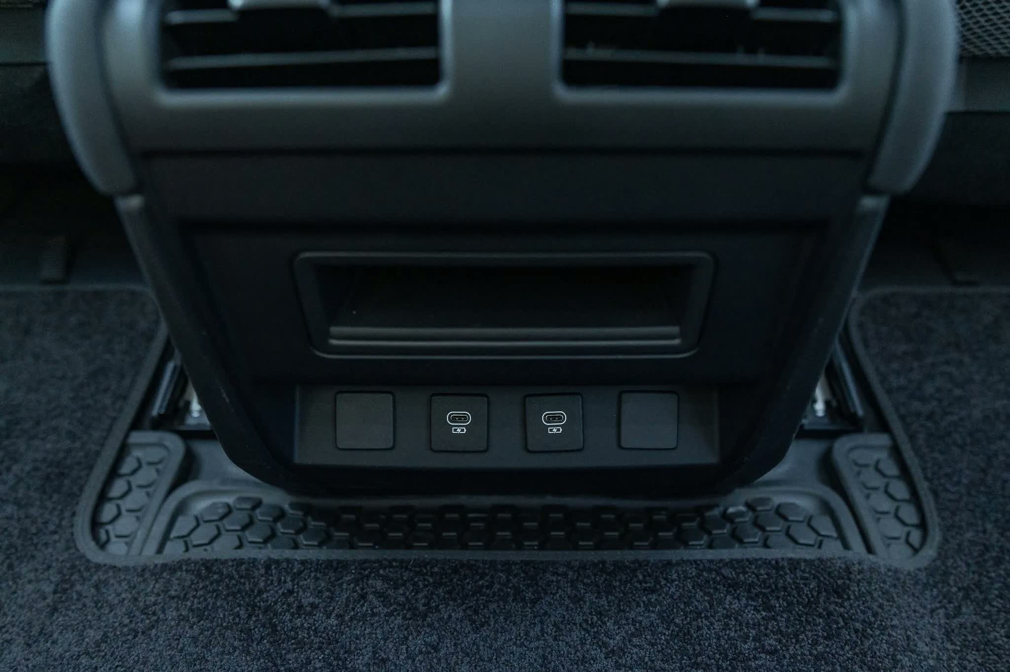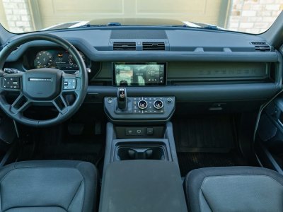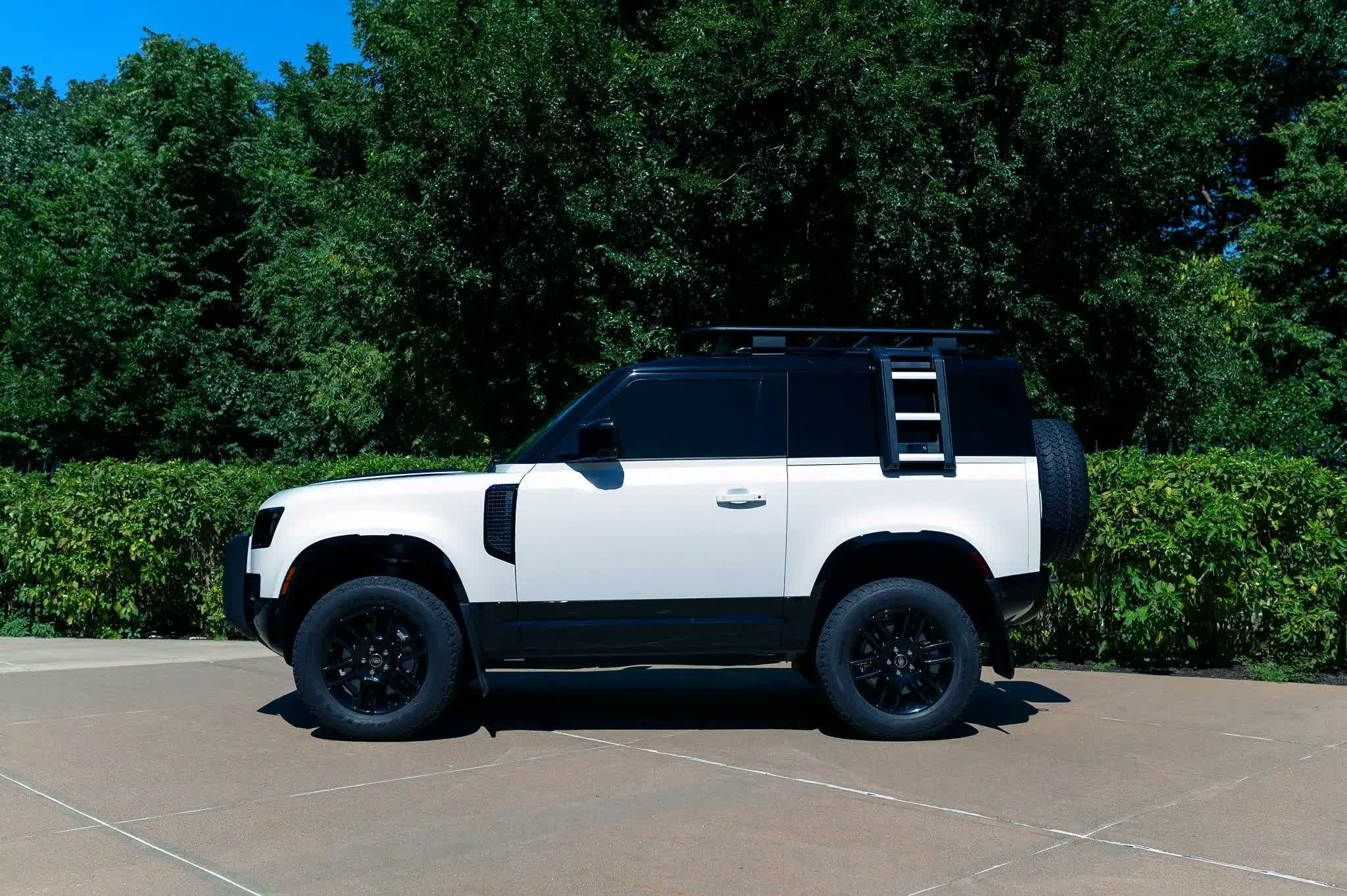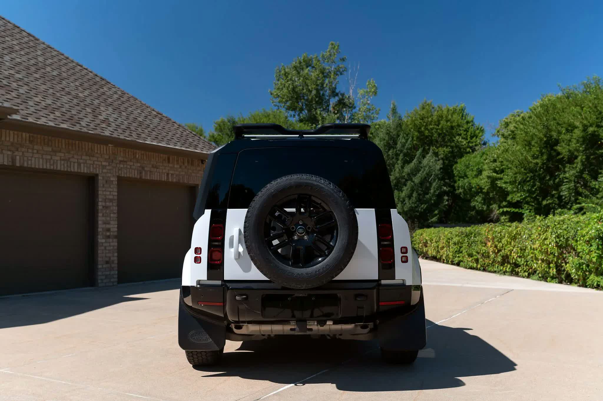 The truck is finished in Fuji White with the Extended Black Exterior Pack that features a gloss black grille, Defender script, checkerplate trim, and fender vents. Additional exterior details include a 360-degree camera system, fog lights, rain-sensing wipers, mud flaps, a panoramic sunroof, a receiver hitch, and a cargo rack with an access ladder. The truck is optioned with the Cold Climate Pack, which adds a heated windshield, wiper jets, and headlight washers. Gloss-black 19″ wheels are wrapped in 255/65 Goodyear Wrangler All-Terrain Adventure tires, and a matching spare is mounted on the rear door. The truck is equipped with the Terrain Response 2 system, Hill Descent Control, and the Air Suspension Package, which features an electronic air suspension, Adaptive Dynamics, and automatic headlight leveling. The cabin features heated front seats and a split-folding rear bench upholstered in Ebony Grain Leather Robustec upholstery over all-weather flooring. Amenities include dual-zone climate control, a surround-view camera, a Meridian sound system, and a 10.1″ infotainment system with navigation, Apple CarPlay, and Android Auto.