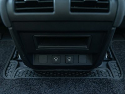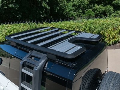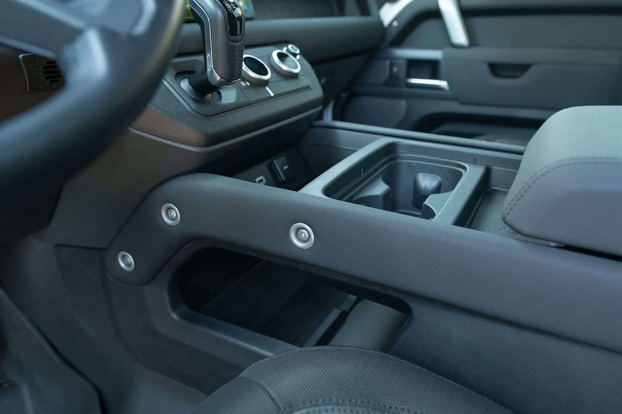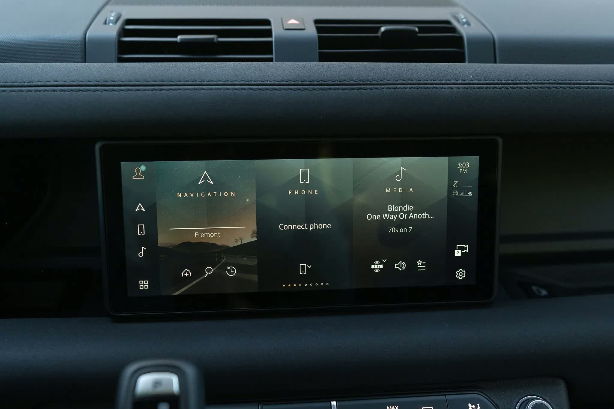 The truck is finished in Fuji White with the Extended Black Exterior Pack that features a gloss black grille, Defender script, checkerplate trim, and fender vents. Additional exterior details include a 360-degree camera system, fog lights, rain-sensing wipers, mud flaps, a panoramic sunroof, a receiver hitch, and a cargo rack with an access ladder. The truck is optioned with the Cold Climate Pack, which adds a heated windshield, wiper jets, and headlight washers. Gloss-black 19″ wheels are wrapped in 255/65 Goodyear Wrangler All-Terrain Adventure tires, and a matching spare is mounted on the rear door. The truck is equipped with the Terrain Response 2 system, Hill Descent Control, and the Air Suspension Package, which features an electronic air suspension, Adaptive Dynamics, and automatic headlight leveling. The cabin features heated front seats and a split-folding rear bench upholstered in Ebony Grain Leather Robustec upholstery over all-weather flooring. Amenities include dual-zone climate control, a surround-view camera, a Meridian sound system, and a 10.1″ infotainment system with navigation, Apple CarPlay, and Android Auto.