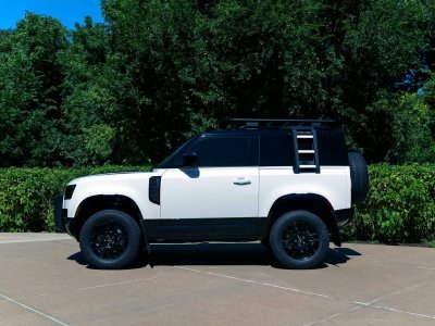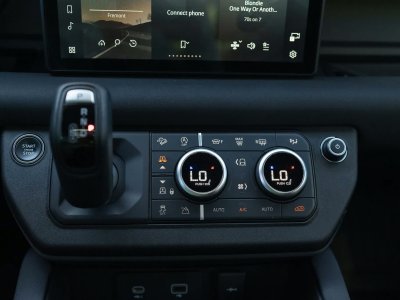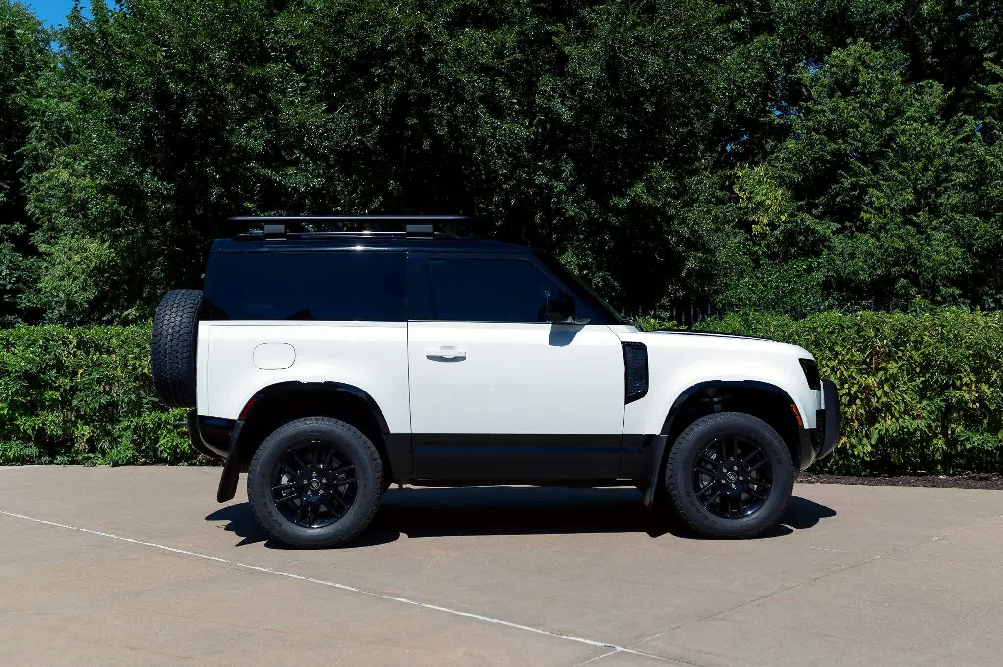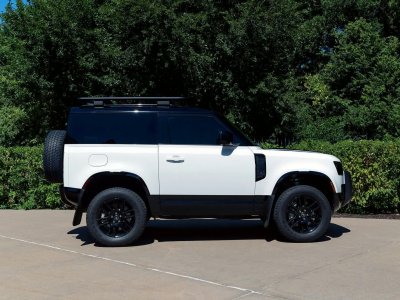 This 2023 Land Rover Defender 90 X-Dynamic SE is finished in Fuji White over Ebony and is powered by a turbocharged and supercharged 3.0L inline-six linked to an eight-speed automatic transmission, a dual-range transfer case, and a 48-volt mild hybrid system. Features include the Cold Climate, Off-Road, and Air Suspension packages along with black-finished 19″ wheels, a roof rack, a 360-degree camera system, a panoramic sunroof, a winch, automatic climate control, heated and cooled front seats, a Meridian sound system, and touchscreen infotainment with navigation and smartphone connectivity.