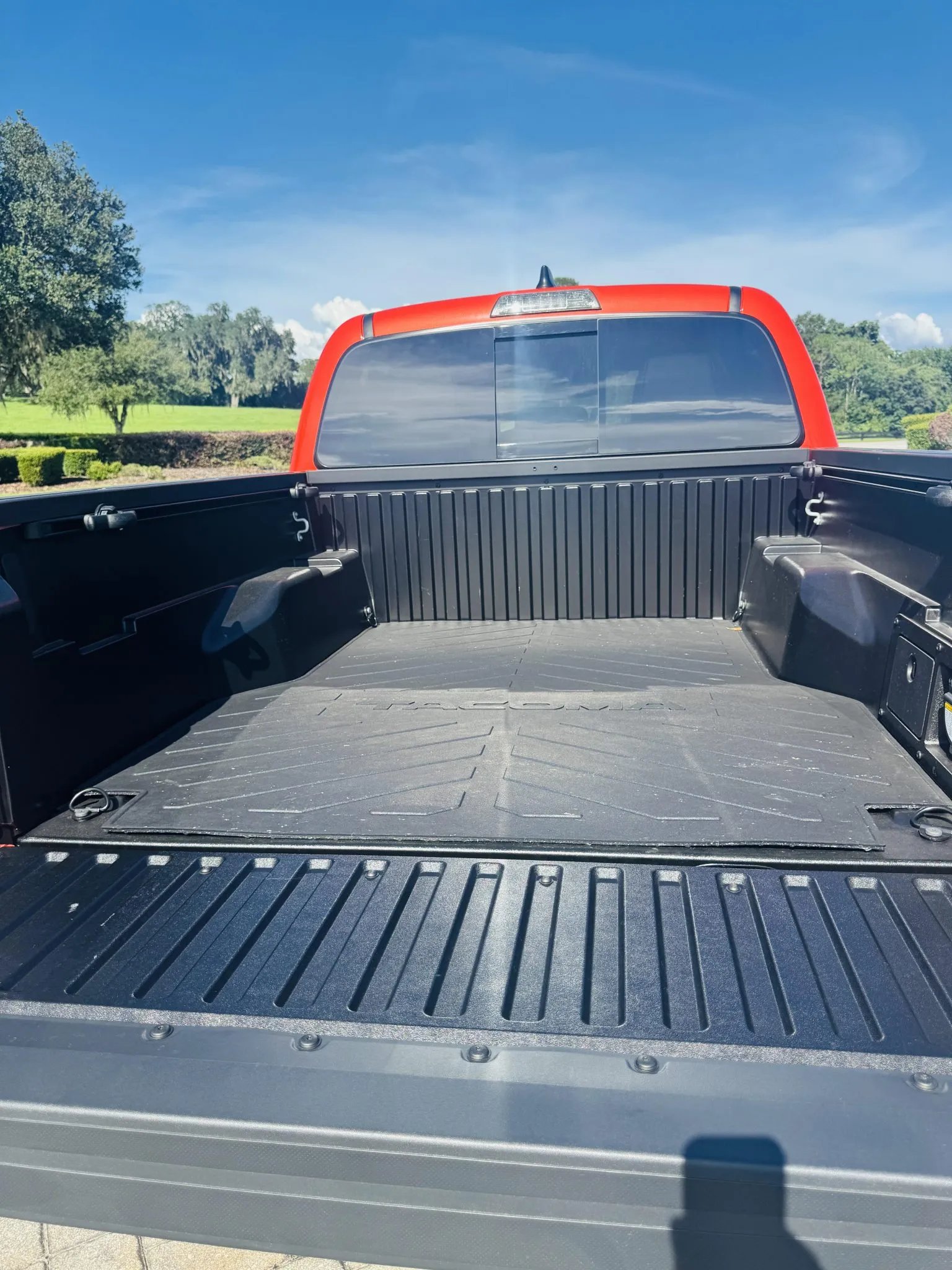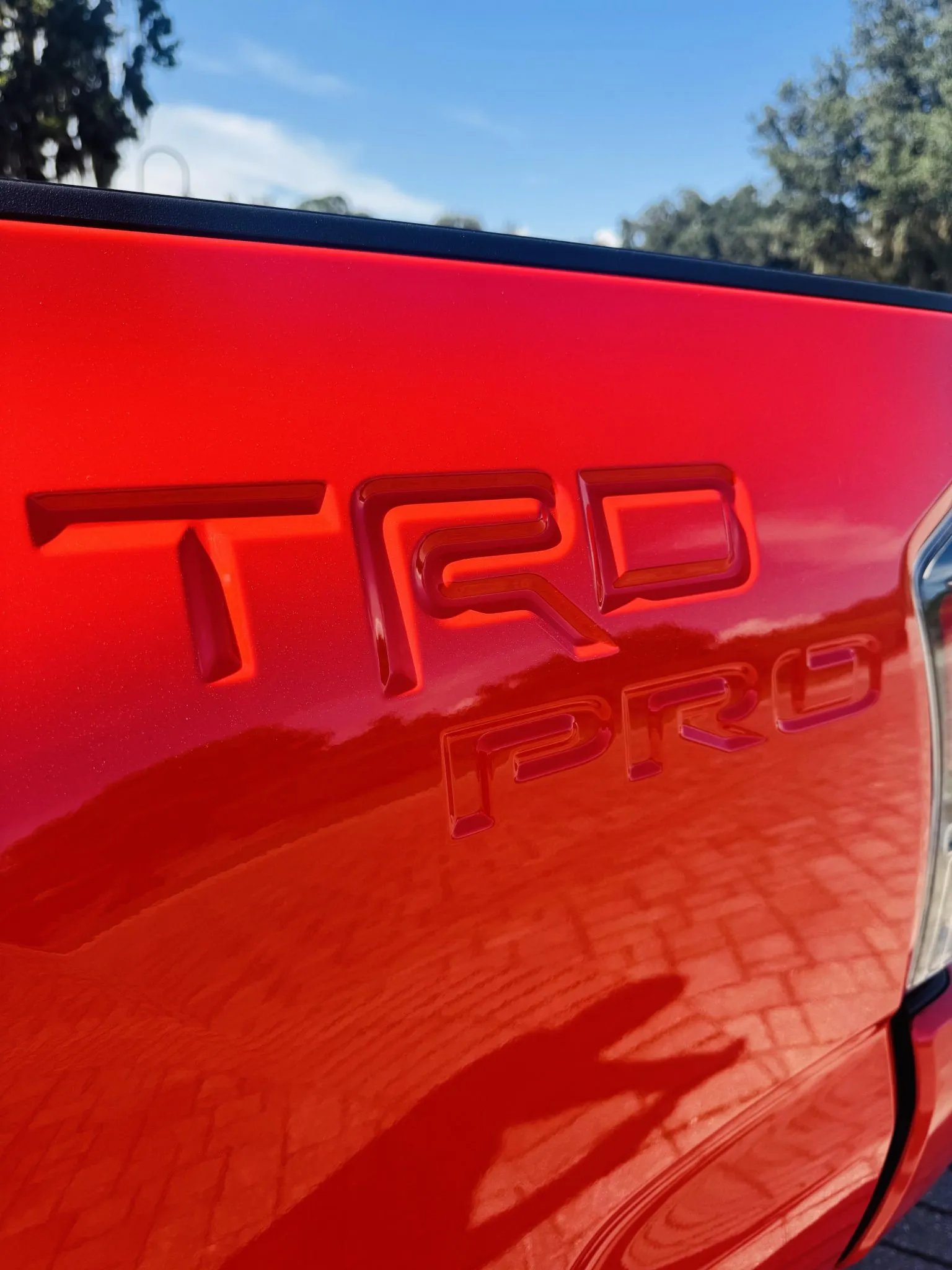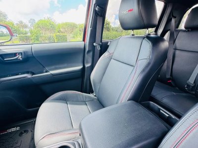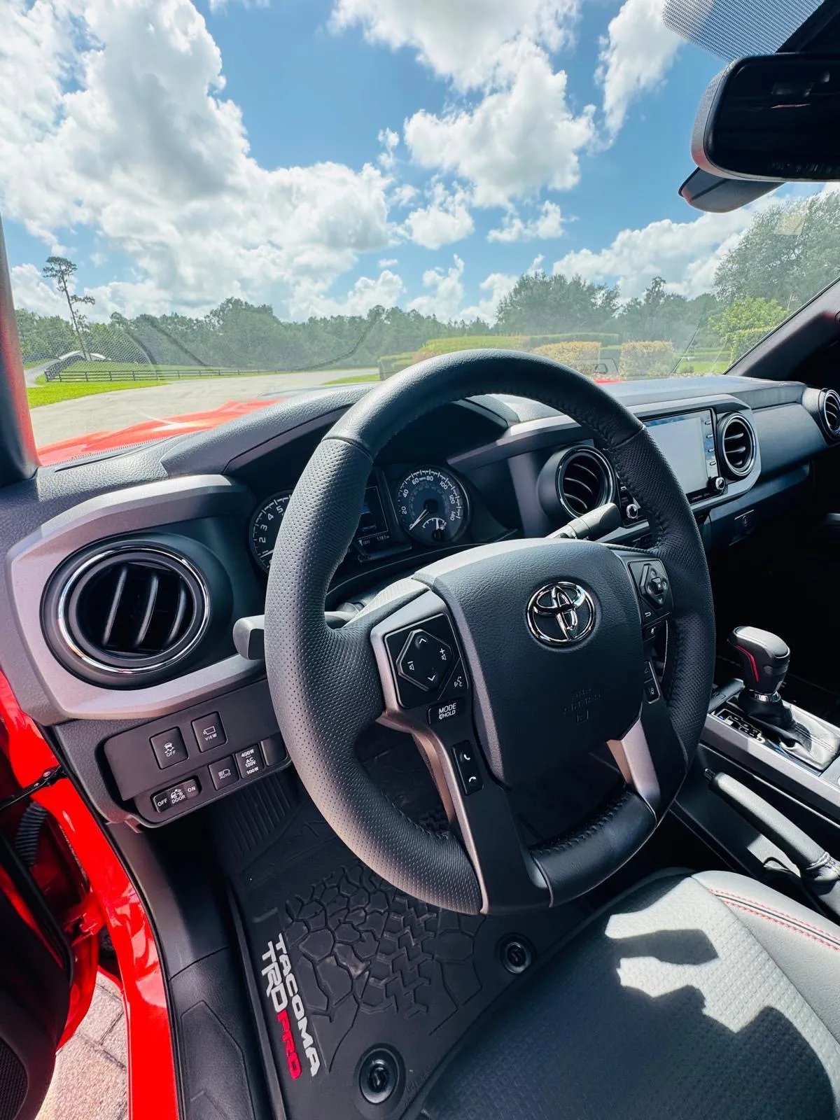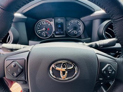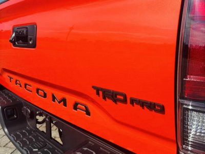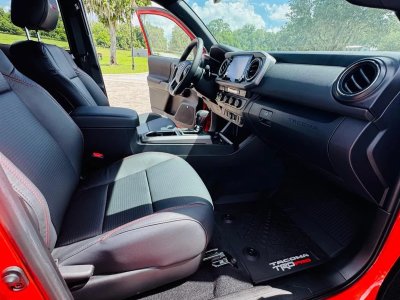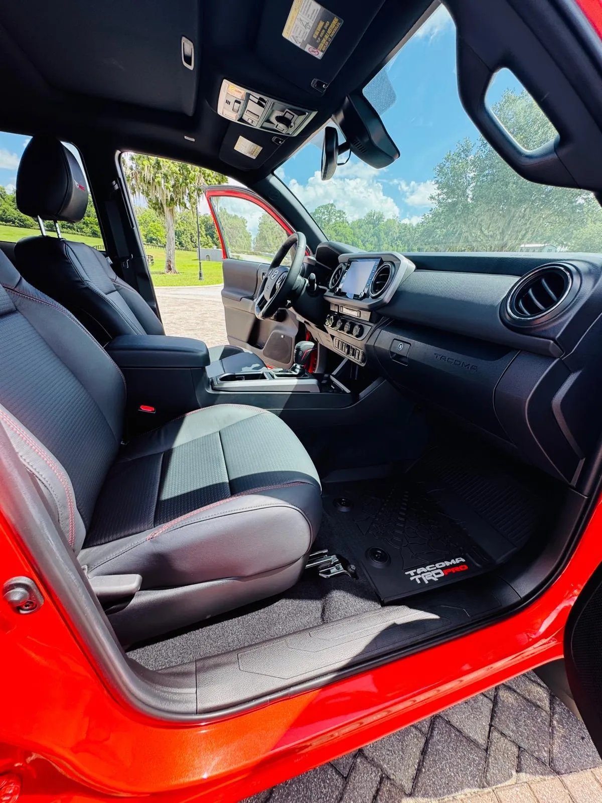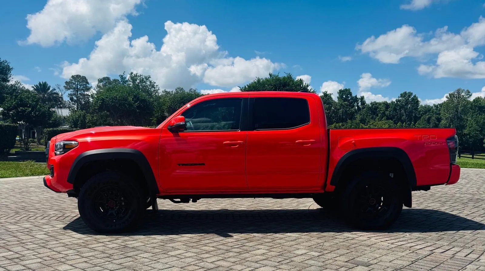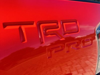 The 16″ TRD Pro black alloy wheels are mounted with Goodyear Wrangler tires. Braking is handled by power-assisted ventilated front discs and rear drums. The truck came equipped from the factory with an off-road-tuned suspension that utilizes 2.5″ Fox internal bypass shocks as well as Crawl Control and Multi-Terrain Select. The cabin is upholstered in black leather, and amenities include an 8″ touchscreen infotainment system, a power-adjustable driver’s seat, heated front seats, Pre-Collison Assist, Lane Departure Alert, air conditioning, Dynamic Radar cruise control, and power windows, mirrors, and locks.