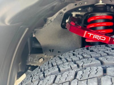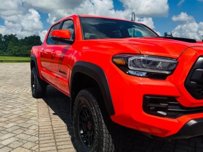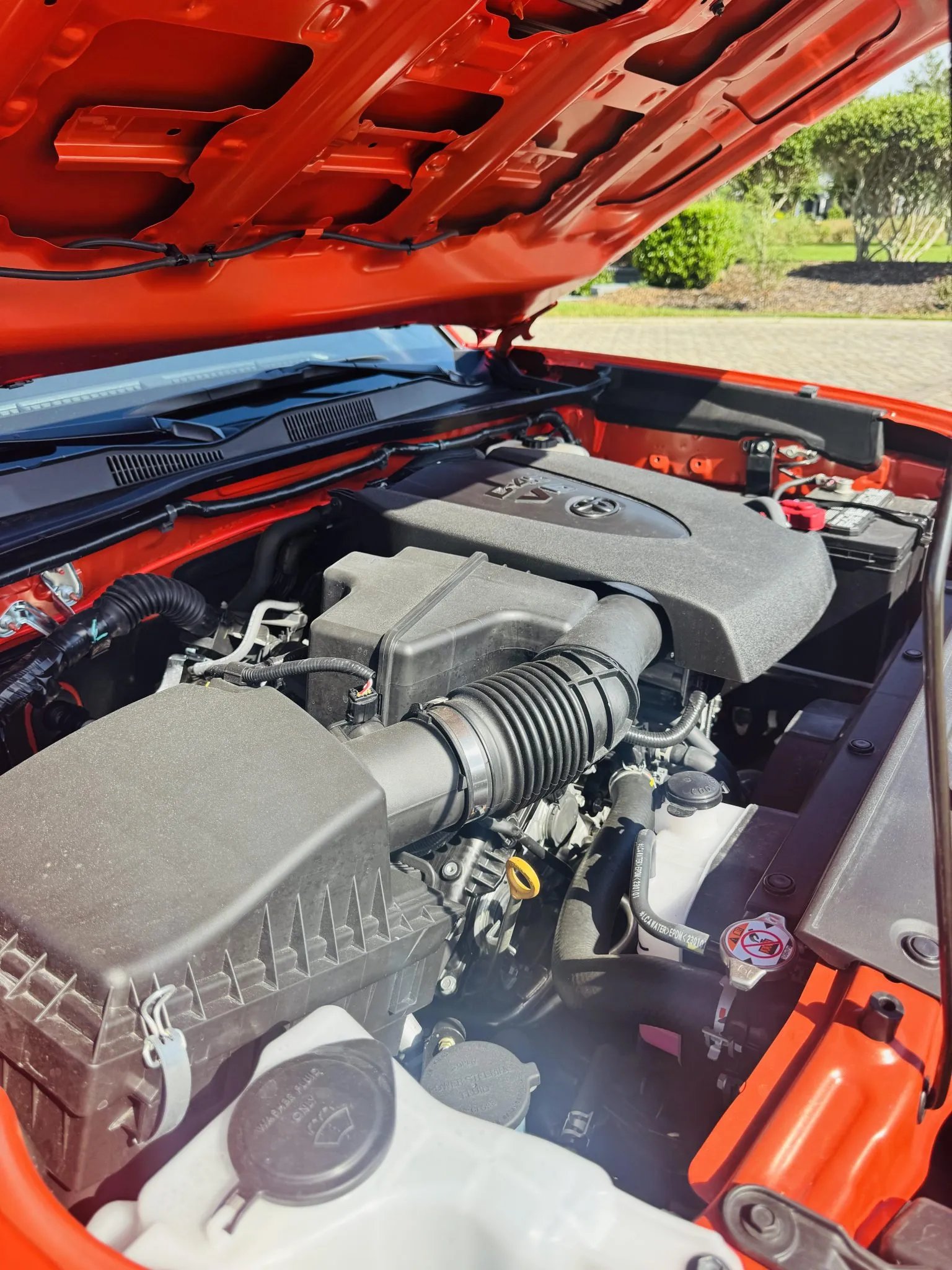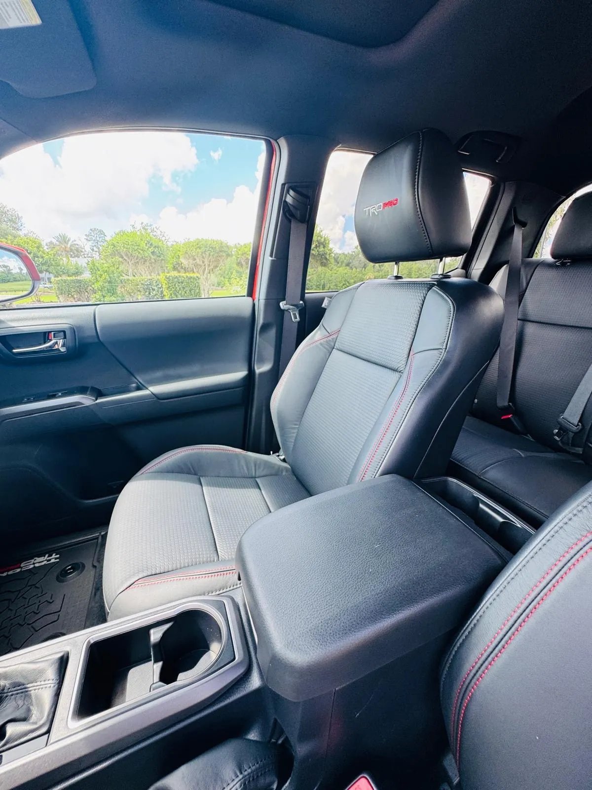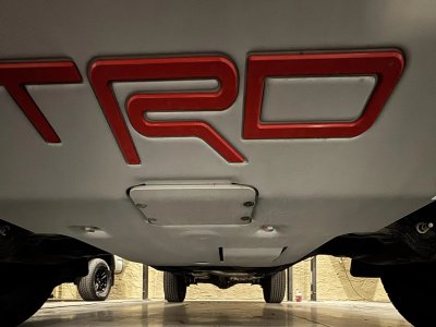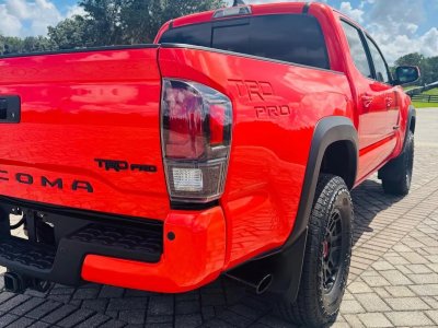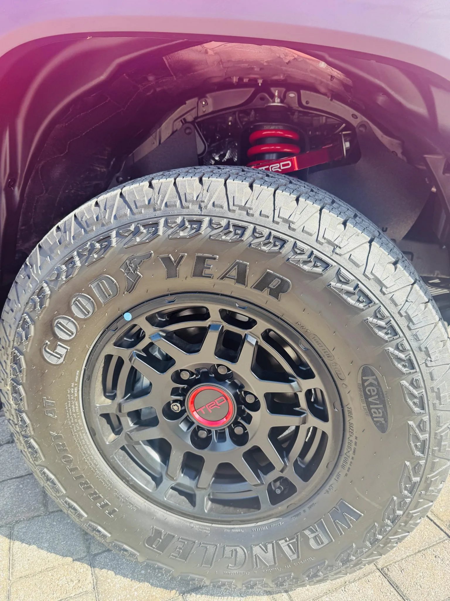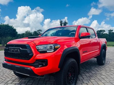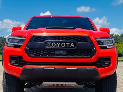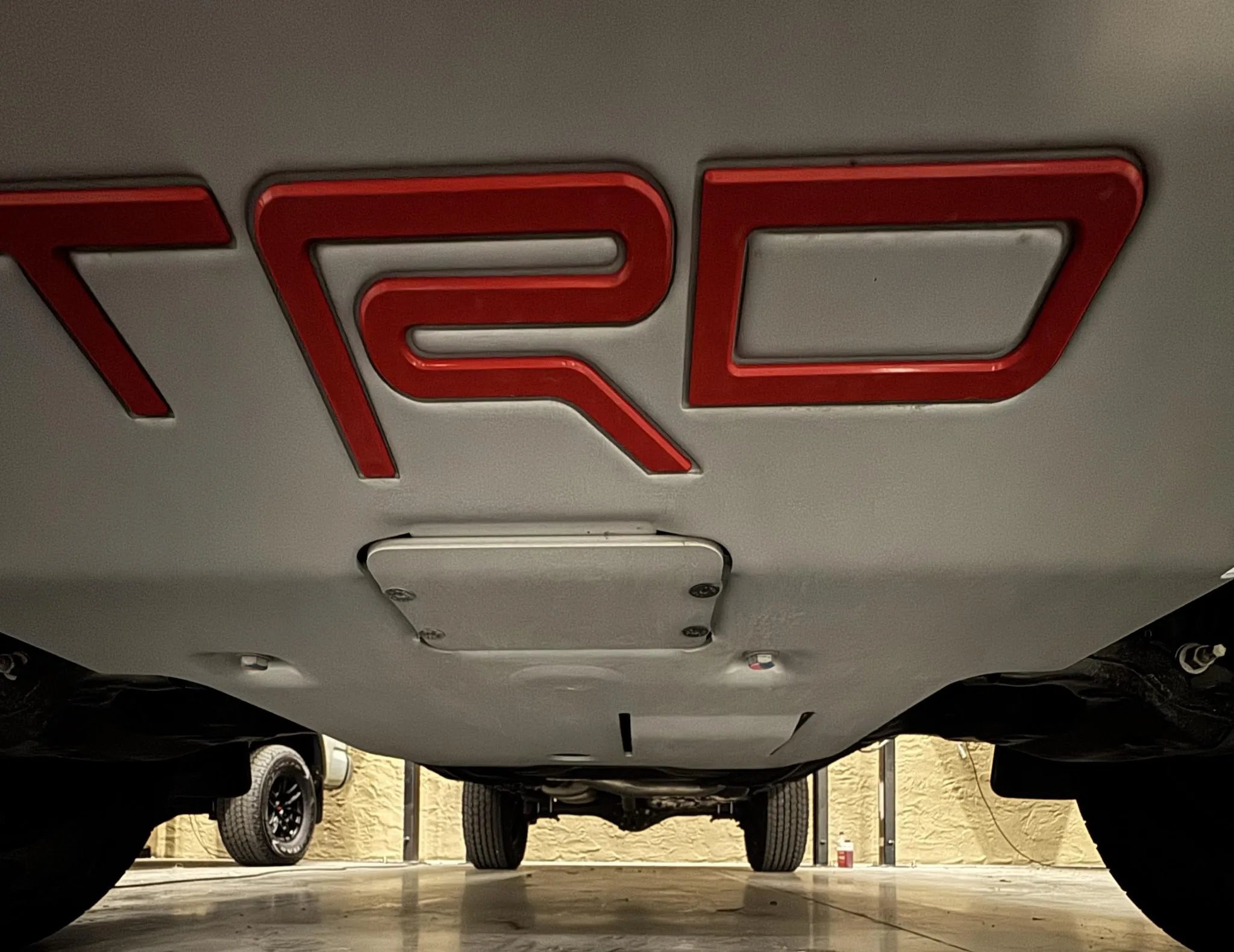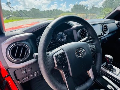 The 16″ TRD Pro black alloy wheels are mounted with Goodyear Wrangler tires. Braking is handled by power-assisted ventilated front discs and rear drums. The truck came equipped from the factory with an off-road-tuned suspension that utilizes 2.5″ Fox internal bypass shocks as well as Crawl Control and Multi-Terrain Select. The cabin is upholstered in black leather, and amenities include an 8″ touchscreen infotainment system, a power-adjustable driver’s seat, heated front seats, Pre-Collison Assist, Lane Departure Alert, air conditioning, Dynamic Radar cruise control, and power windows, mirrors, and locks.