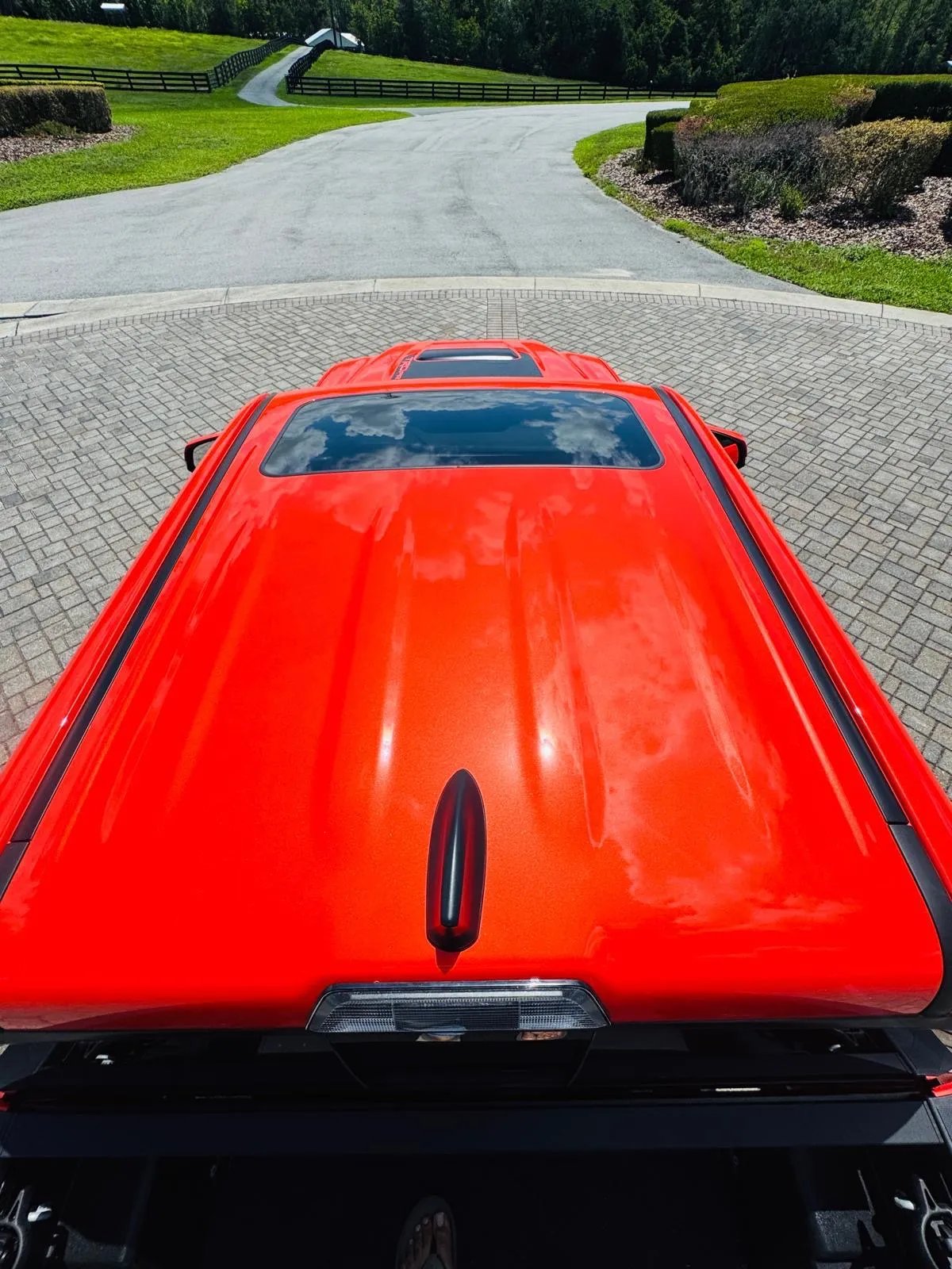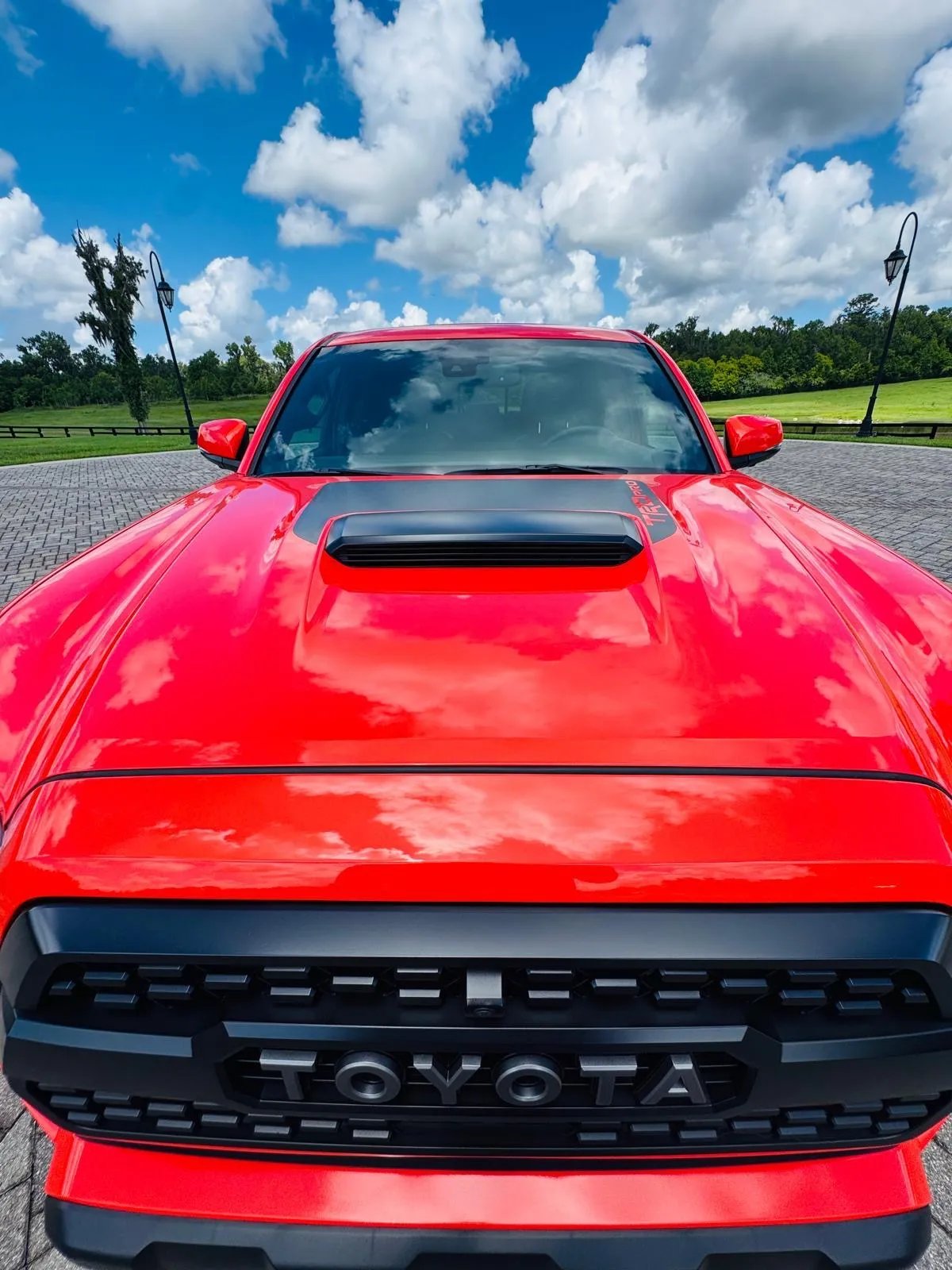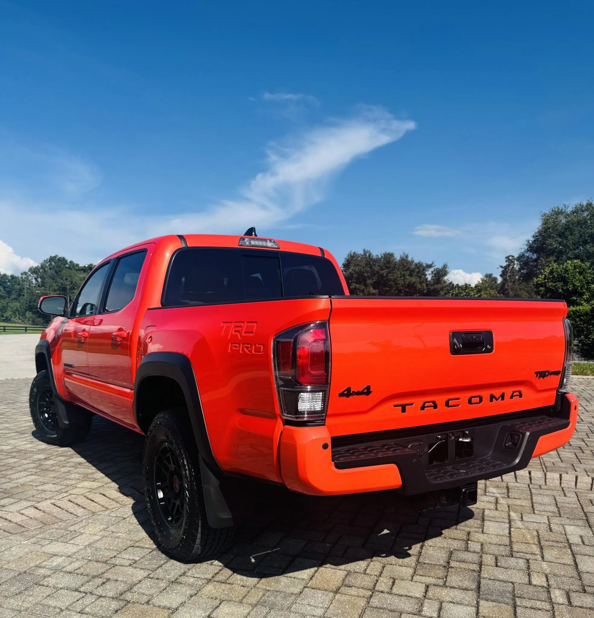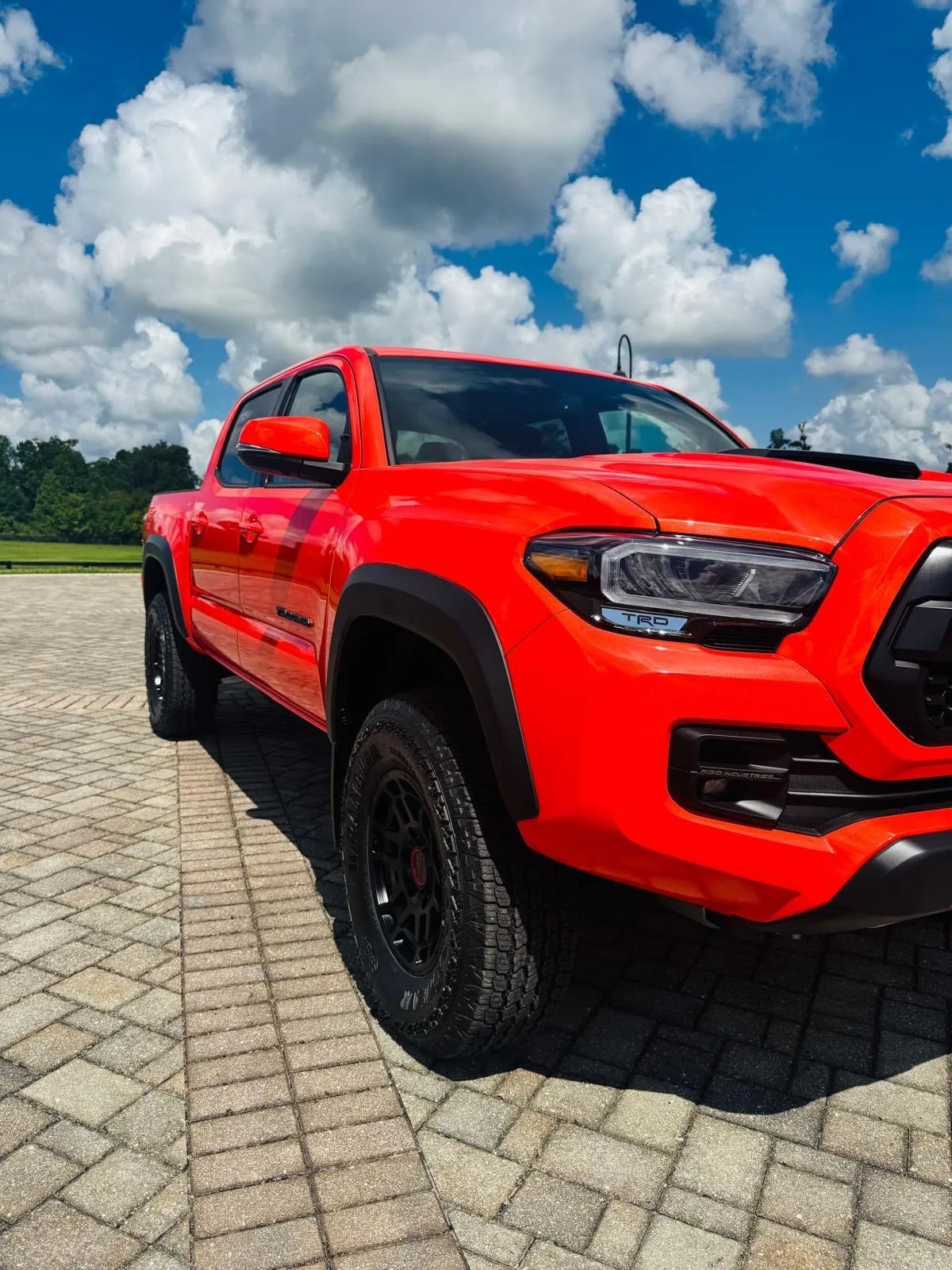 This 2023 Toyota Tacoma TRD Pro 4×4 is a double-cab pickup that was delivered new to Toyota of Laramie, Wyoming, and has 1,200 miles. The truck is finished in Solar Octane over black leather and is powered by a 3.5-liter V6 linked with a six-speed automatic transmission and a dual-range transfer case. Features include a locking rear differential, 16″ TRD Pro black alloy wheels, a sunroof, a bedliner, a power-adjustable driver’s seat, heated front seats, air conditioning, cruise control, and power windows and locks. The truck is finished in Solar Octane and features a sunroof, a bedliner, LED headlights, LED daytime running lights, tie-down hooks, mudguards, and a sliding rear window.