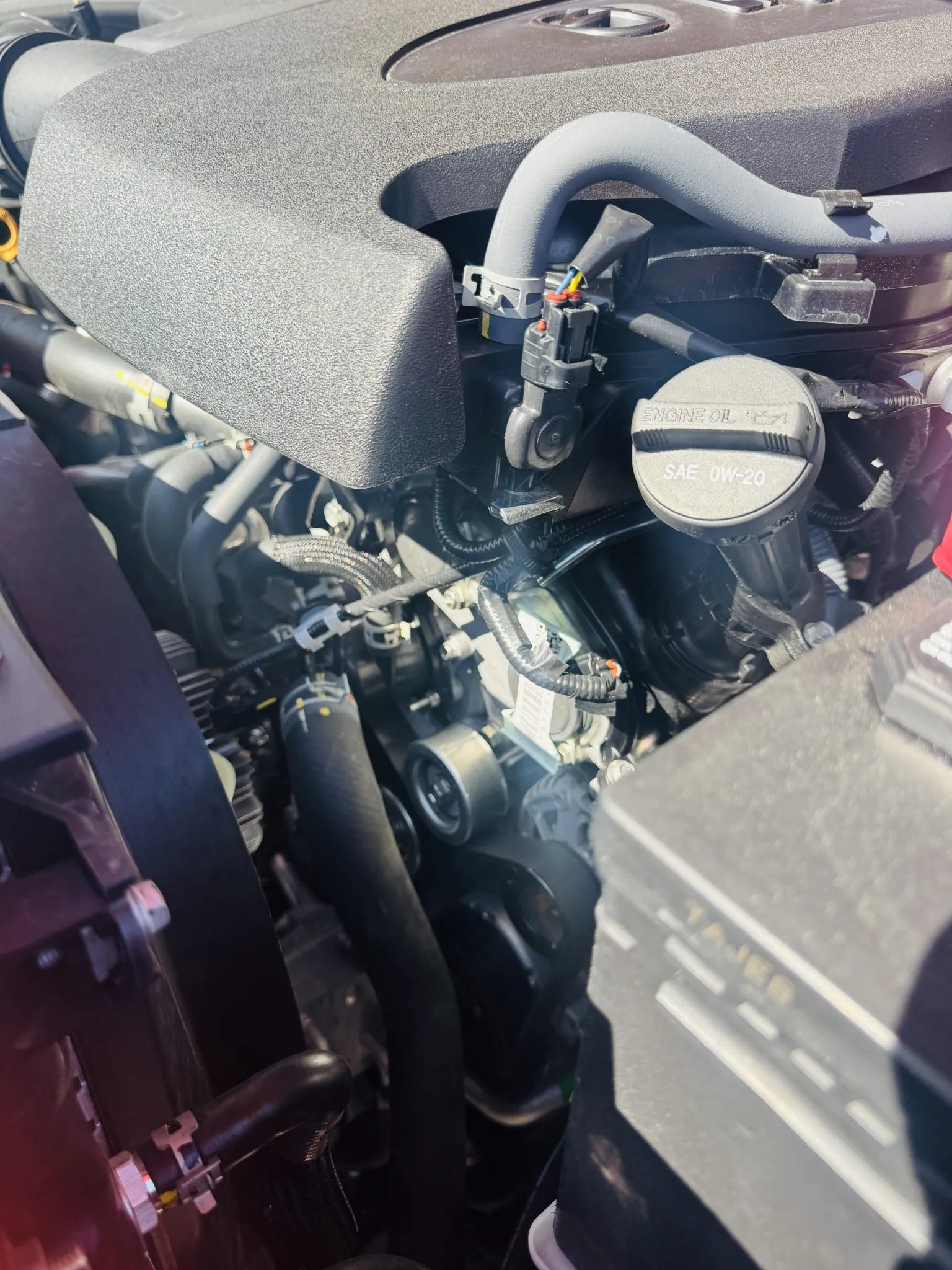 The multifunction steering wheel frames a central digital display, a 140-mph speedometer, and a tachometer with a 6k-rpm redline as well as gauges for coolant temperature and fuel level. The digital odometer indicates 1,200 miles. The 3.5-liter DOHC V6 was factory rated at 278 horsepower and 265 lb-ft of torque. Power is sent to the rear or all four wheels via a six-speed automatic transmission and a dual-range transfer case. The truck came factory equipped with a locking rear differential. A recall related to axle shaft separation was completed in 2024.